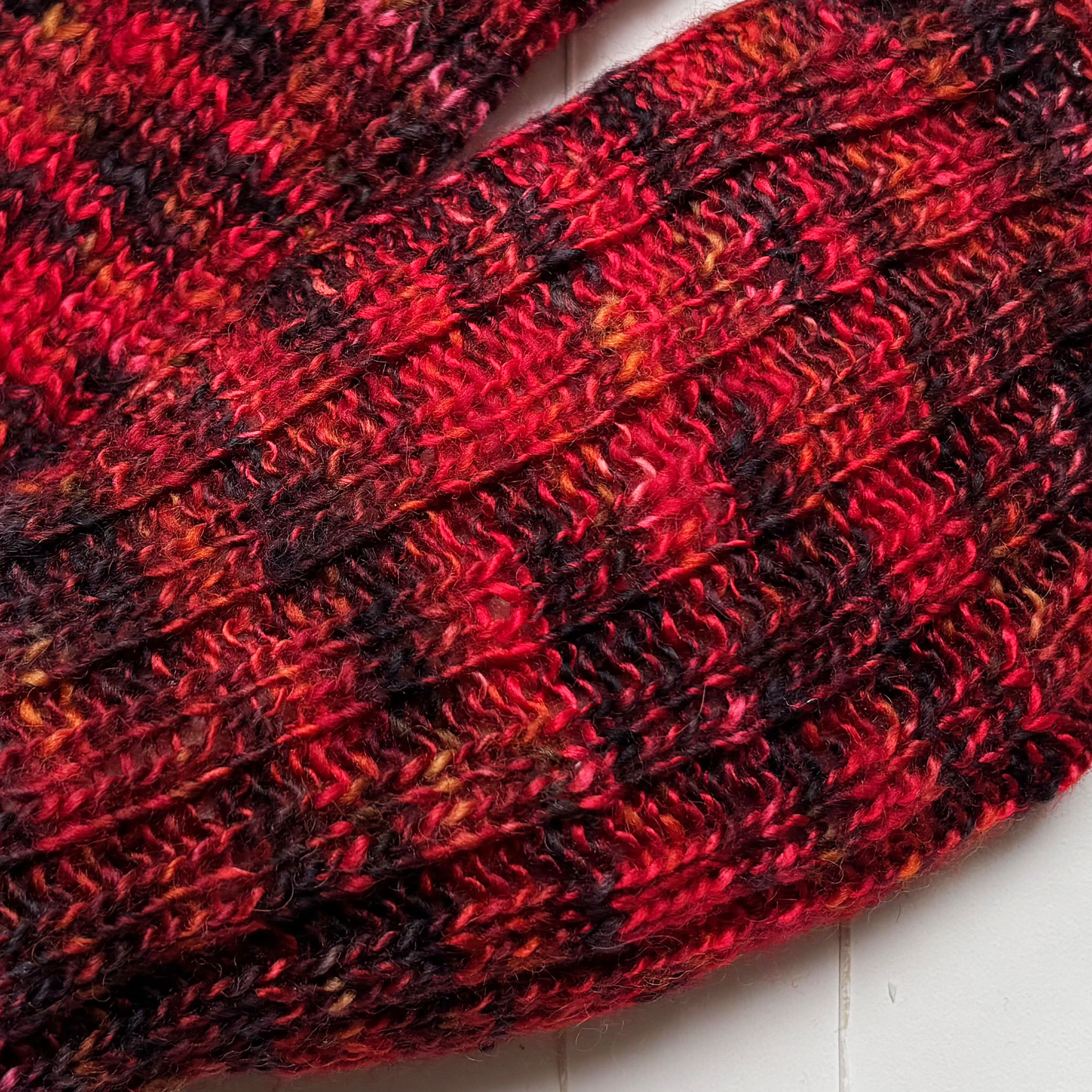 Leichte Armstulpen mit Daumenloch in Schwarz und leuchtenden Rottönen.