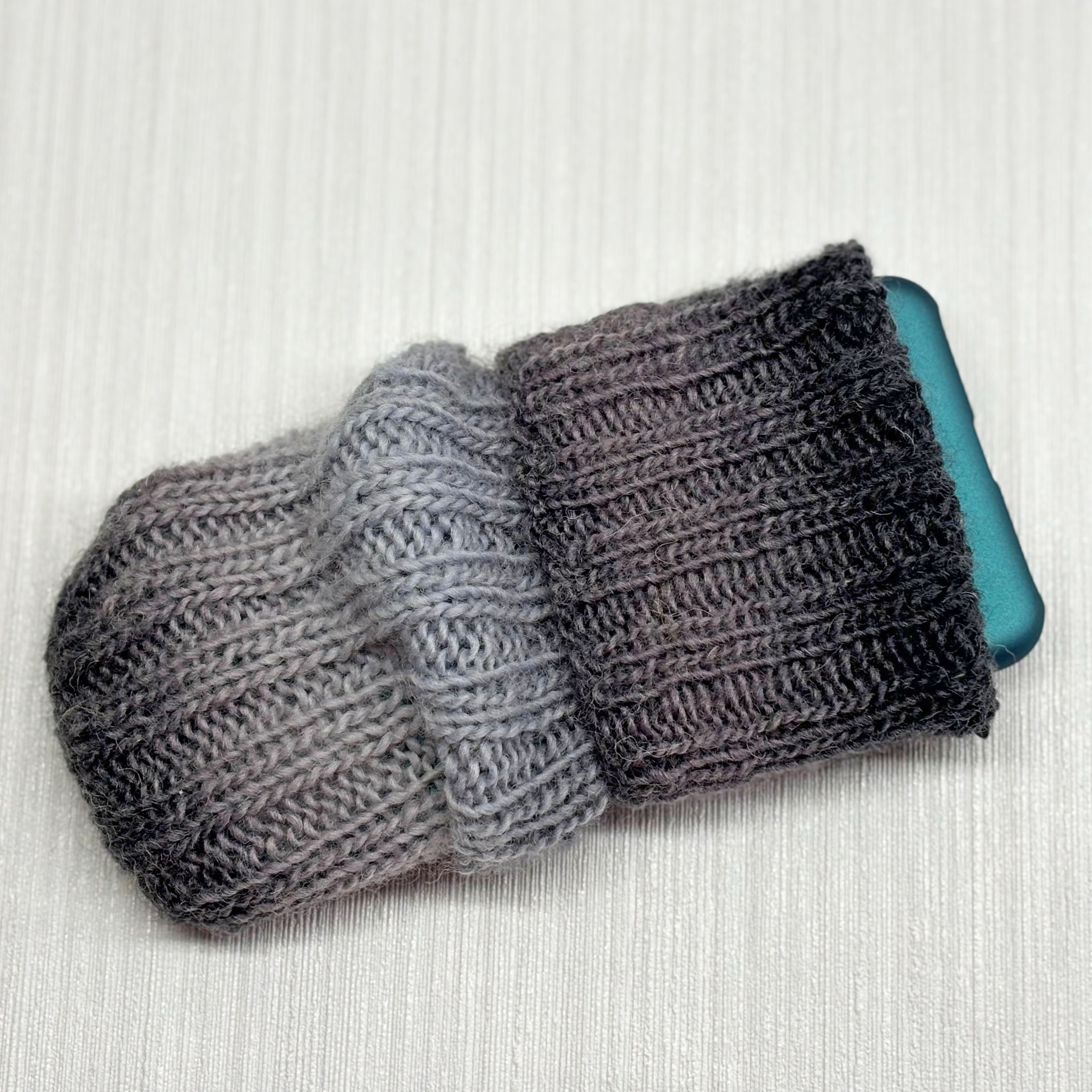 - Handysocke aus dünnem Garn in Rippenmuster handgestrickt