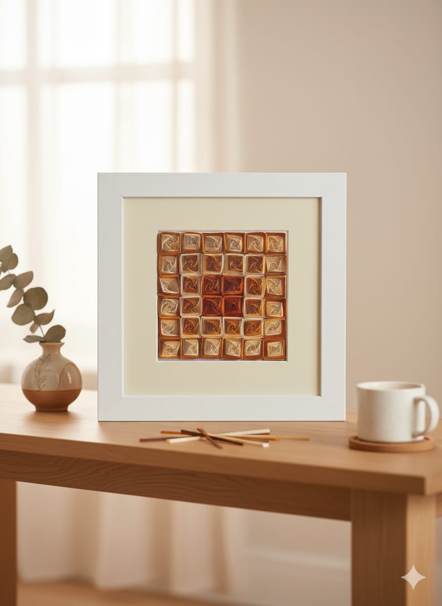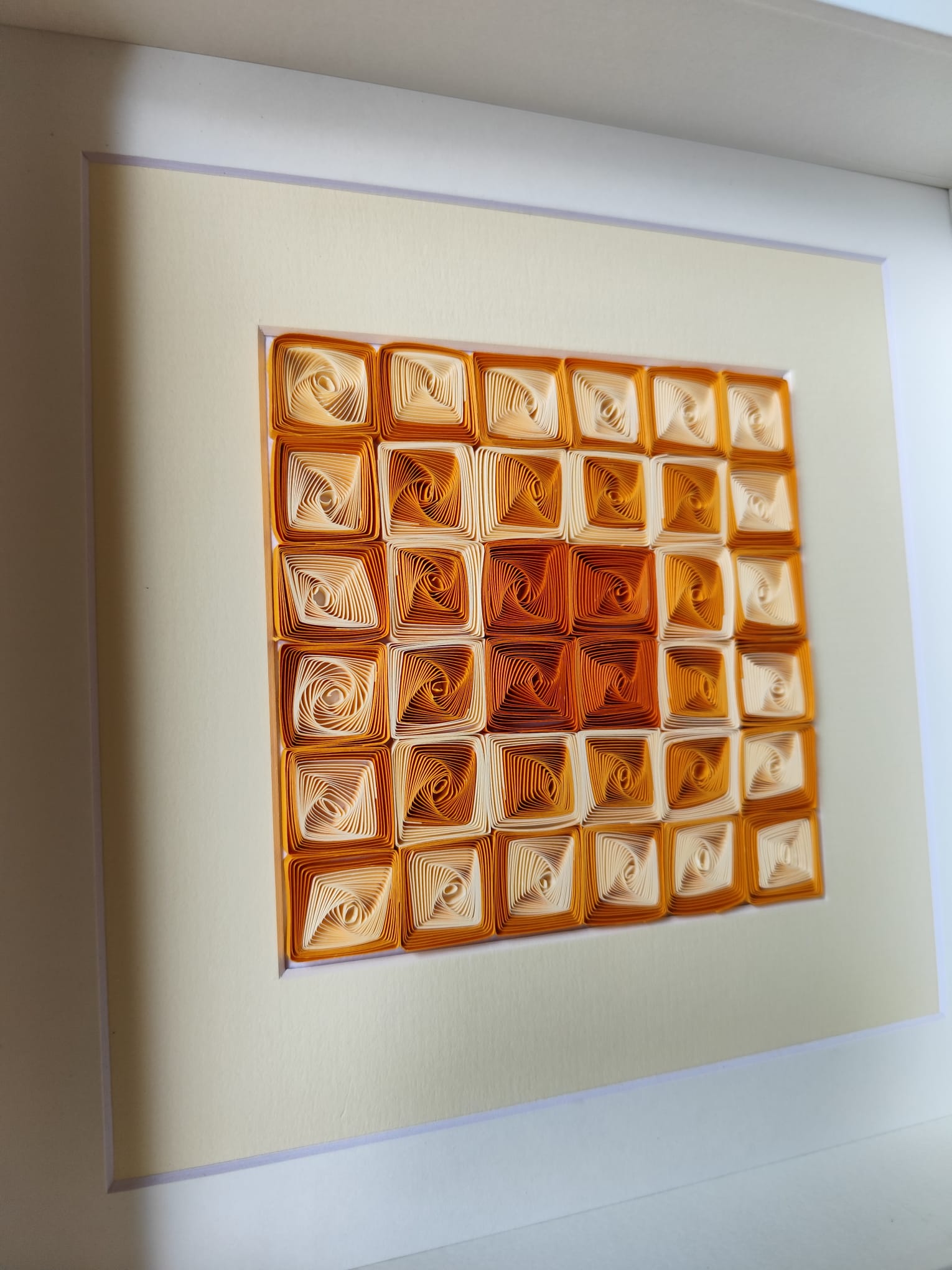 Es besteht aus quadratischen, filigran gerollten und geformten Elementen, die in einem harmonischen Fabspiel aus Erdtönen angeordnet sind.