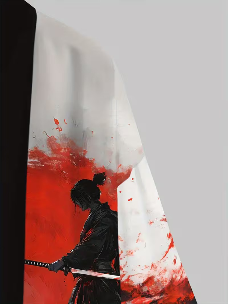 Mit dem großformatigem Motiv werden Sie viele Blicke auf sich ziehen. Die mit Elasthan veredelte Kunstfaser vermittelt ein angenehmes Tragegefühl und drückt Eleganz aus. Er ist nach altem japanischem Traditionsstil gestaltet mit Samurai-Motiv.