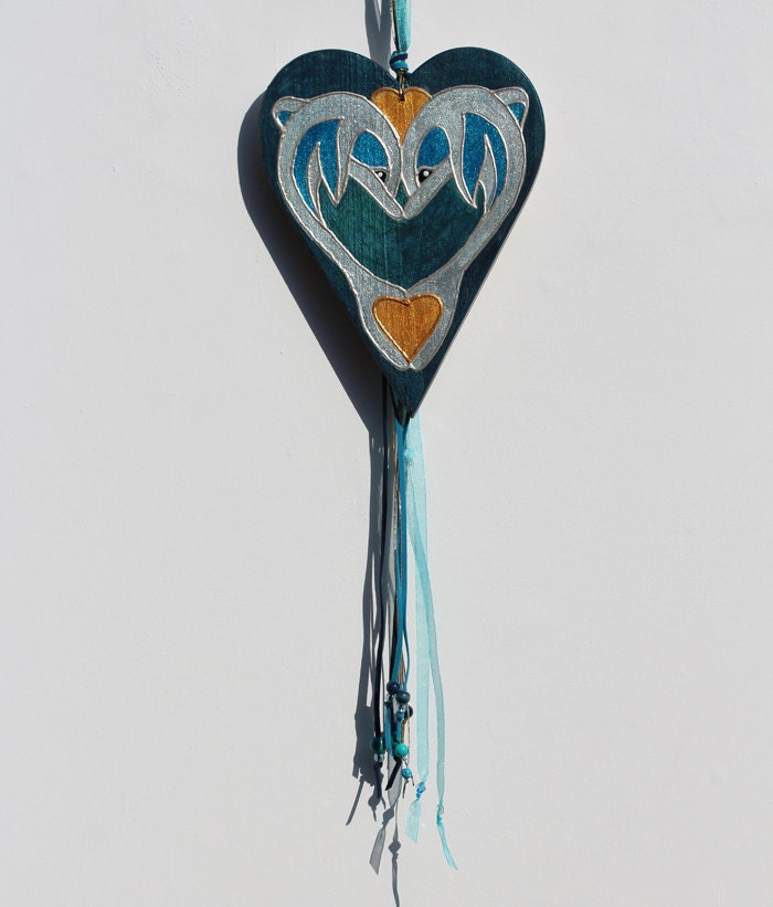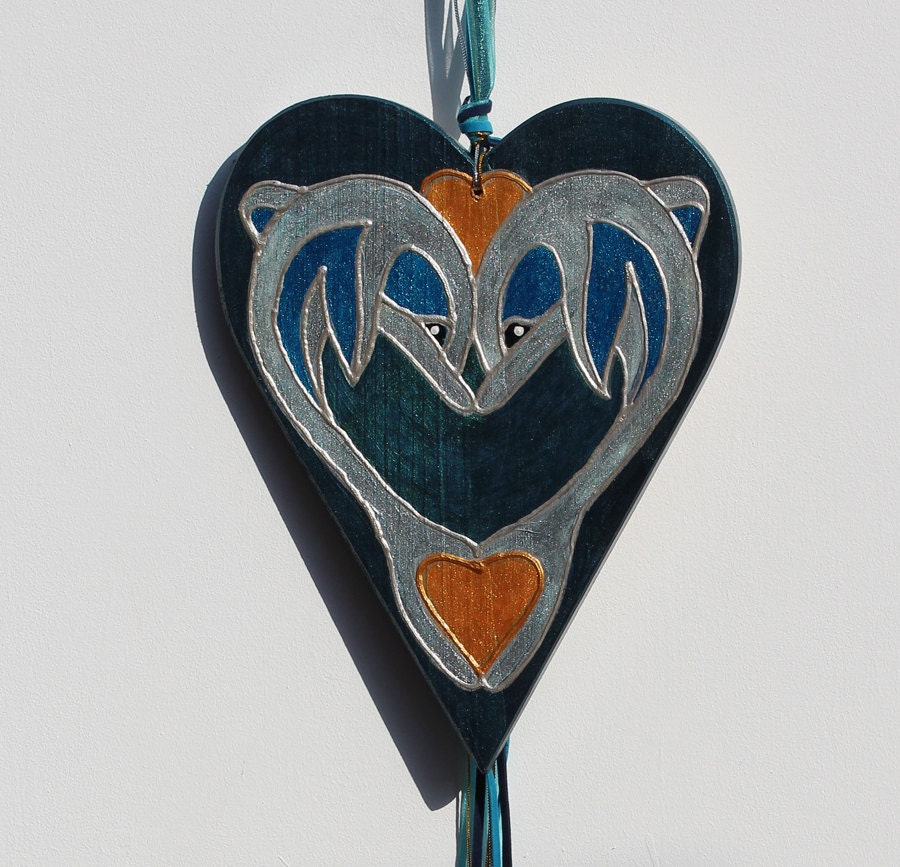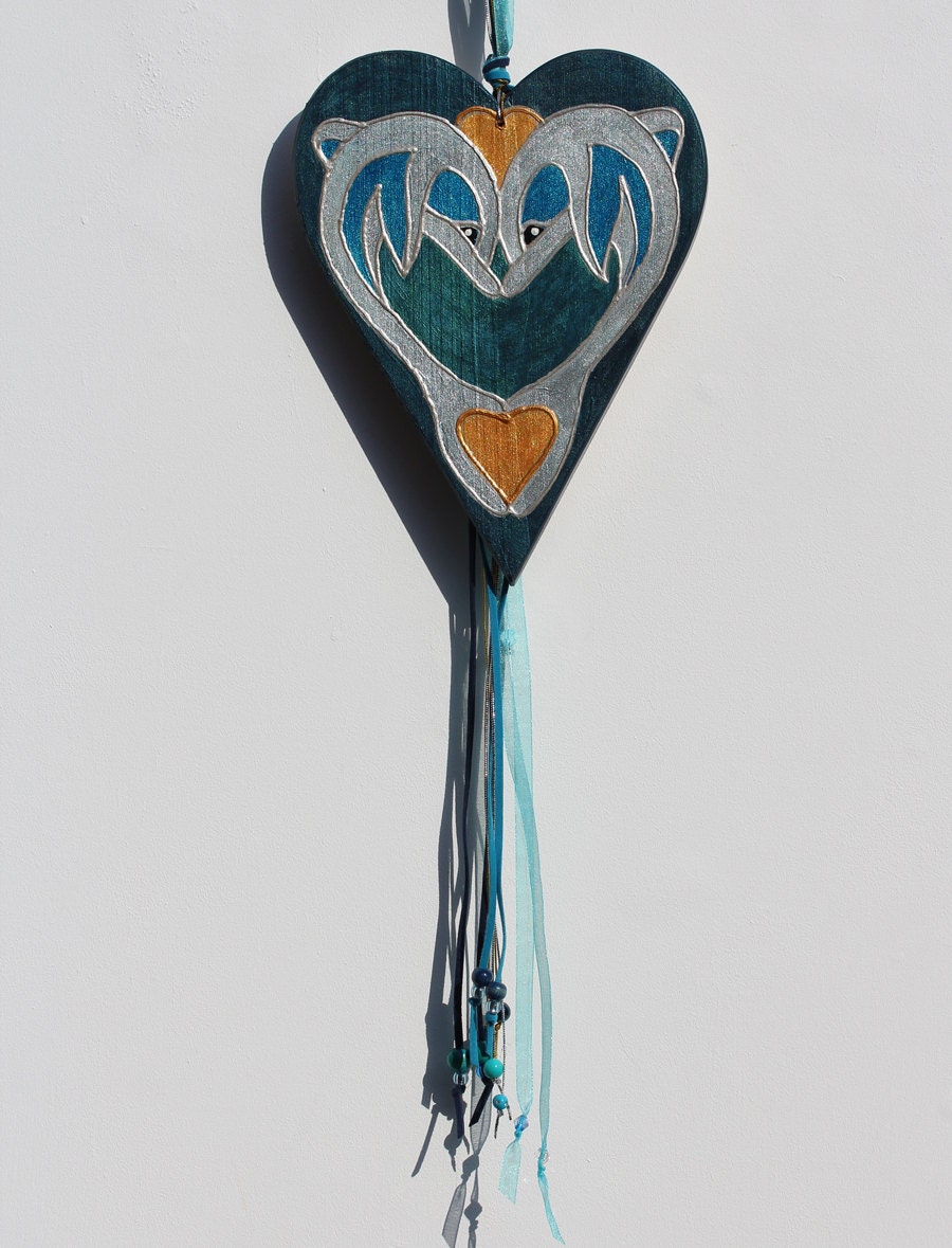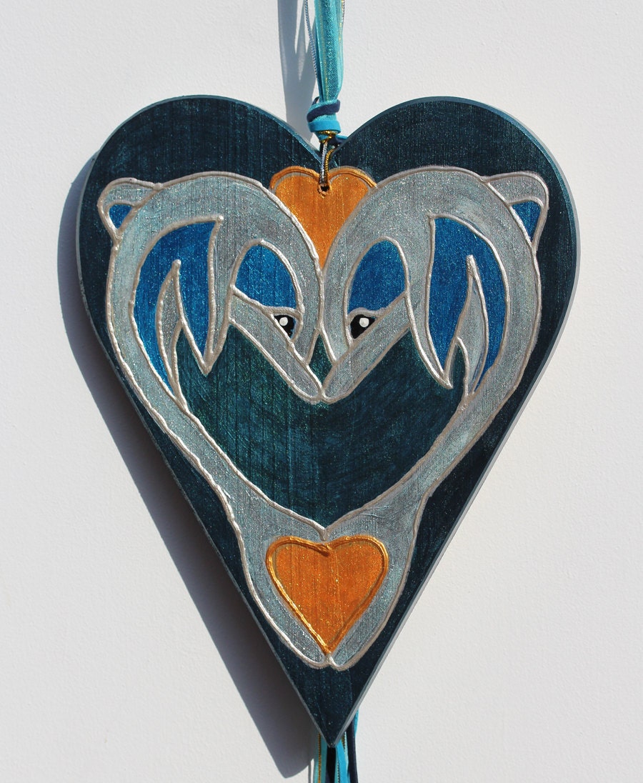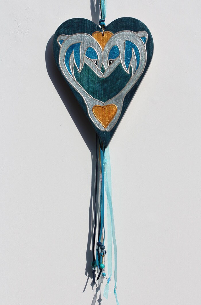 Dieses von Hand mit dem wunderschönen Motiv 'Dolphin Love' bemalte und liebevoll dekorierte Herz ist ein schmuckes Kleinod für Flur und Diele in sanft schimmernden Farben des Meeres.