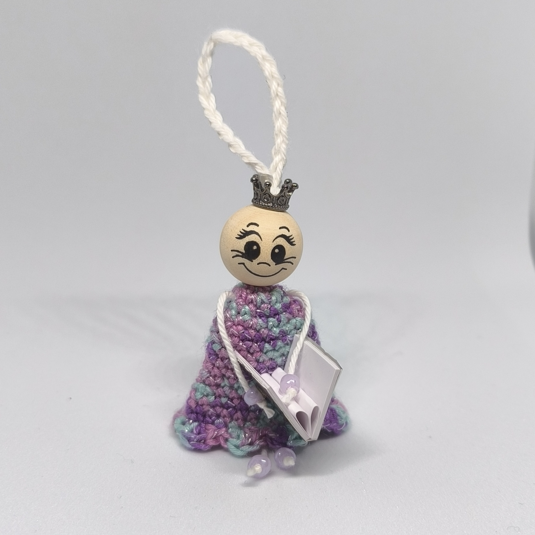 Das Kleid schimmert in einem zarten Farbverlauf aus Lila, Rosa und Türkis mit Glitzer – wie ein Traum, der sich entfaltet. Die lila Perlenhände und -füße greifen das erste Farbtöne sanft auf. Die dunkle Krone auf ihrem Kopf verleiht ihr eine stille Würde – die Würde einer Frau, die weiß, dass Bücher Königreiche öffnen.