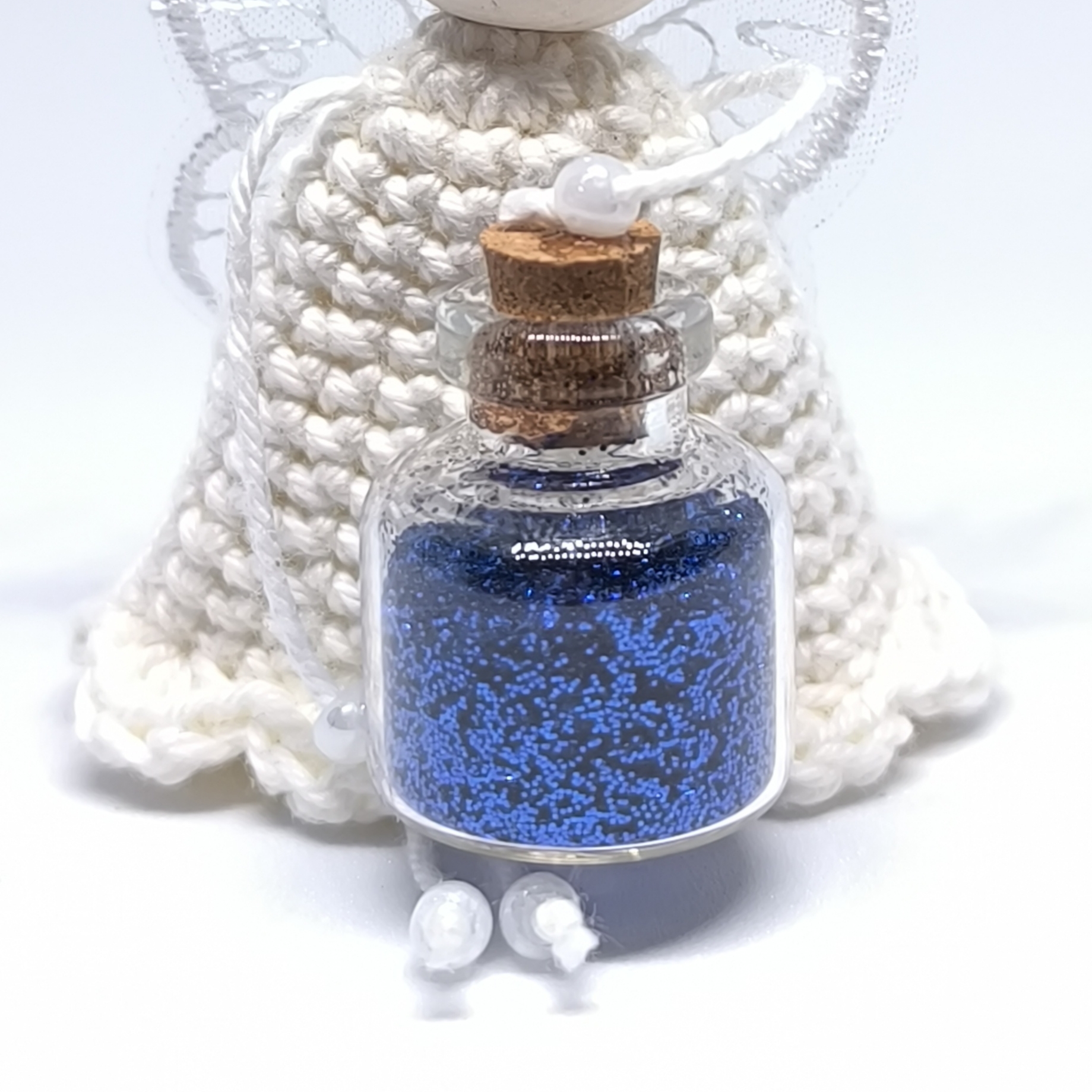 Das weiße gehäkelte Kleid, die weißen Perlenhände und -füße und die zarten weißen Flügel strahlen Reinheit und Schutz aus. Die silberne Krone krönt eine stille Hüterin – sanft, schützend und voller Zuversicht.