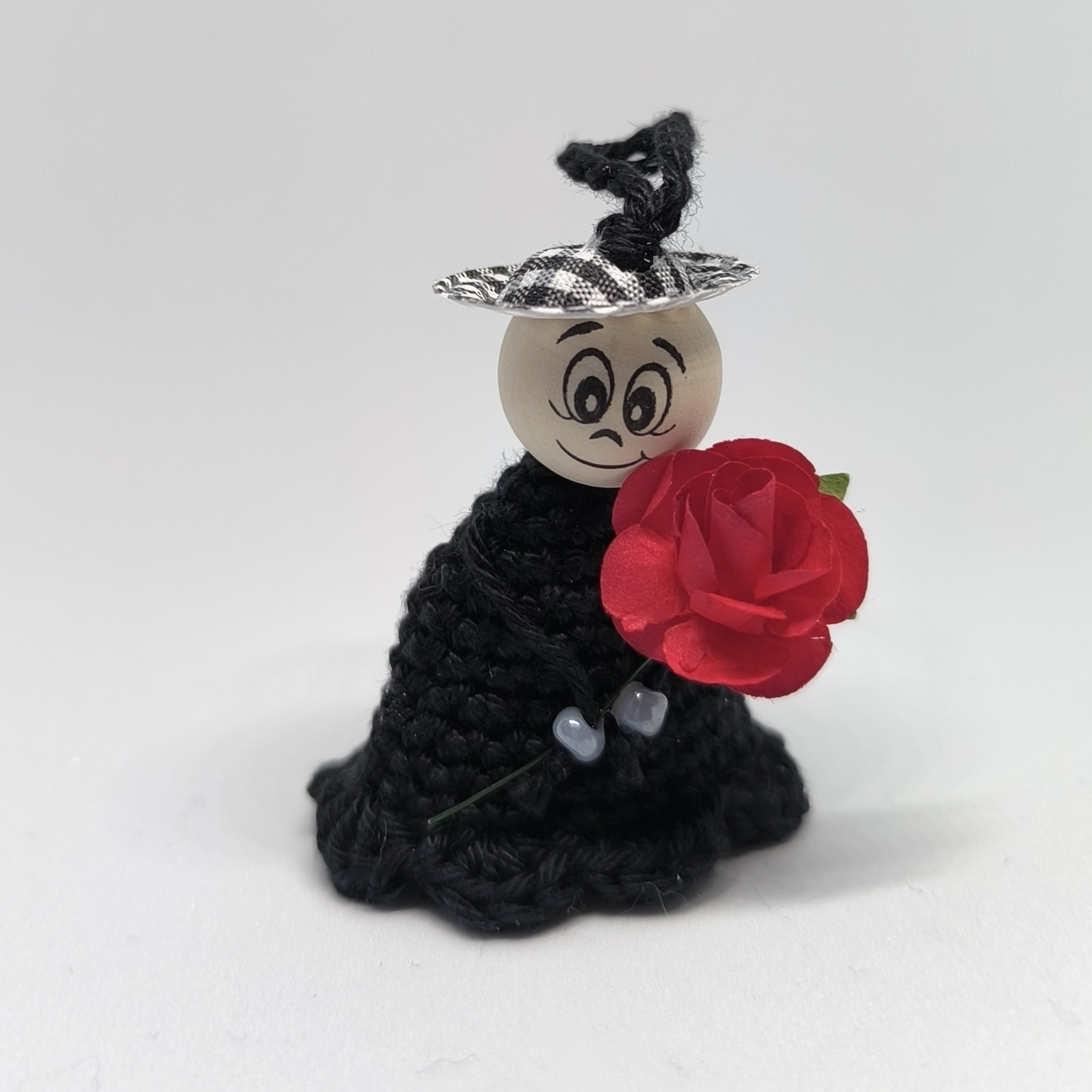 Diese Herzensfigur trägt ein schwarzes Kleid und einen schwarz-weiß karierten Hut – ein ausdrucksstarker Kontrast mit moderner Note.