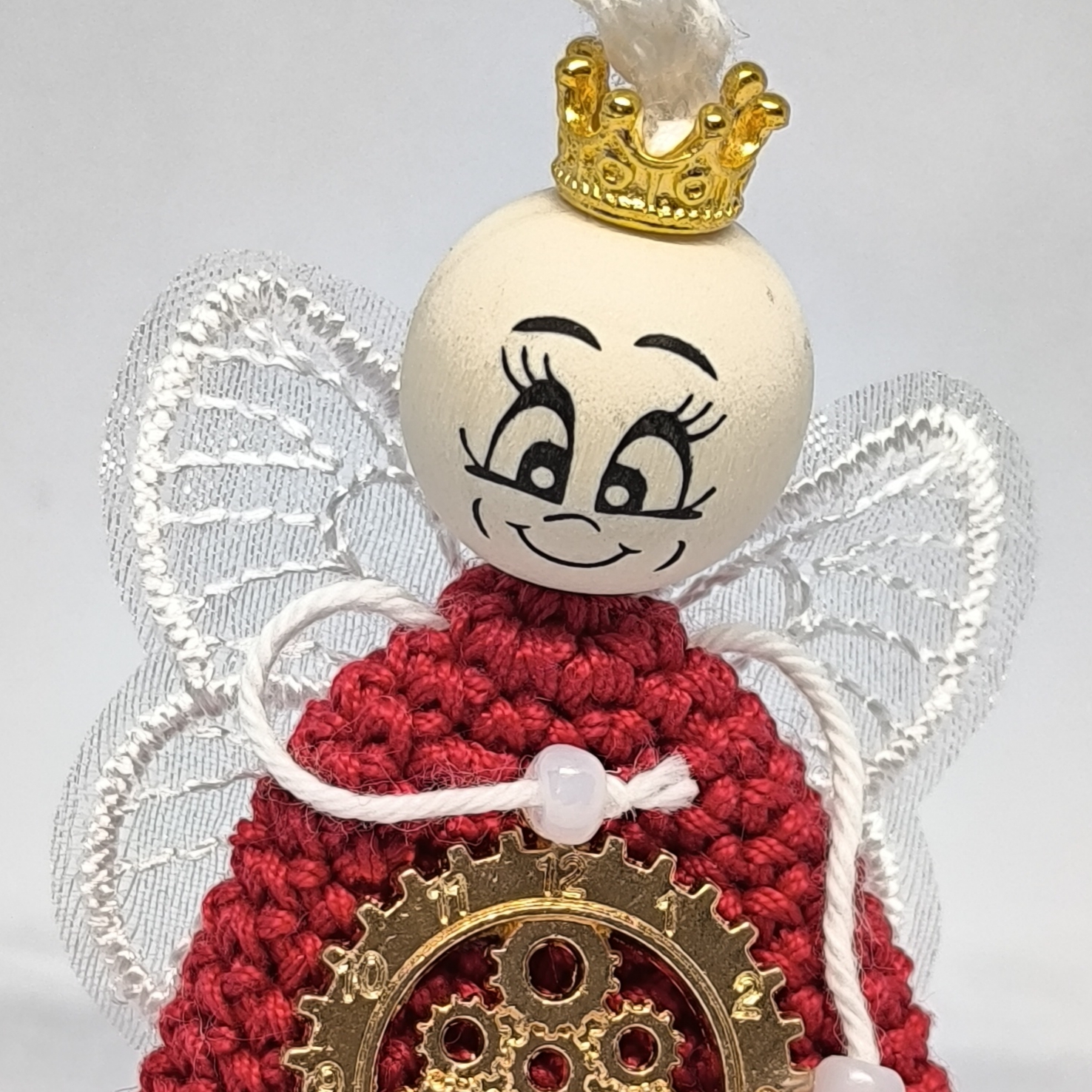 Das rote gehäkelte Kleid strahlt Leidenschaft und Kraft aus. Die weißen Perlenhände und -füße und die zarten weißen Flügel setzen einen eleganten, himmlischen Kontrast. Die goldene Krone krönt eine Figur, die über den Dingen steht – ruhig, geheimnisvoll und voller Bedeutung.