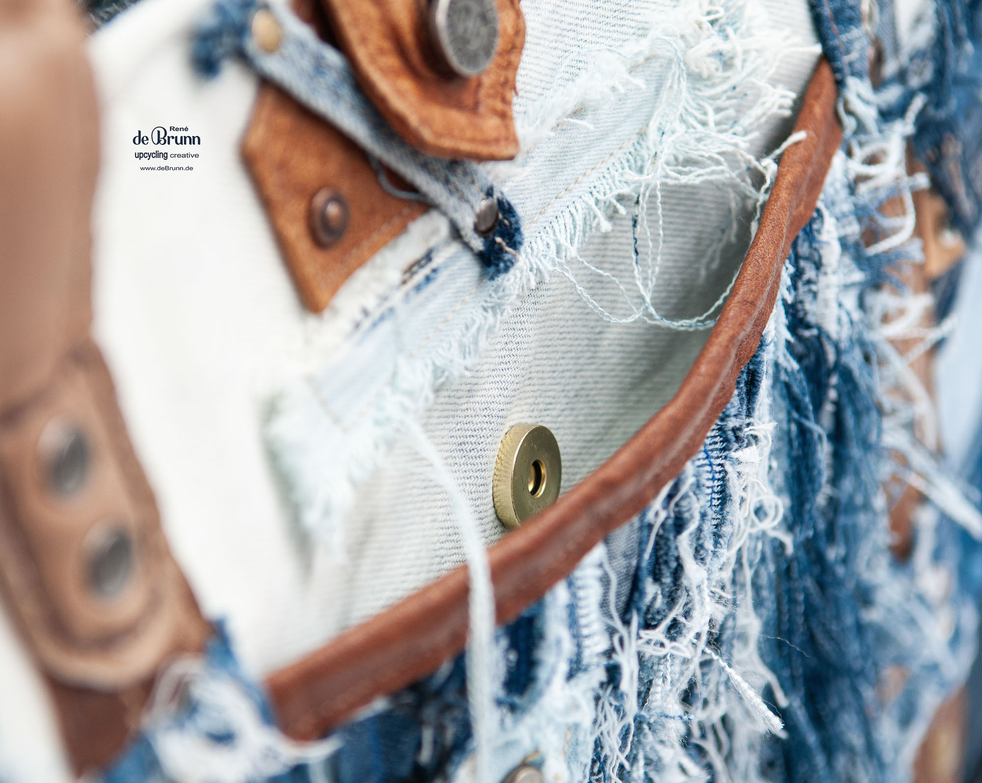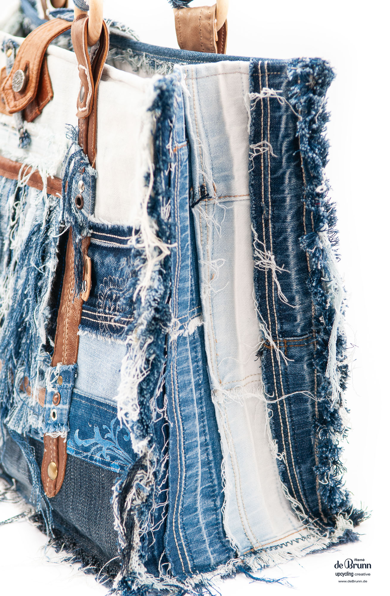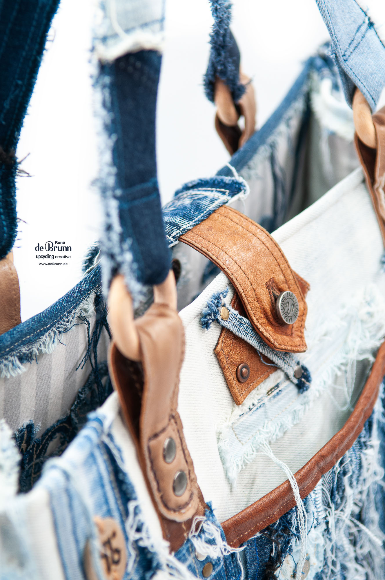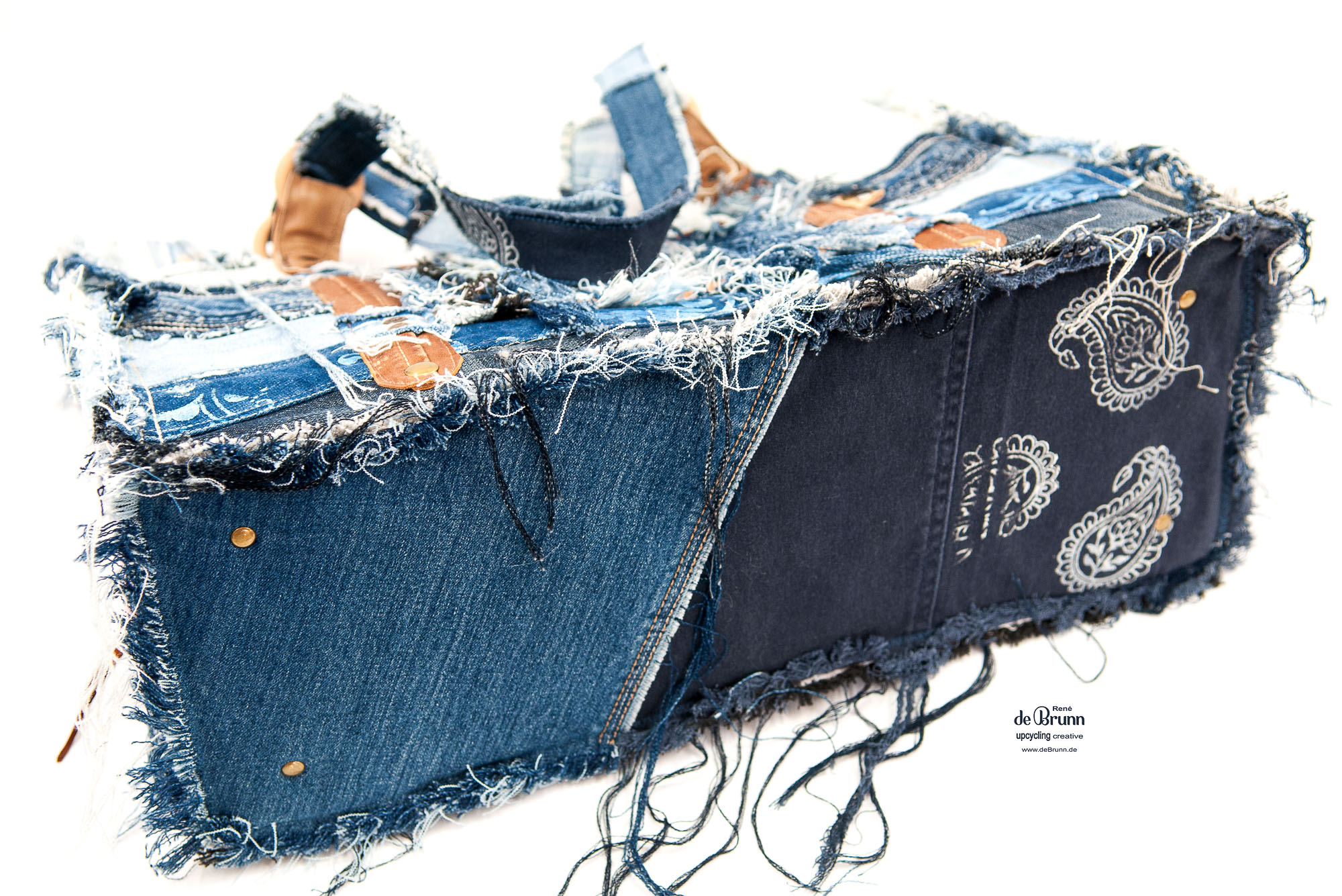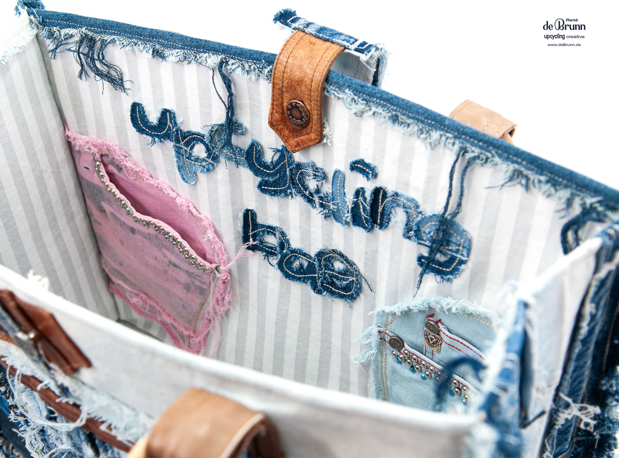 Selbst der Innenraum dieses Unikats ist in einem besonderen Design gefertigt - eine wahre Freude also auch bei jedem Hineinsehen. Abgesehen vom Highclass-Hingucker machen drei Aussen- und vier Innentaschen diesen Jeans-Shopper zum funktionellen täglichen Begleiter.