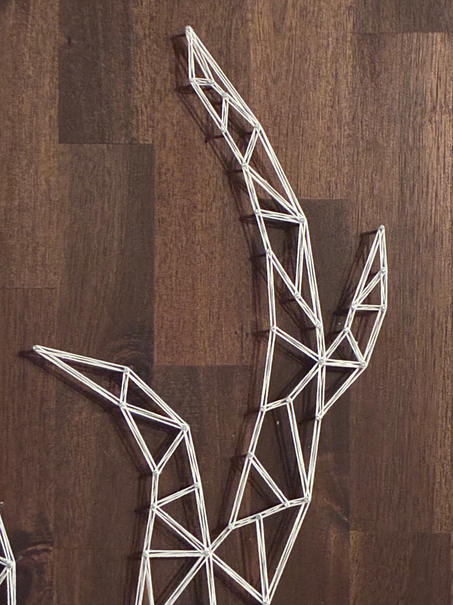 Dieses handgefertigte Wandbild im Format 80 × 60 cm zeigt ein geometrisches Hirschmotiv, das aus weißer Schnur auf einer Holzplatte gespannt ist.