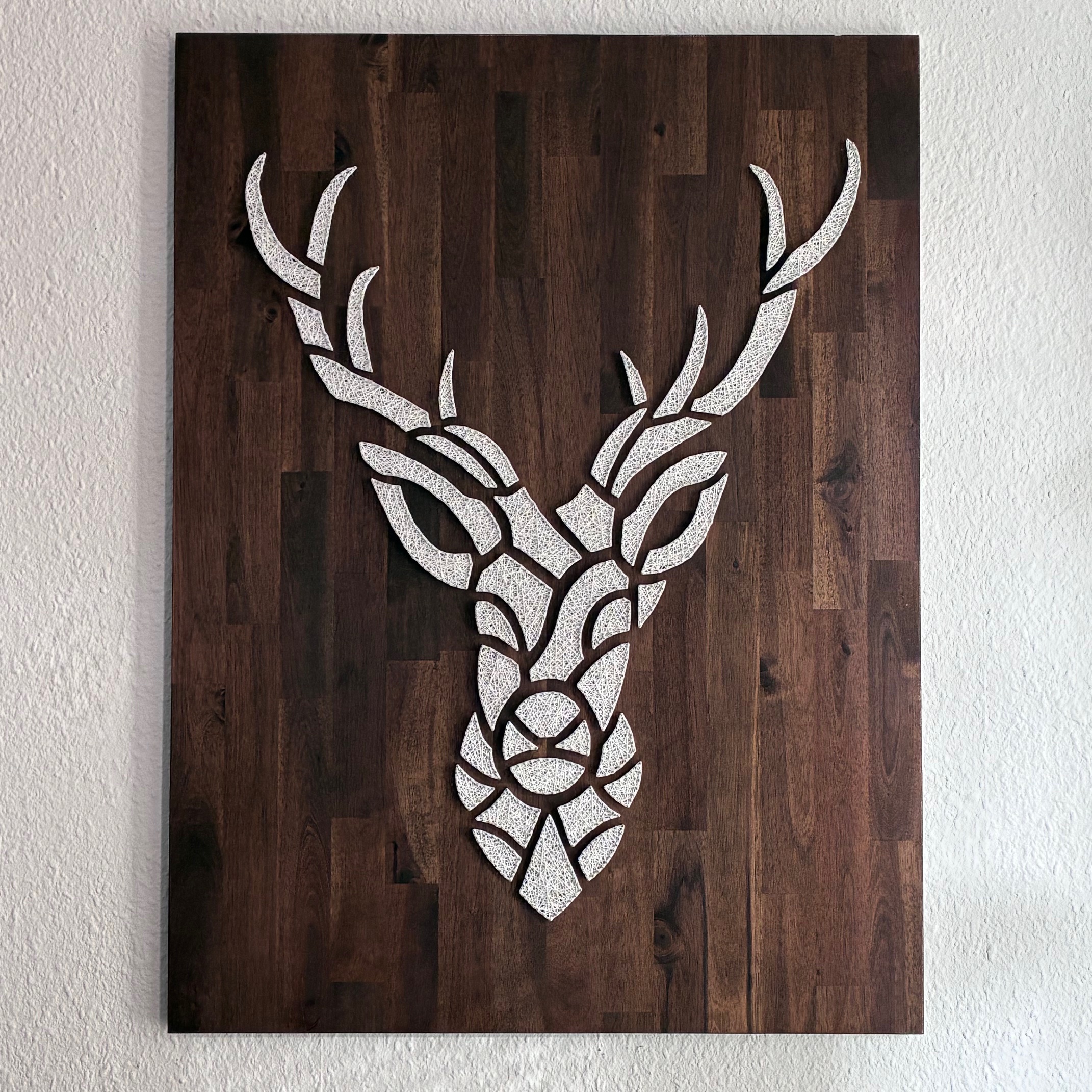 Dieses handgefertigte Wandbild im Format 80 × 60 cm zeigt ein geometrisches Hirschmotiv. Die Flächen wurden durch Spannen eines Fadens gefüllt.