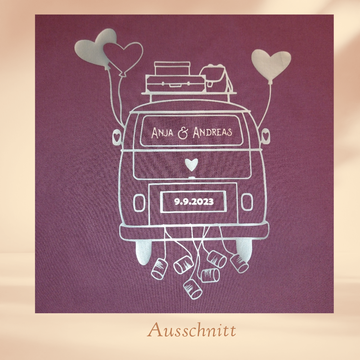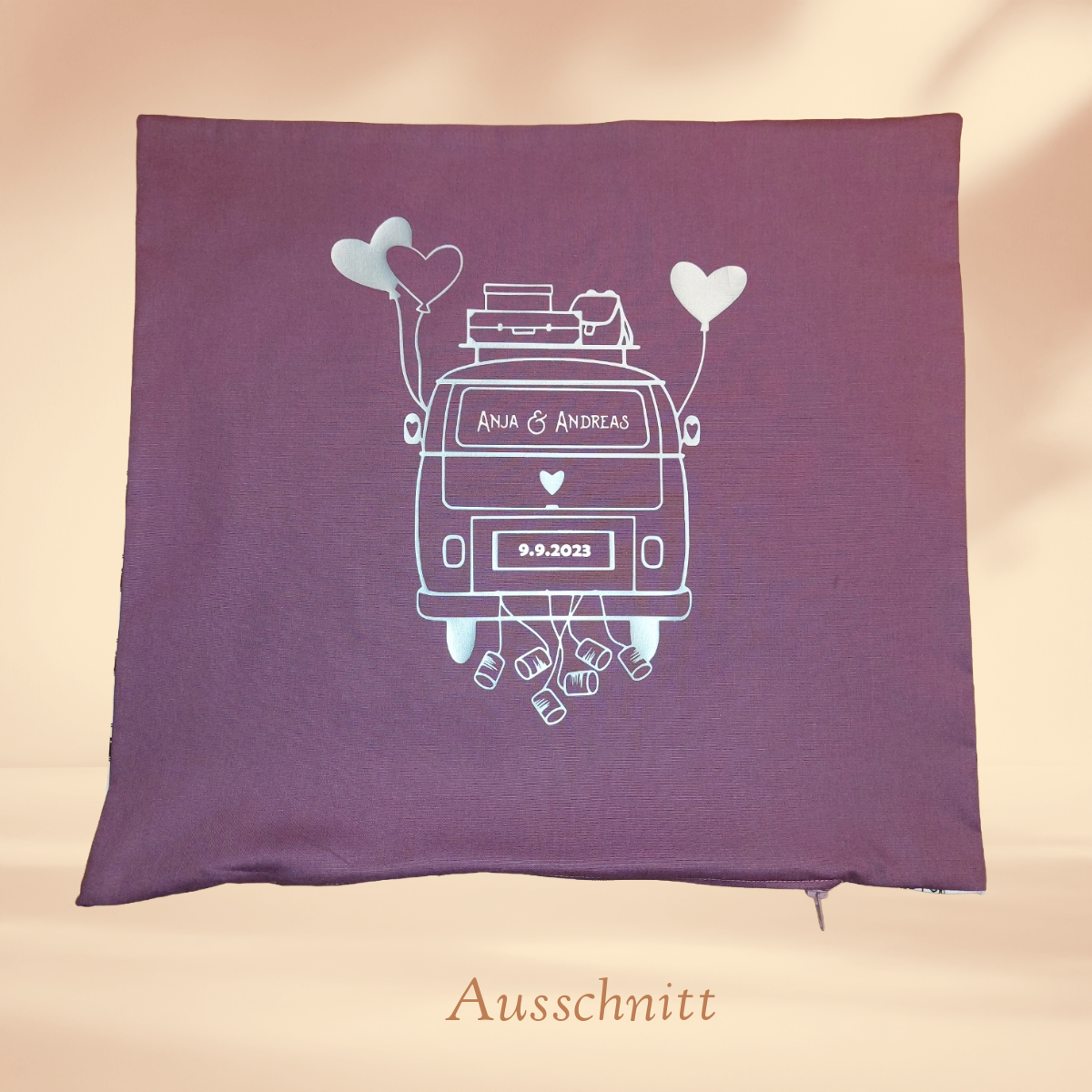 ➡ Individualisierung: Das Kissen kann mit dem Namen oder einem anderen Wunschtext für das Brautpaar versehen werden. Ebenso kann das Hochzeitsdatum im unteren Bereich beim Auto-Kennzeichen angebracht werden. Der Text wird je nach Länge im Bereich der "Windschutzscheibe" aufgebügelt.