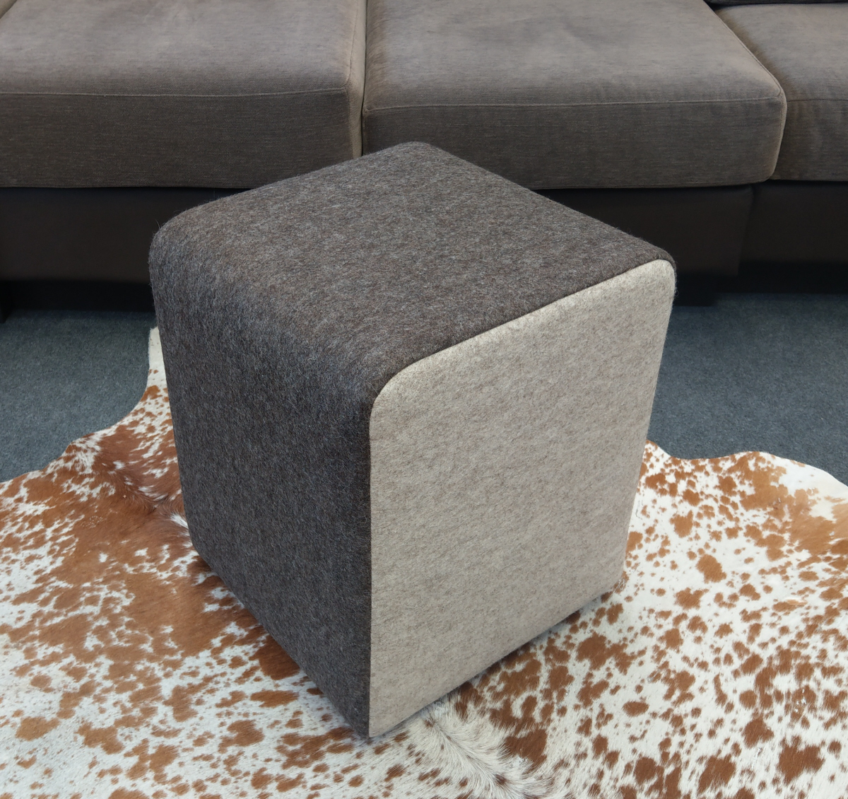 Gepolsterter Hocker in einer Wollfilz- / Wollfilzkombination.