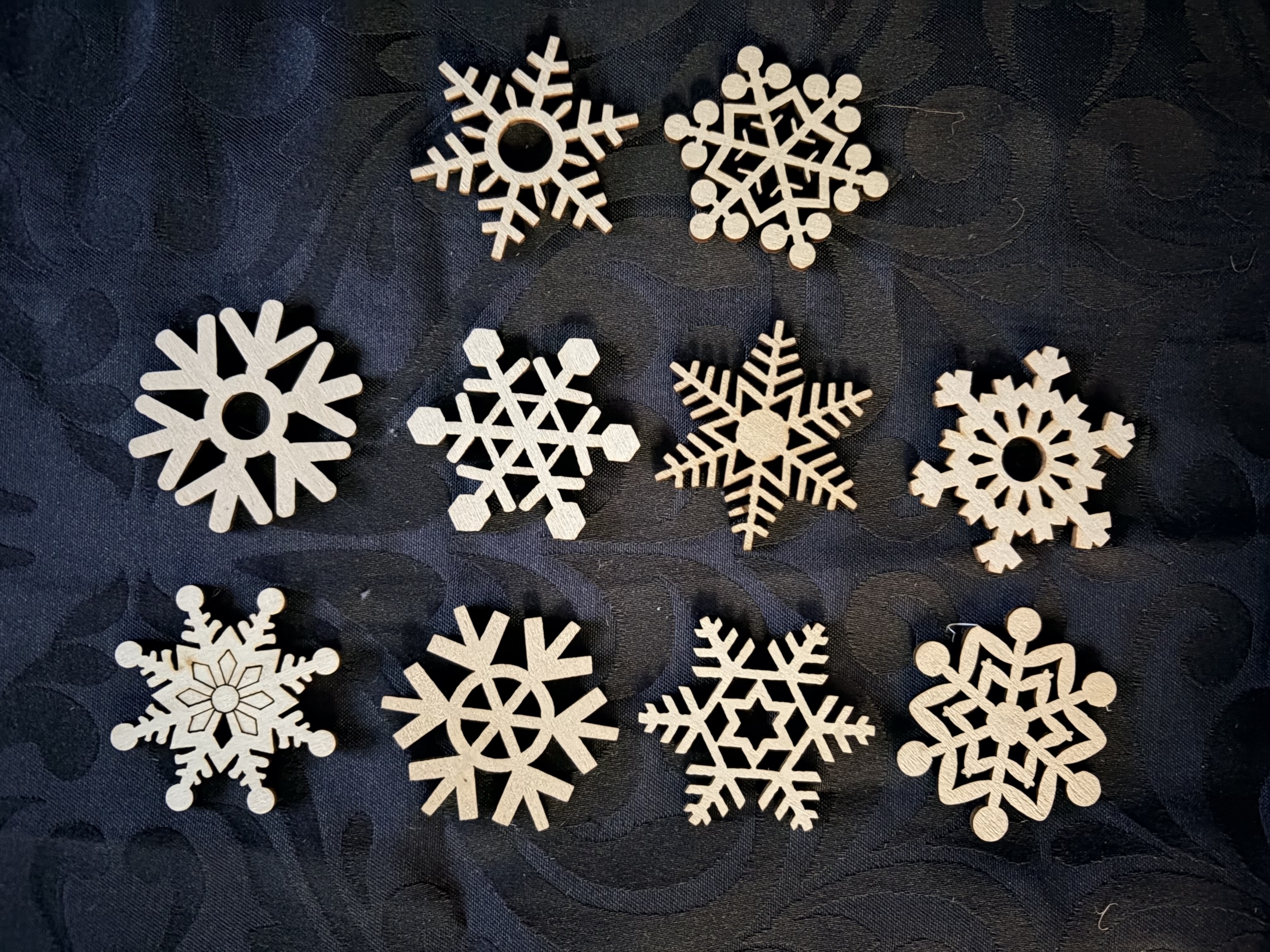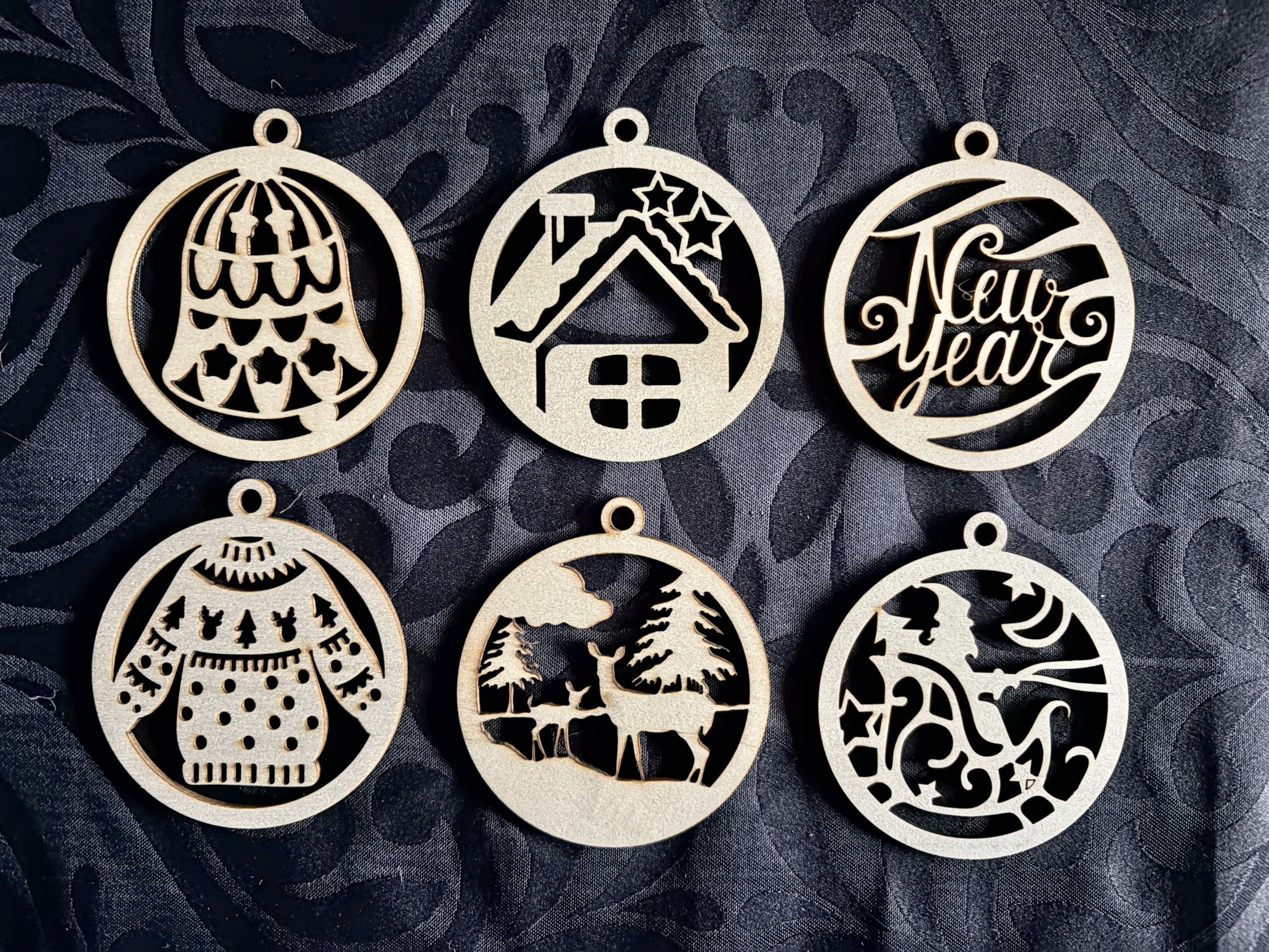 Diese detailreich gelaserten Holzanhänger verleihen jeder Weihnachtsdeko eine besondere, warme Note. Mit einem Durchmesser von 7 cm und 5 cm (Schneeflocke) sind sie perfekt geeignet für den Weihnachtsbaum, als Fensterdeko oder zum Verzieren von Geschenkverpackungen.
