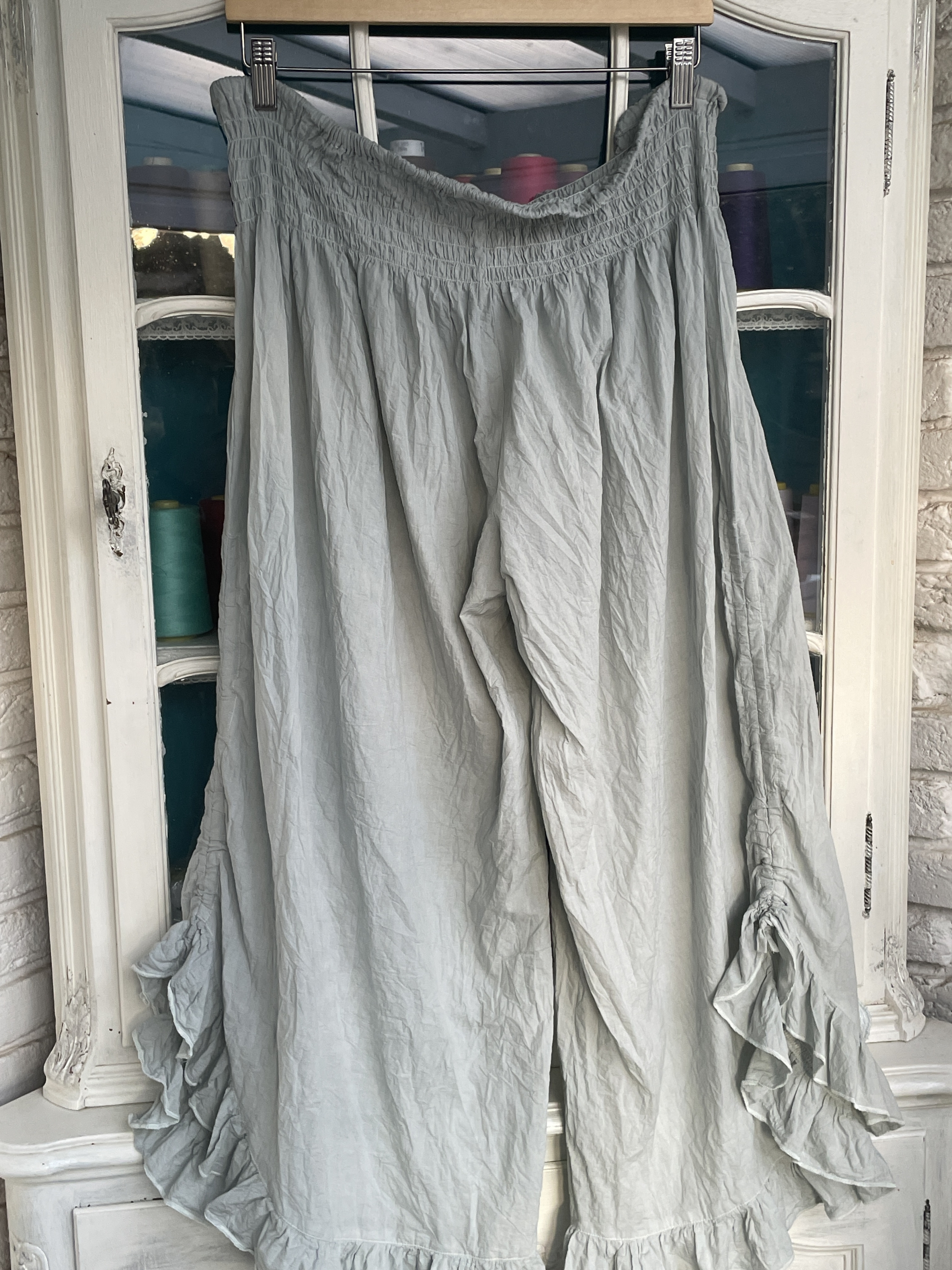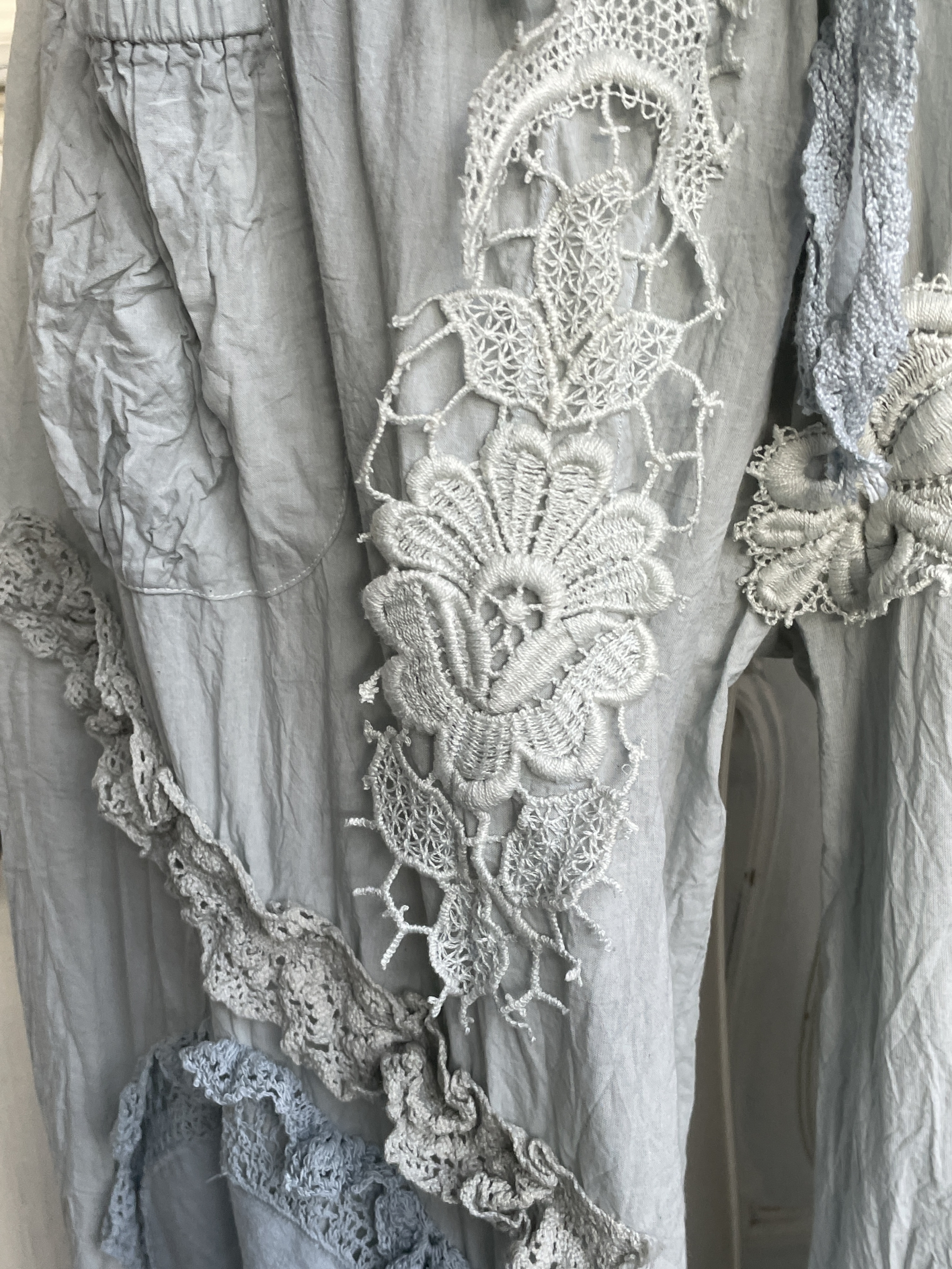 Romantischer Hosenrock in Rauchblau aus leichtem Baumwollstoff. Verziert mit Rüschen und antiker Spitze, seitlich raffbar für eine individuelle Passform. Weit ausgestellt und angenehm luftig. Dank dehnbarem Bündchen und Bindeband passt die Einheitsgröße von 34–46.