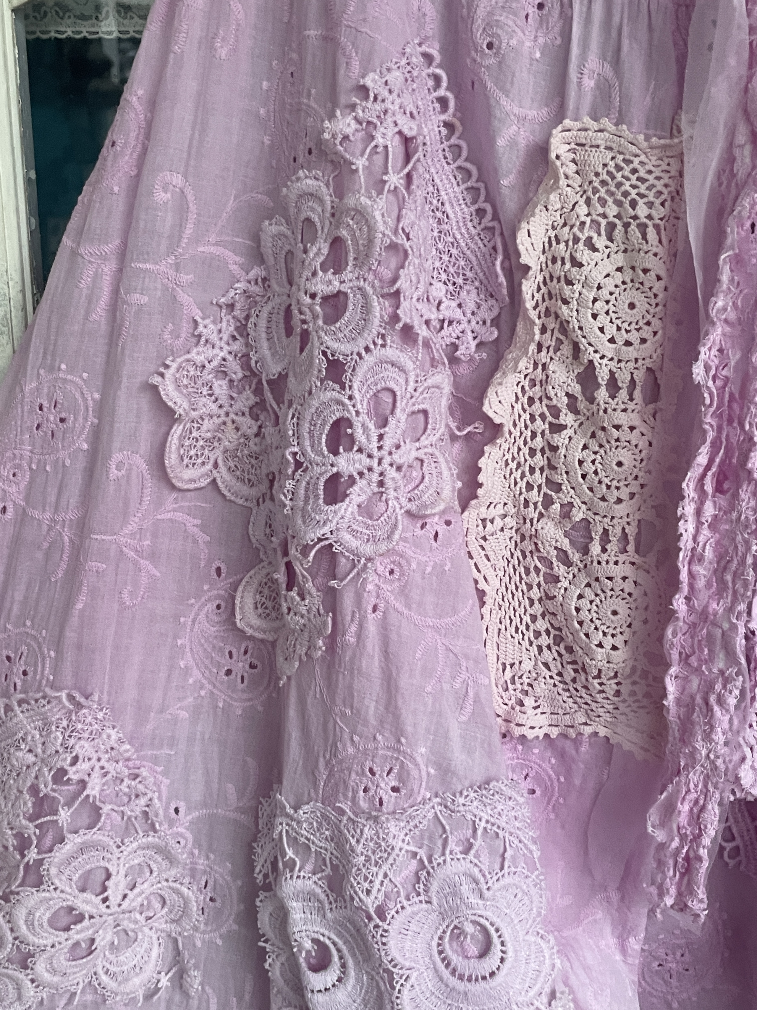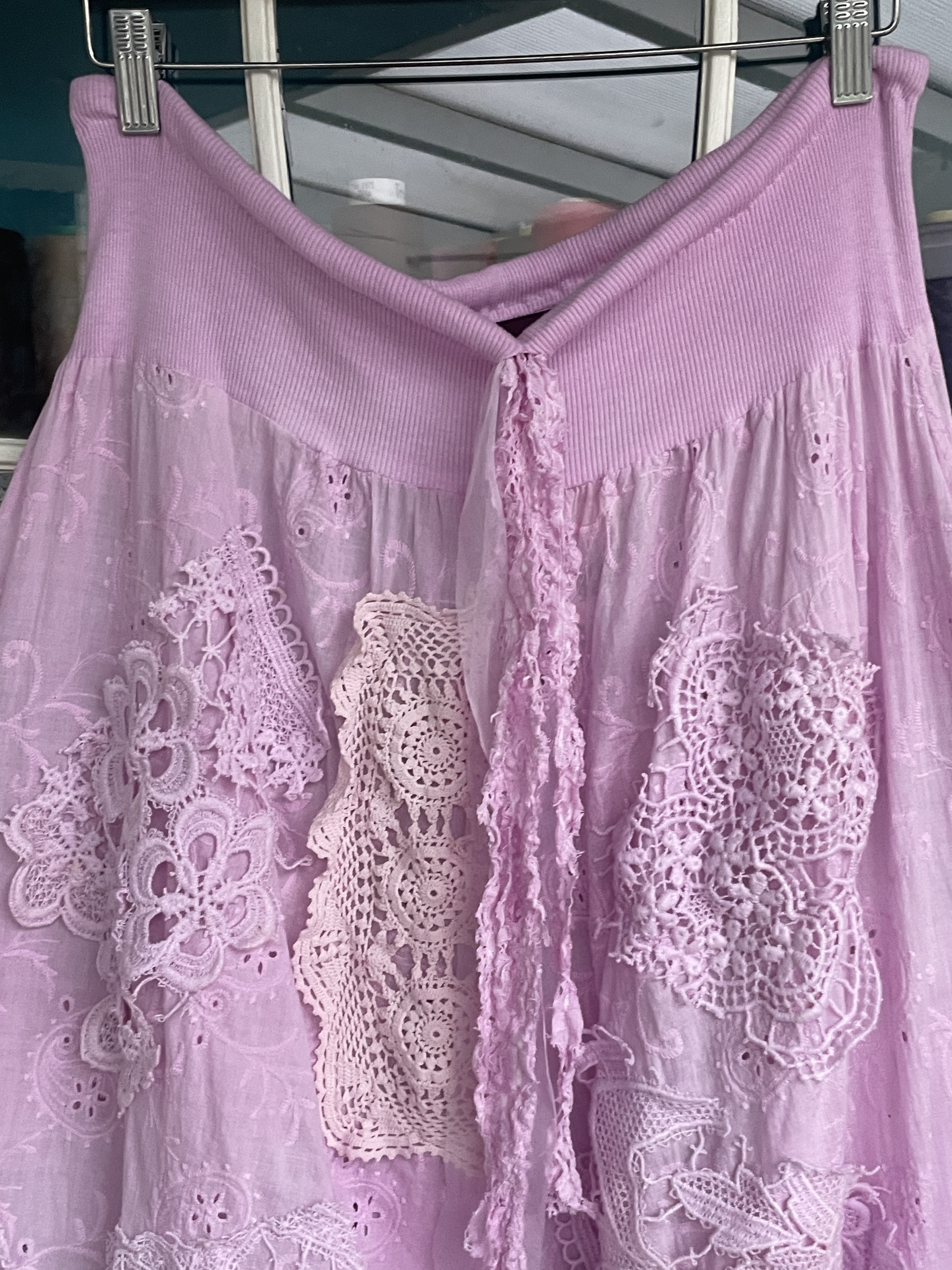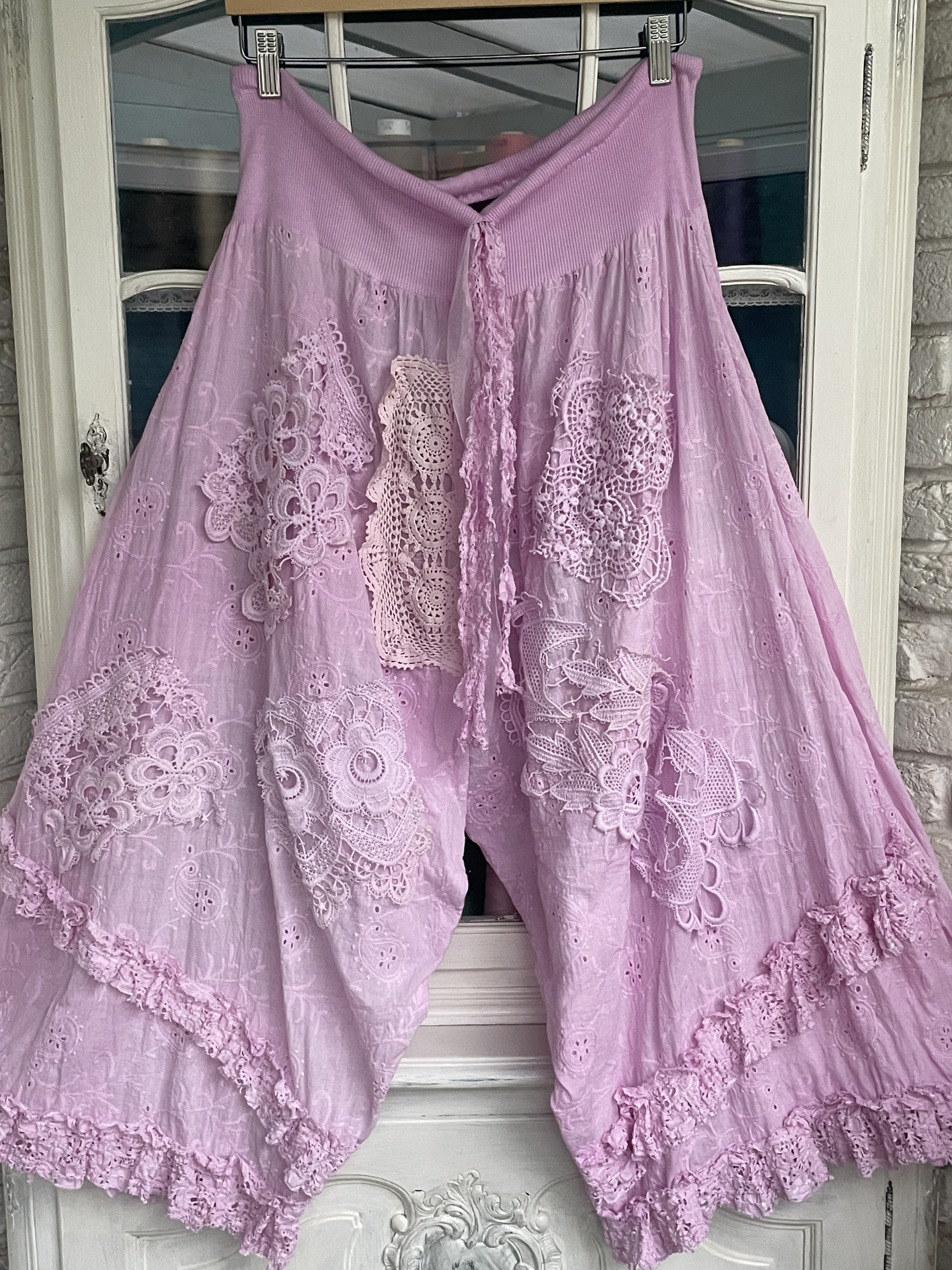 Außergewöhnlicher, weit schwingender Hosenrock im Boho- & Lagenlook, der Komfort und verspielte Eleganz vereint. Der tiefe Schritt sorgt für Bewegungsfreiheit, während Rüschen und antike Spitze dem Design einen romantischen, leicht nostalgischen Charakter verleihen.