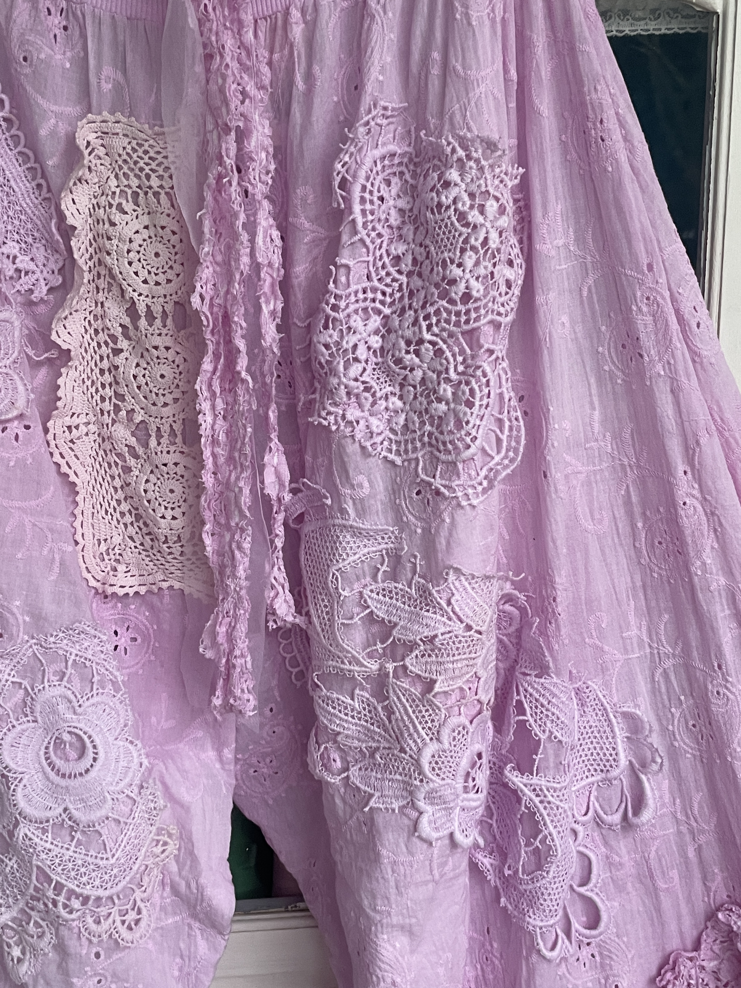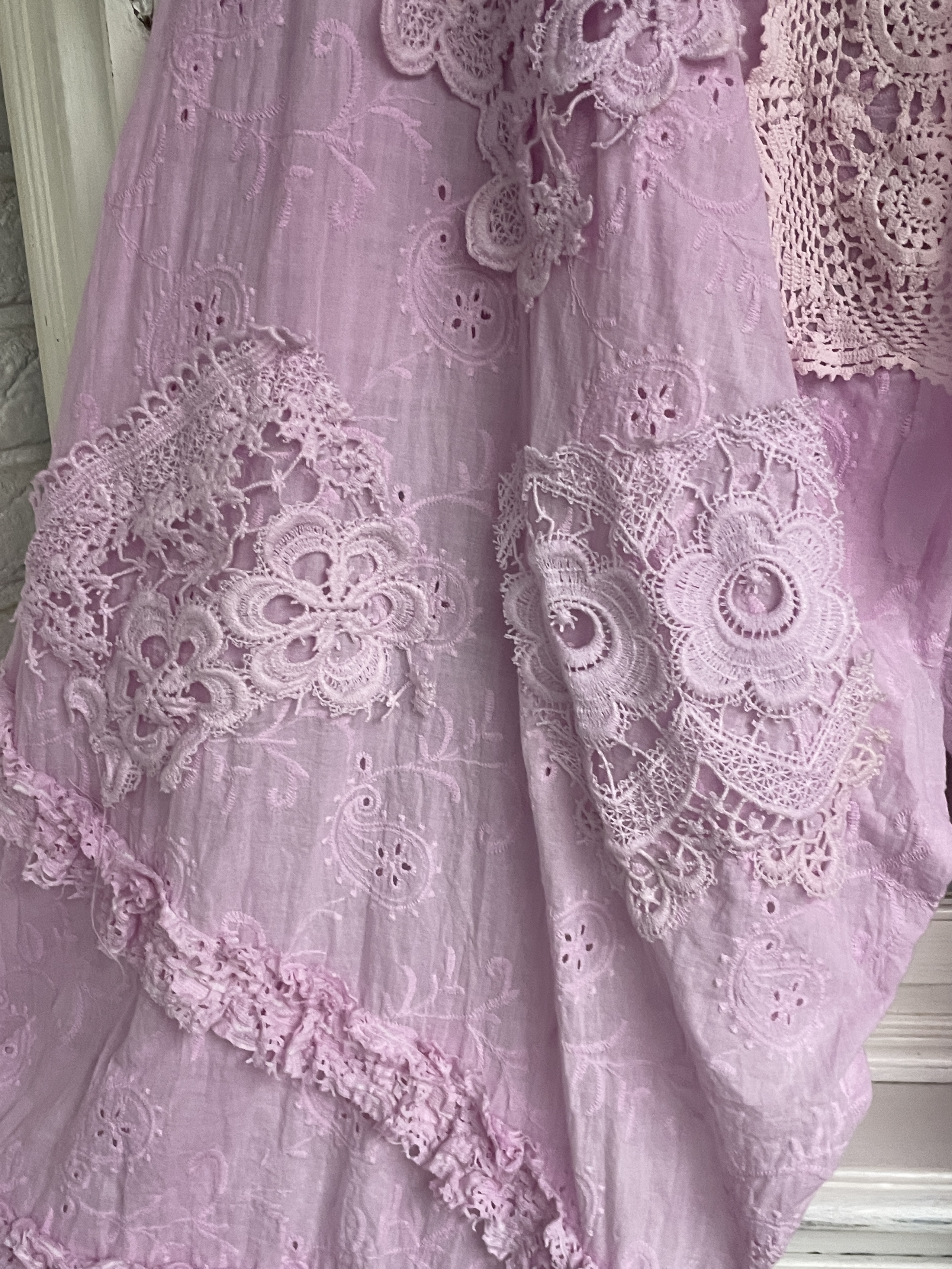 Gefertigt aus leichtem, besticktem Baumwollstoff und von Hand in einem zarten Rosaton gefärbt – jedes Stück ist ein Unikat mit individueller Farbnuance.
