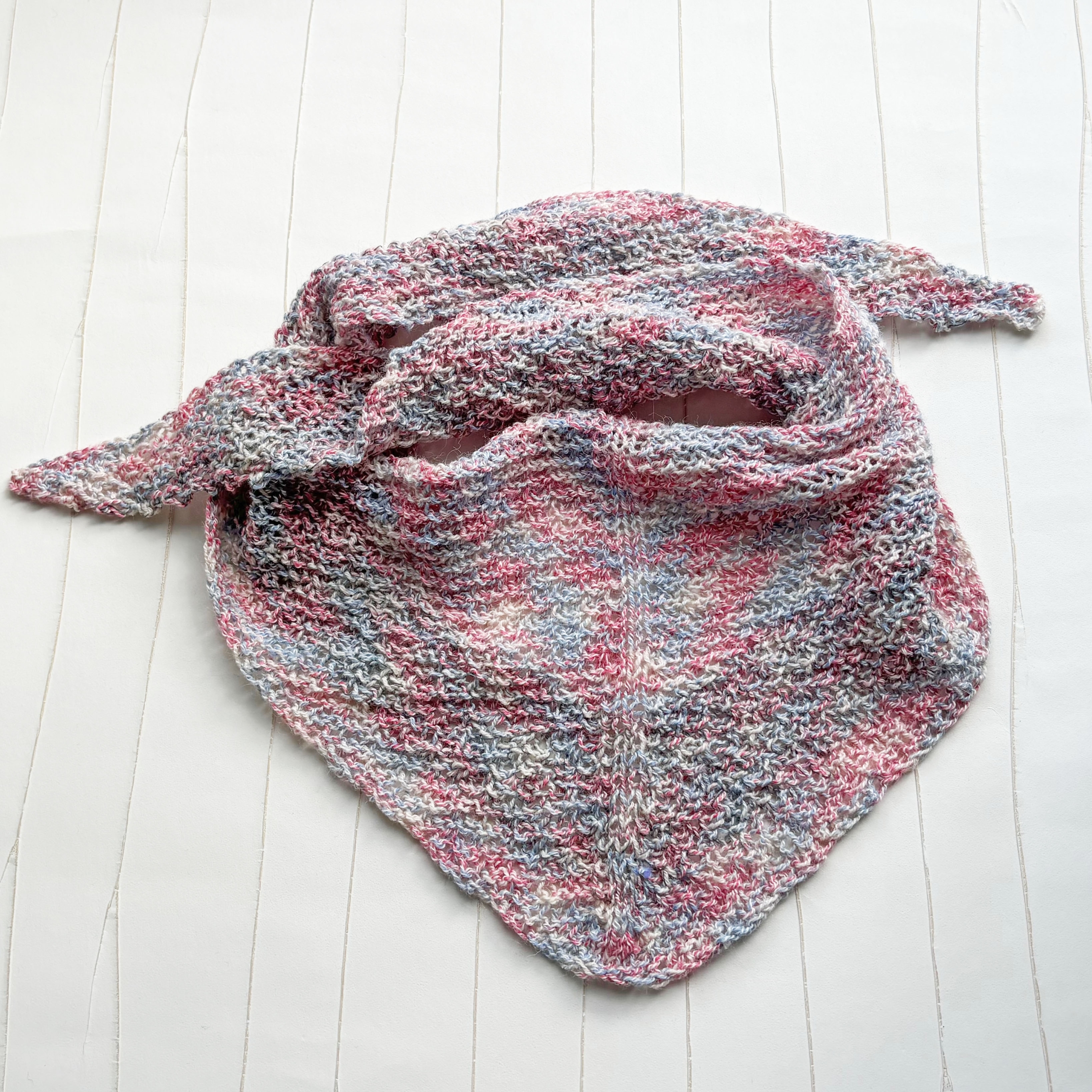 Das kleine Dreiecktuch ist aus dünner Wolle per Hand gestrickt und wird an den Enden verknotet.