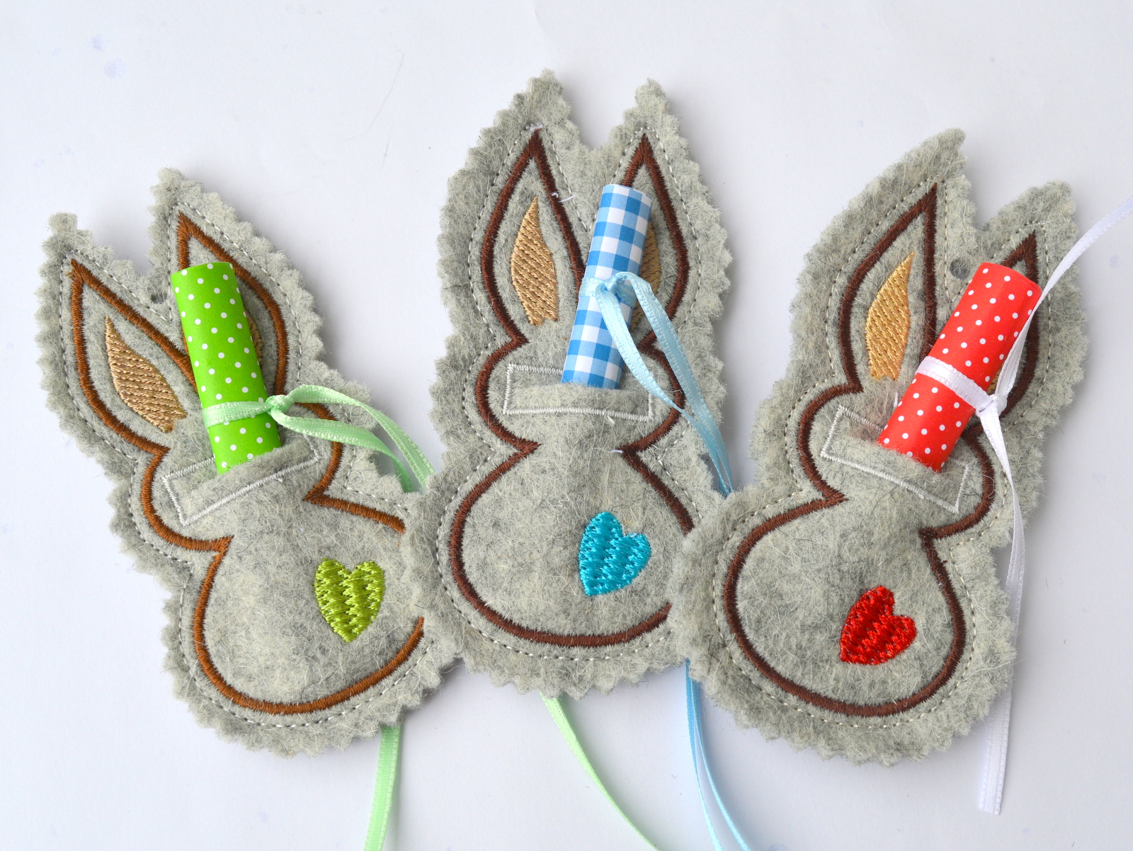 Süße Stickdatei zu Ostern, kleiner Hase als Anhänger, um Botschaften, Glückwünsche, Nachrichten oder auch Geldgeschenke zu Ostern zu verschenken.