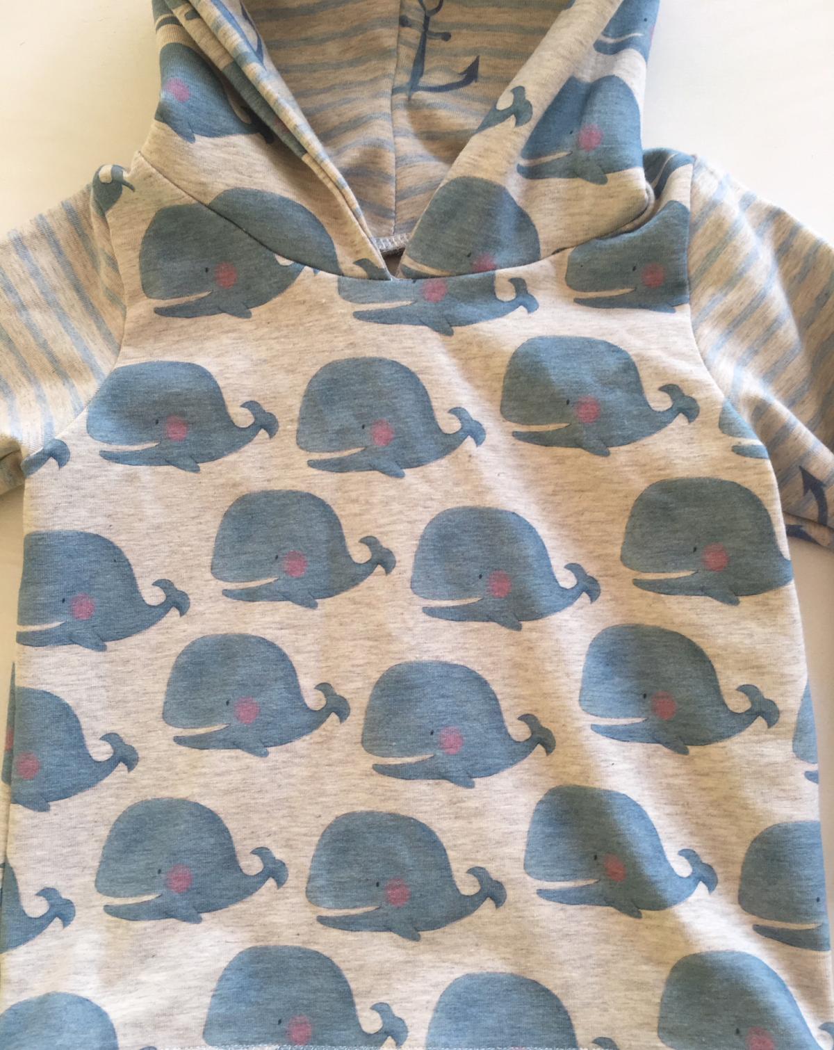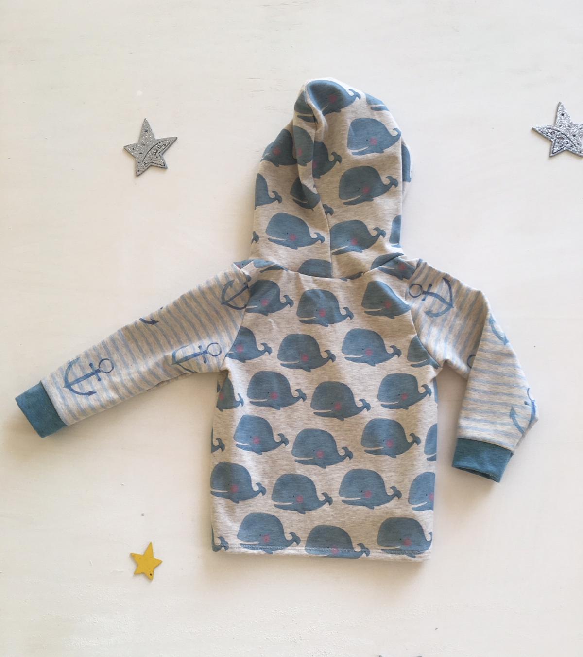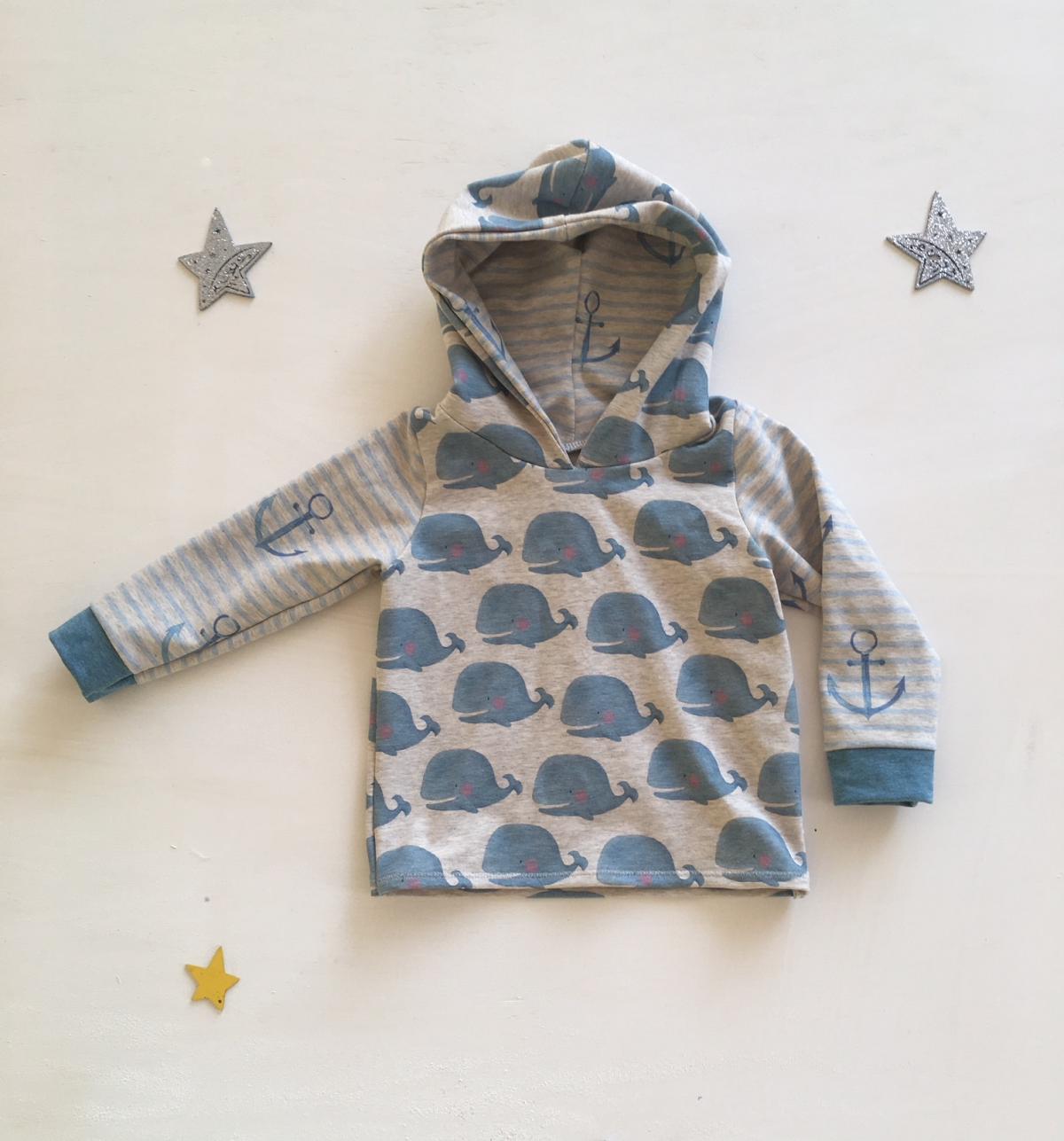 Der kleine Wal dreht seine runden im Meer – ein maritimer Kapuzenpulli für kleine Zwerge!