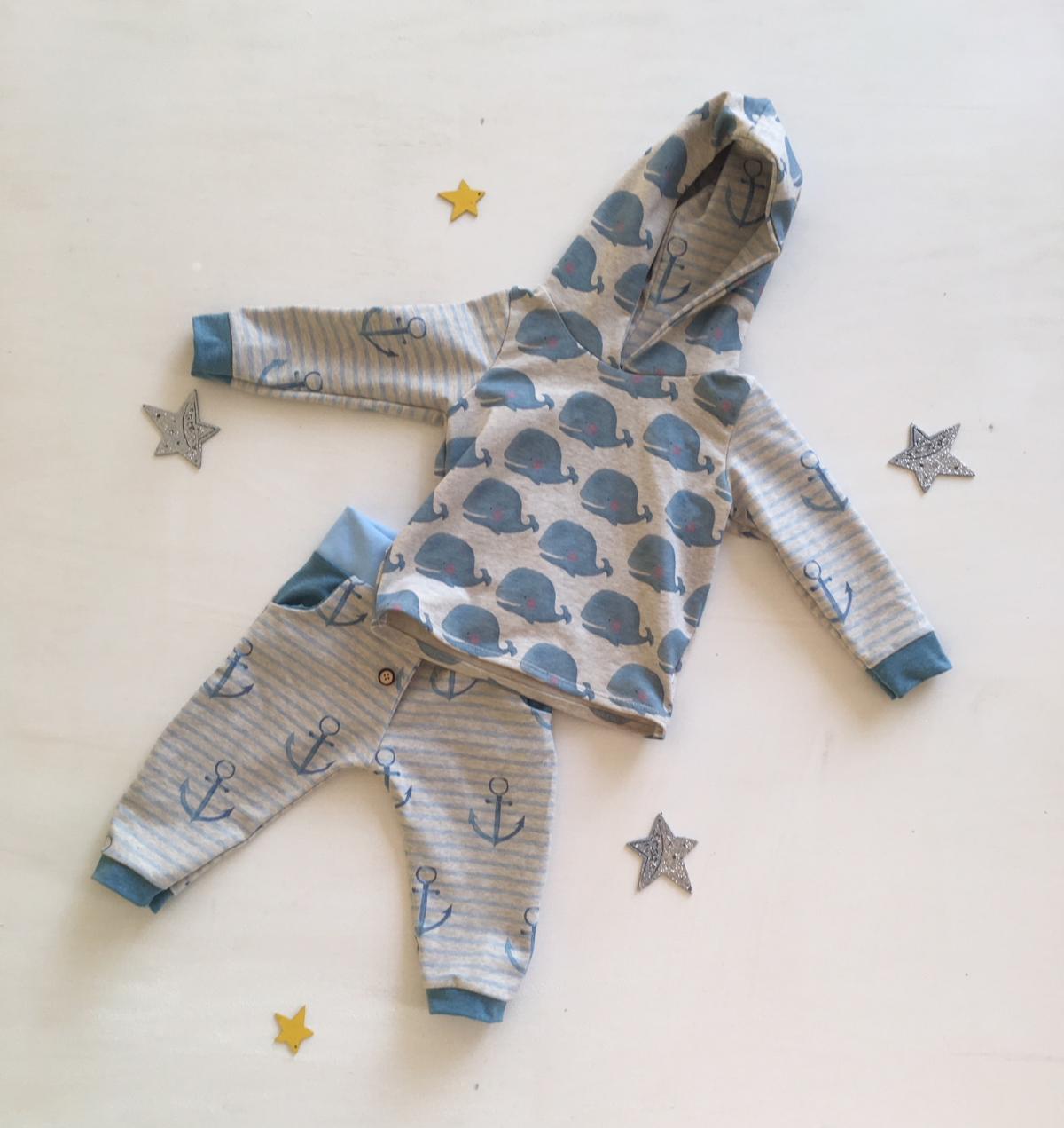 Dieser Hoodie passt perfekt in die kühlere Jahreszeit. Er ist aus einem Jersey Stoff genäht und mit zwei angesagten, maritimen Mustern kombiniert. Der Hintergrund ist in creme gehalten, der Wal und der Anker ist blau, hellblau und der Kombistoff ist blau meliert.