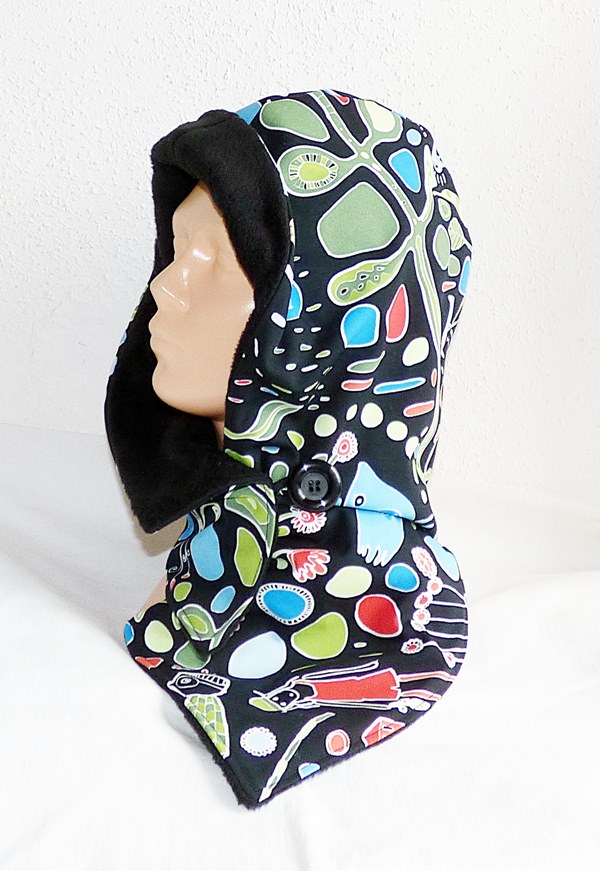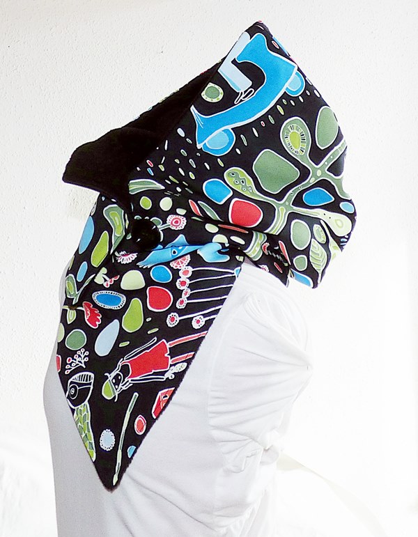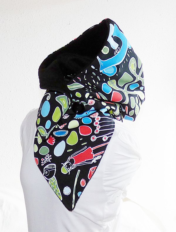 Der Kapuzenschalkragen besteht aus einem schwarzen farbig gemusterten Baumwollstoff. Innen ist er mit weichen schwarzen Fleece gefüttert.