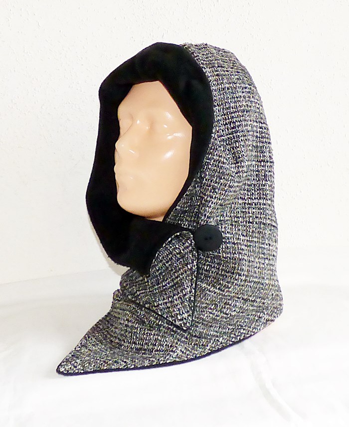 Der Kapuzenschal besteht aus einem in schönen melierten Woll- und Webstoff in den Farben schwarz, grau, creme und dunkelbraun. Innen ist er mit weichen schwarzen Fleece gefüttert.