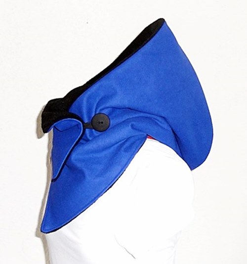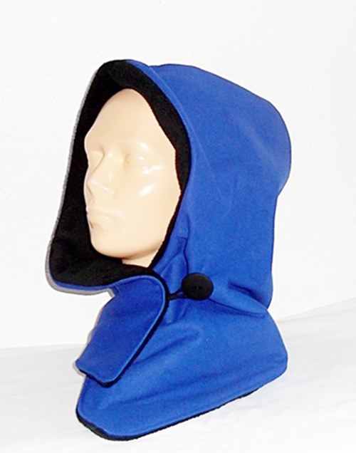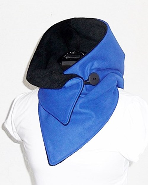 Der Kapuzenschal besteht aus einem einem royalblauen weichen Softshell (Microfleece - 3-Lagen-Laminat (G.R.Tex). Innen ist er mit einem weichen schwarzen Fleece gefüttert.