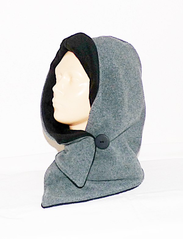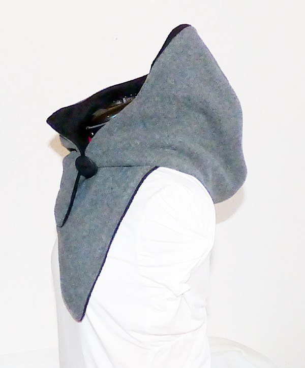 Der Kapuzenschal besteht aus einem hochwertigen Wollstoff (mit Kaschmiranteil) in hellgrau-melange. Innen ist er mit weichen schwarzen Fleece gefüttert.