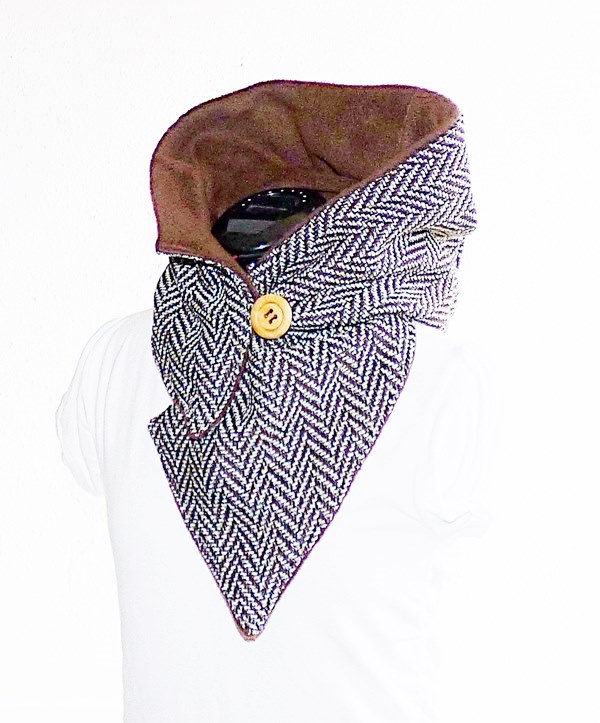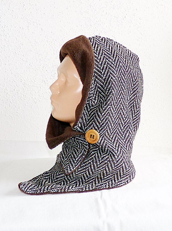 Der Kapuzenschalkragen besteht aus einem creme-braun gemusterten Woll- und Webstoff (Fischgrät). Innen ist er mit einem braunen weichen Fleece gefüttert, der schön warm hält.