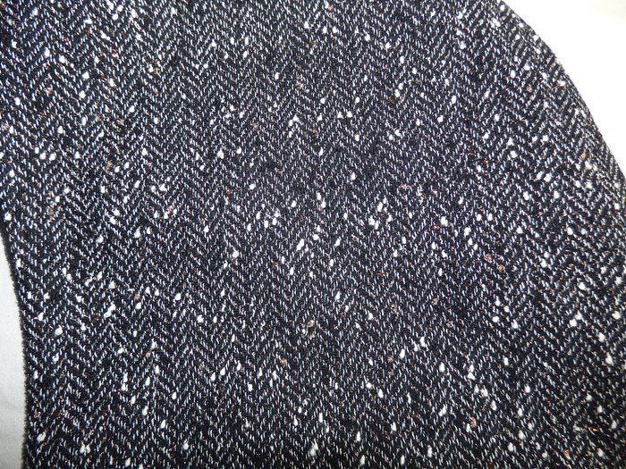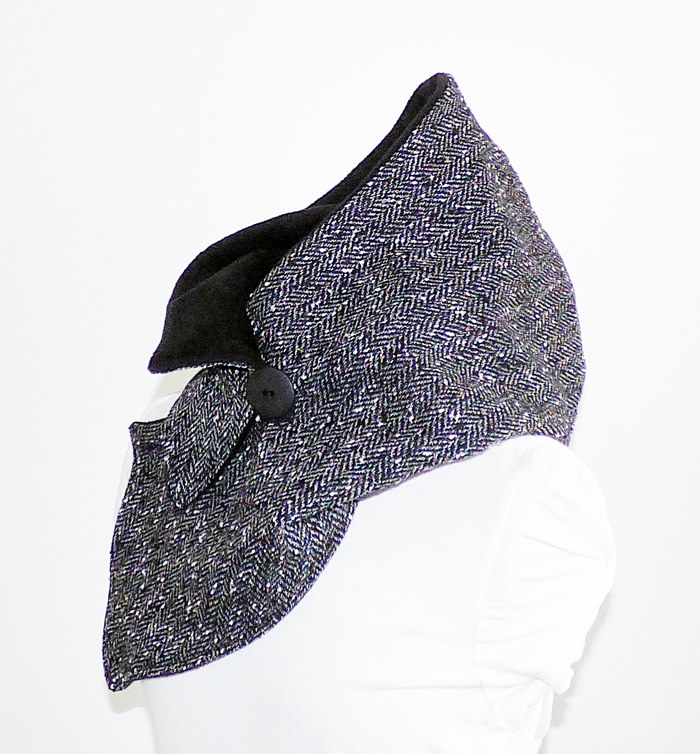 Der Kapuzenschalkragen besteht aus einem schwarz-grau melierten Wollstoff.