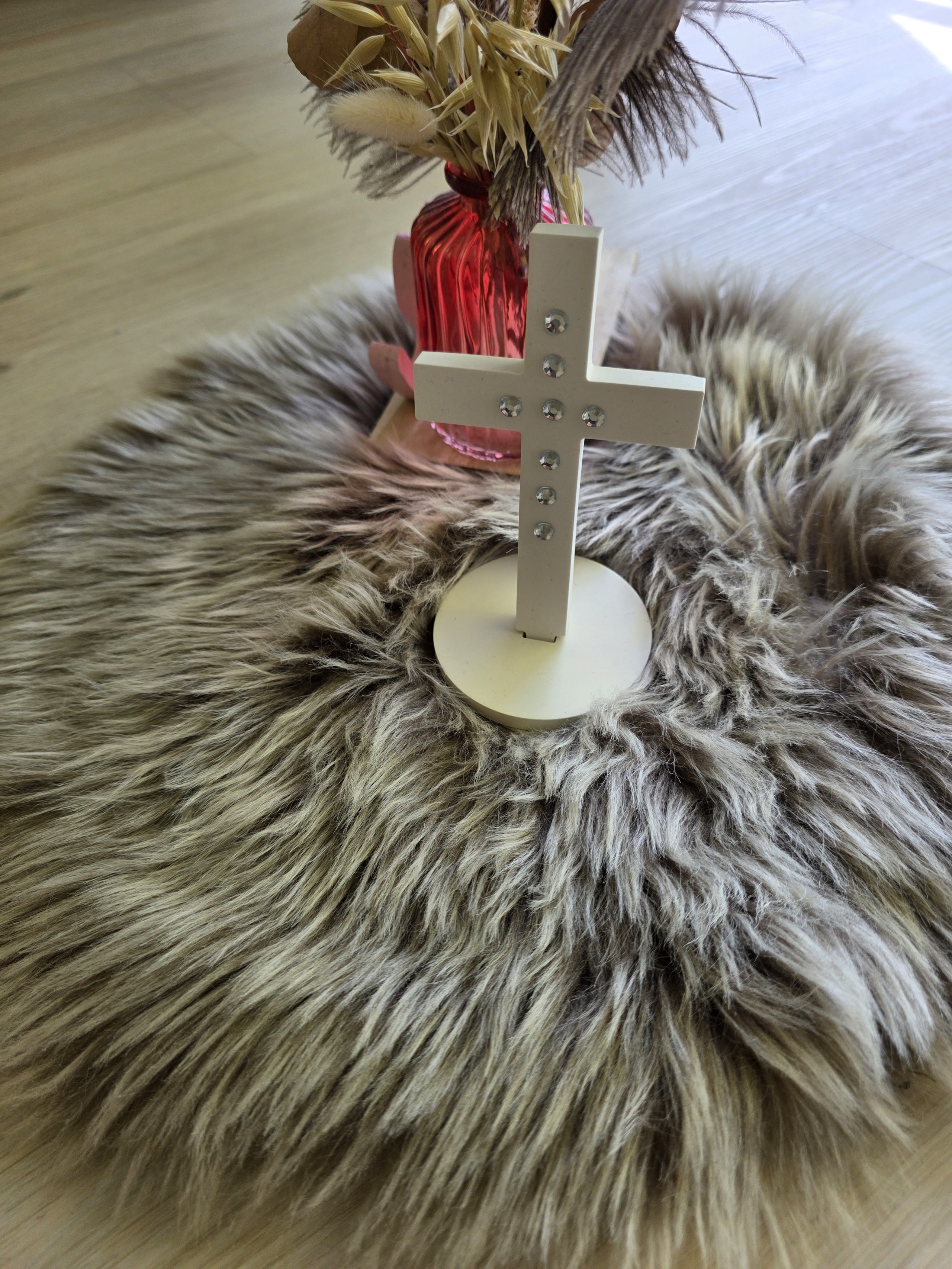 Kreuz aus Giesskeramik stehend, mit Strasssteinen.