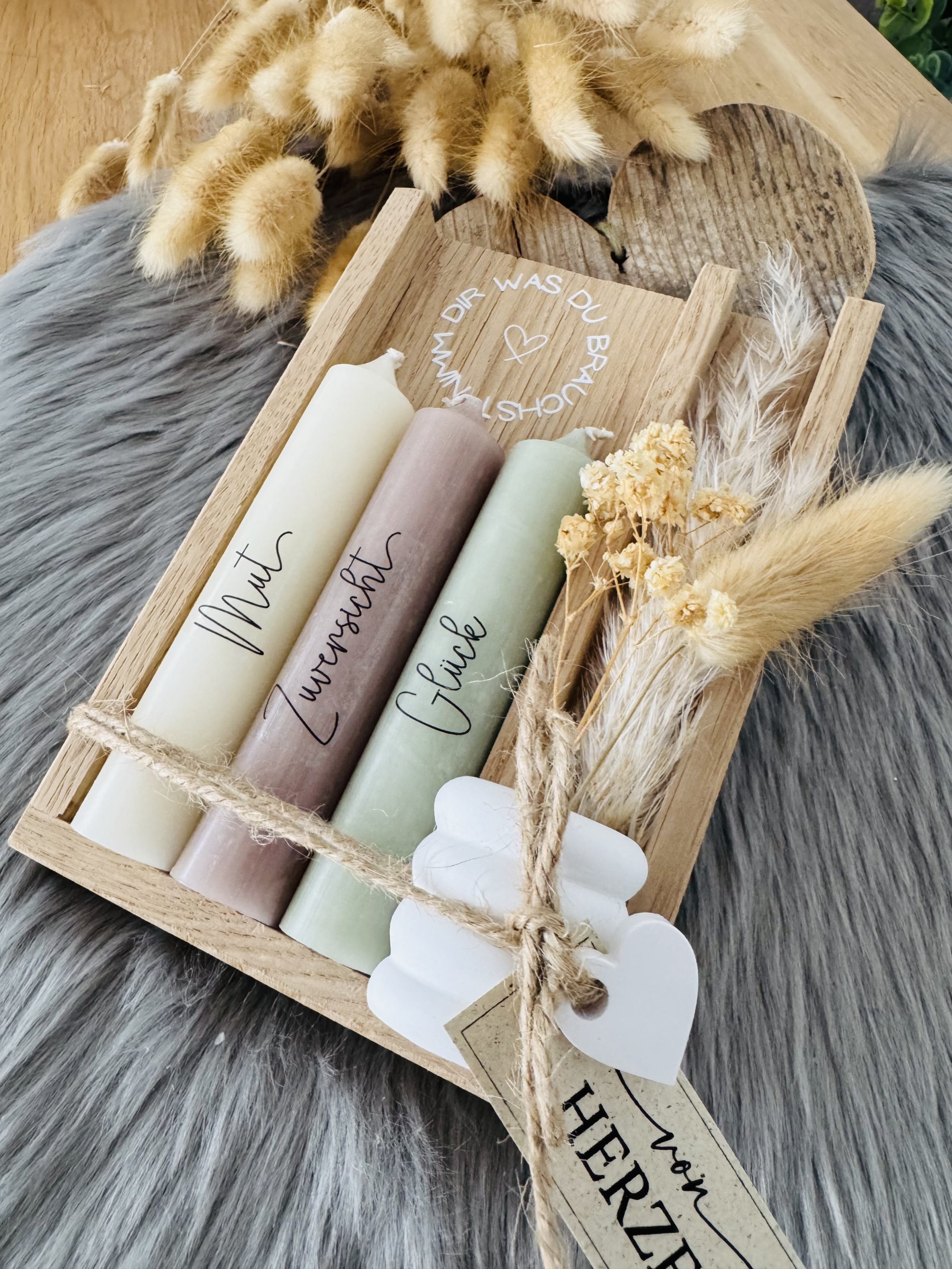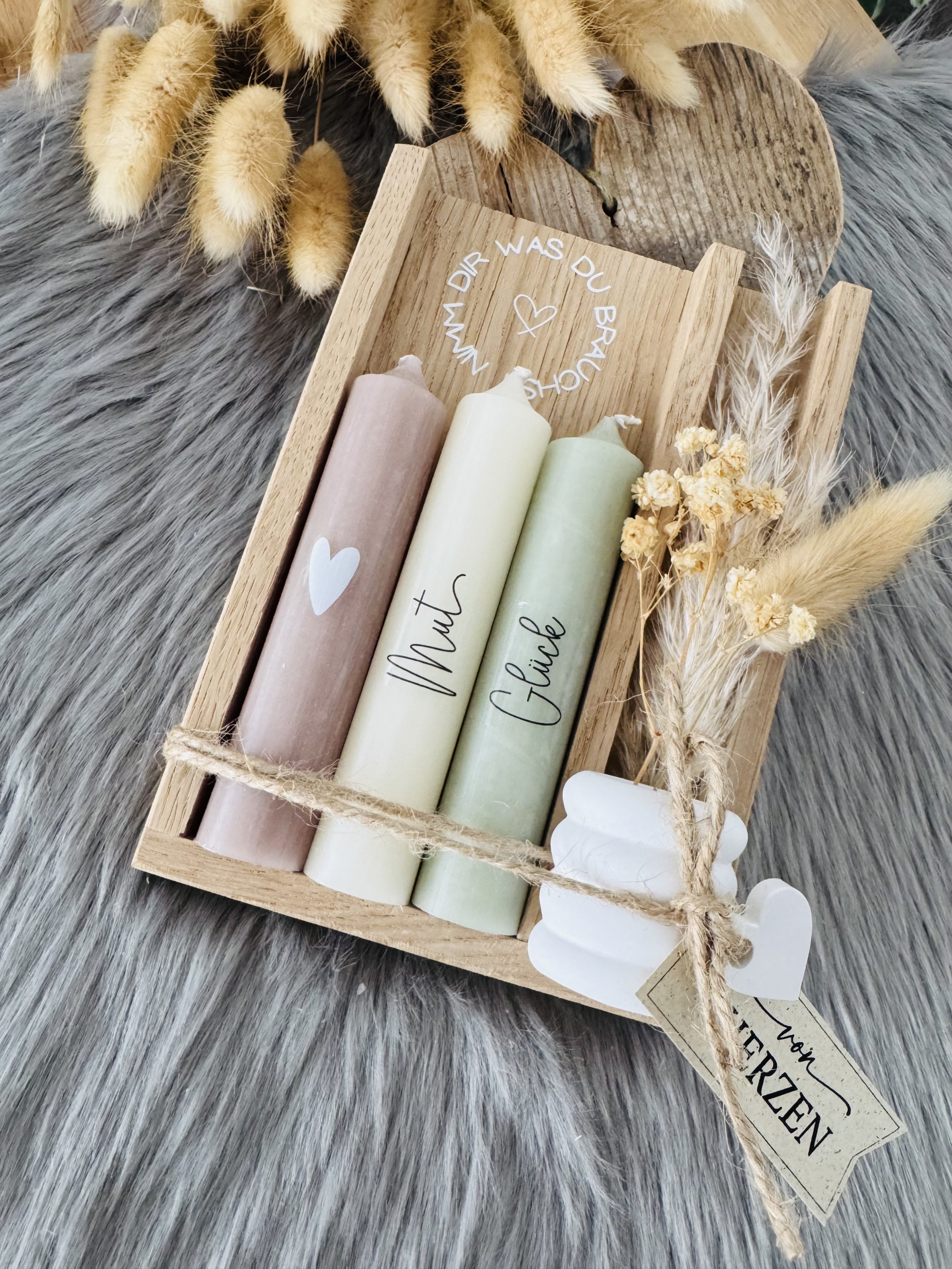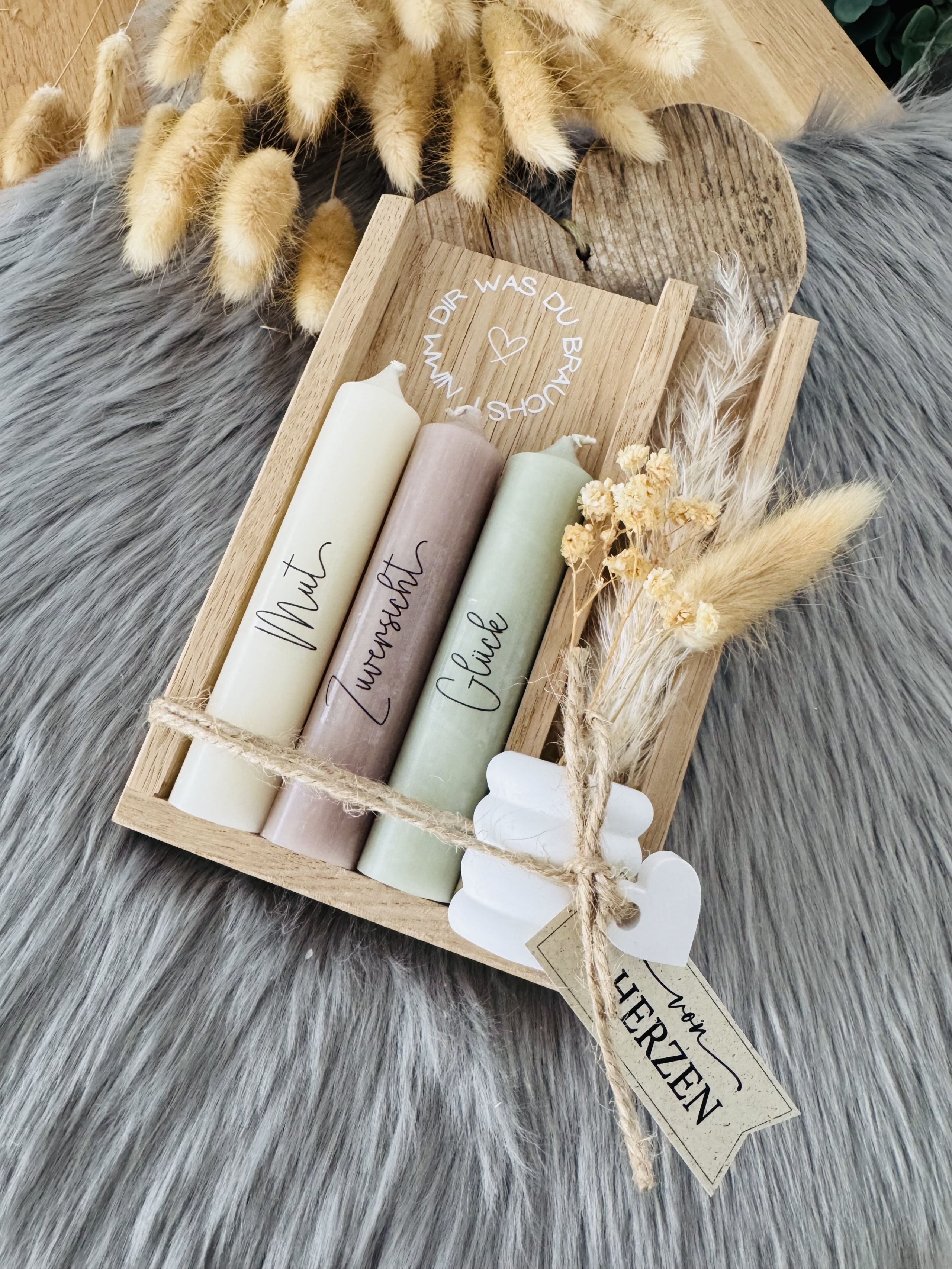 Bitte als Nachricht dazu schreiben welche Kerzenfarbe mit welchem Begriff gefertigt werden soll. Z. B. Elfenbein - Mut, Salbei - Zufriedenheit, Jade - Herz