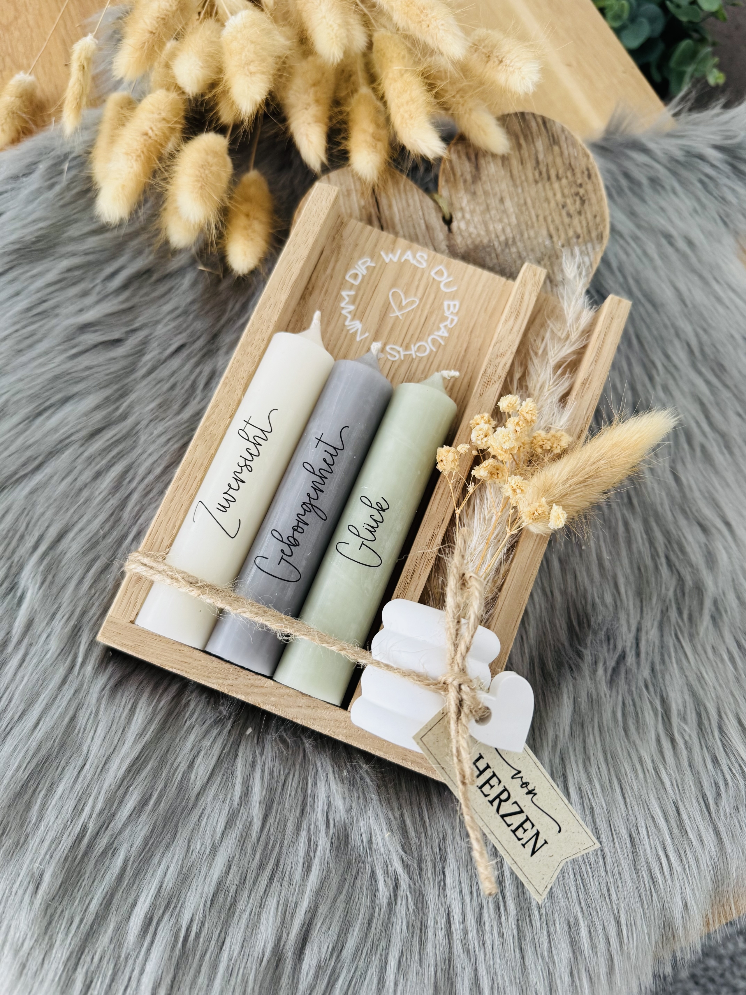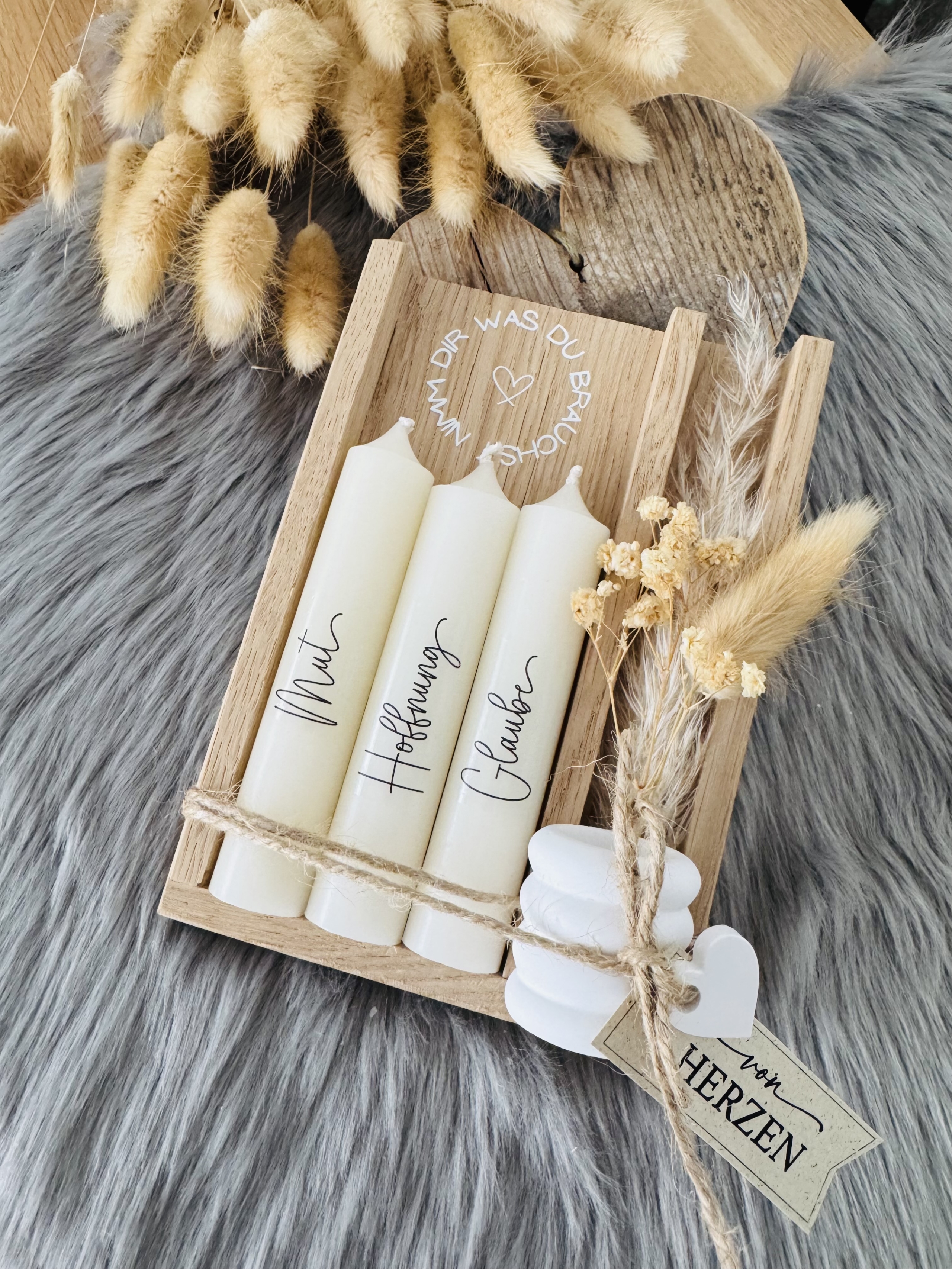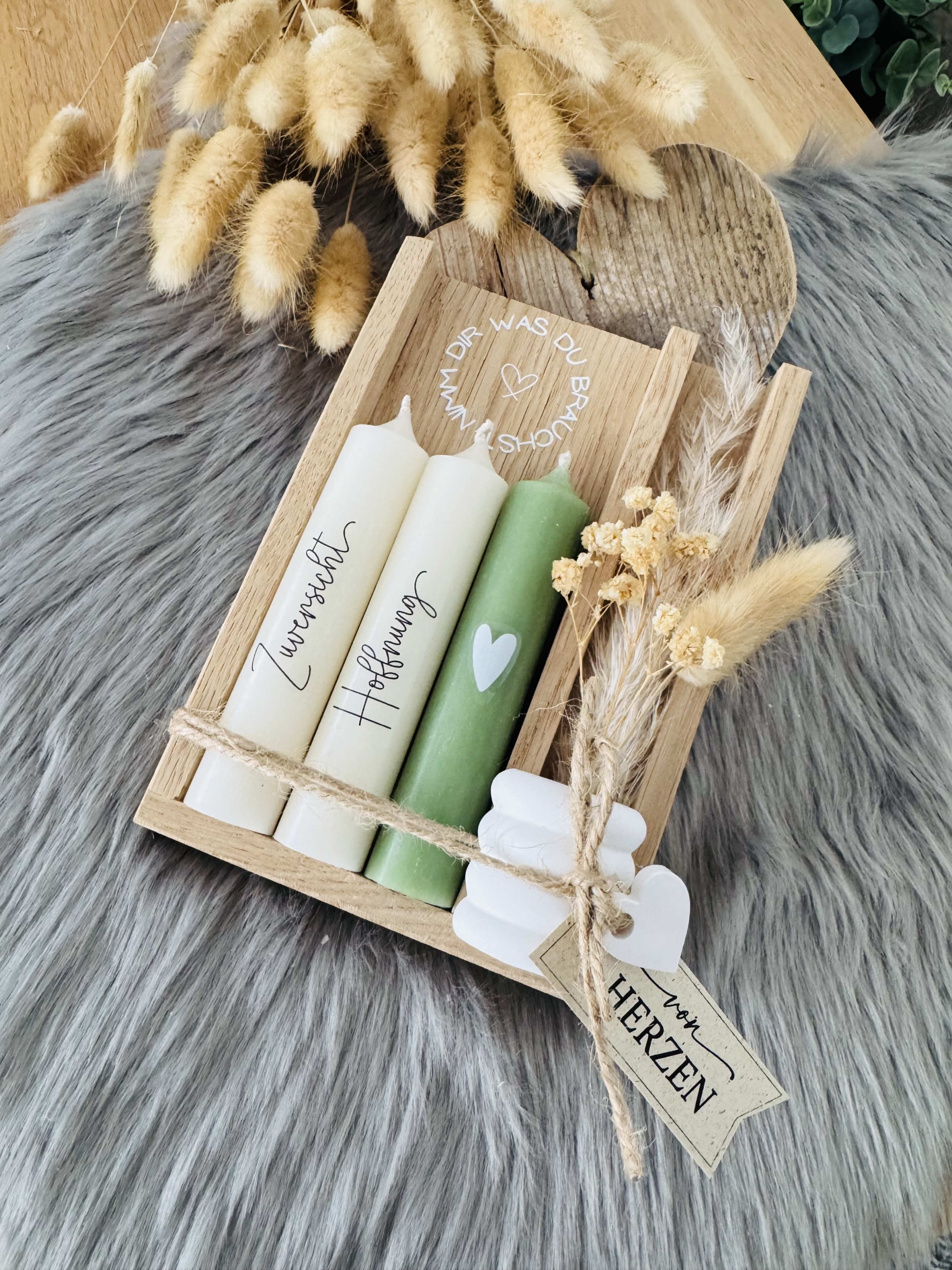 Bitte als Nachricht dazu schreiben welche Kerzenfarbe mit welchem Begriff gefertigt werden soll. Z. B. Elfenbein - Mut, Salbei - Zufriedenheit, Jade - Herz