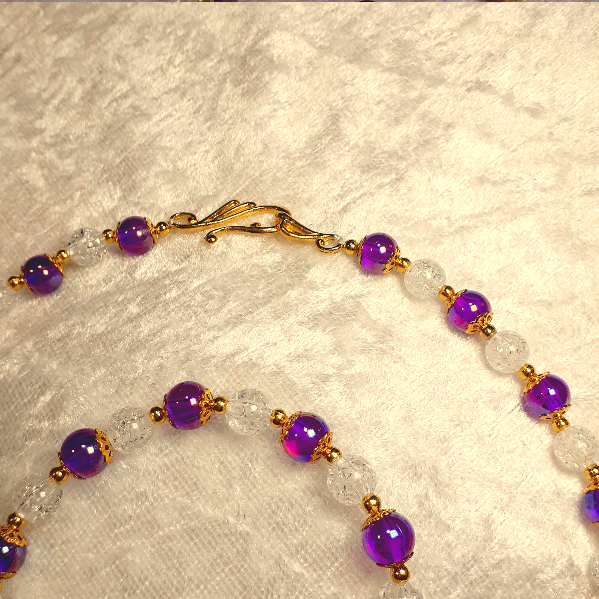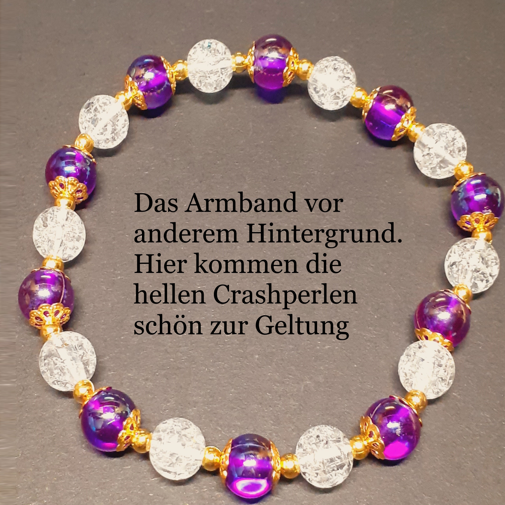 wie Sie auf den Bildern bestimmt gut sehen sind die lilafarbenen Perlen durchscheindend und haben daher einen schönen Glanz. Bei den Weiß-Transparenten Perlen handelt es sich um Crash-Perlen. Um das ganze Arangement abzurunden haben wir mit goldfarbenen Miniperlen und Perlenkappe kombiniert.