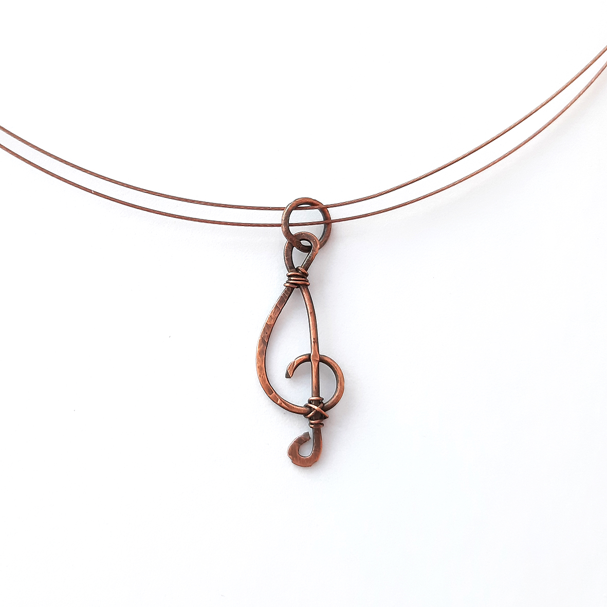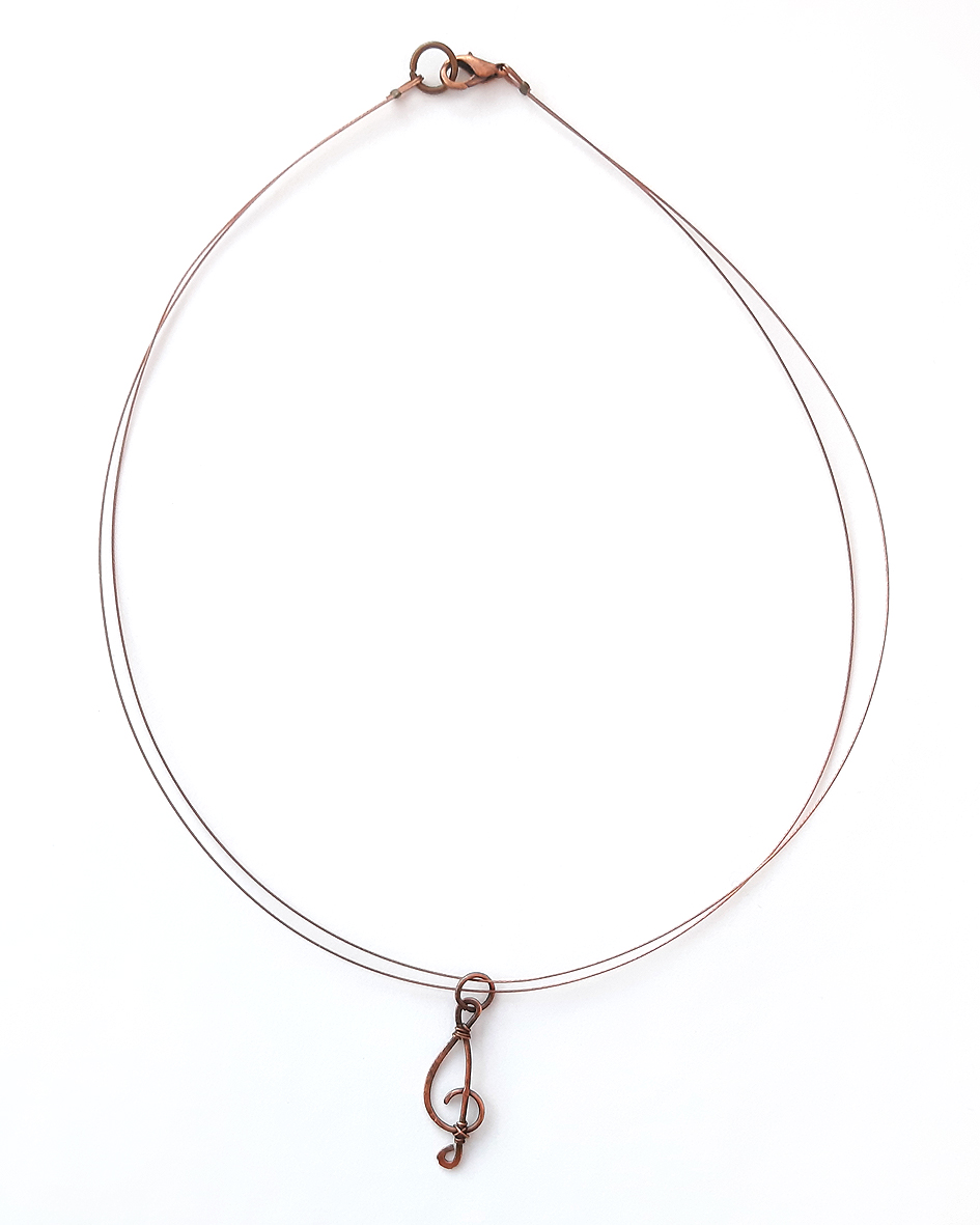 Der Violinschlüssel ist an zwei nylonummantelten braunen Drähten befestigt. Dieser kann auf Wunsch auch gegen ein Lederband ausgetauscht werden.