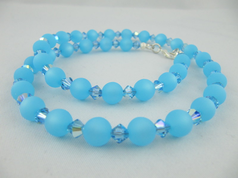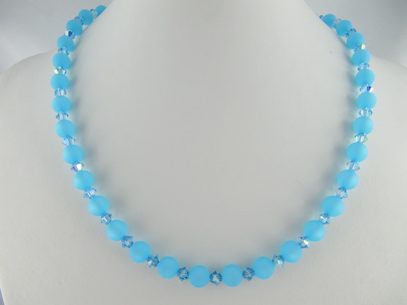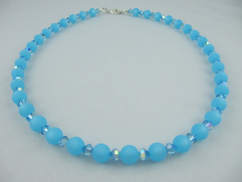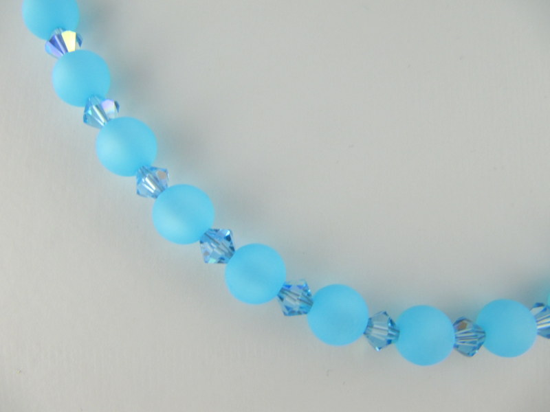Funkelden Kette gefädelt aus hellblauen Polaris-Perlen und Swarovski® bicone in der Farbe Aquamarine AB
