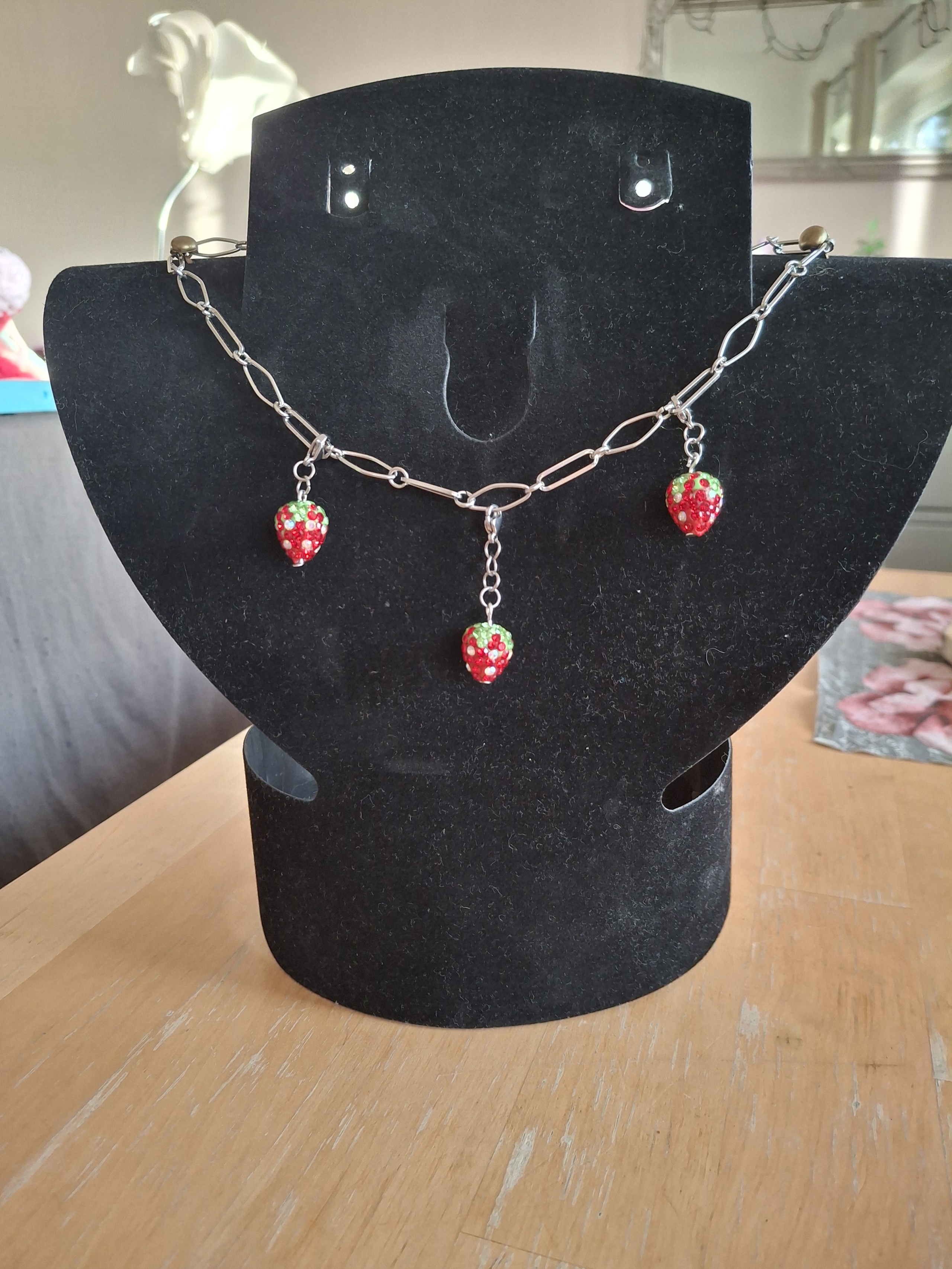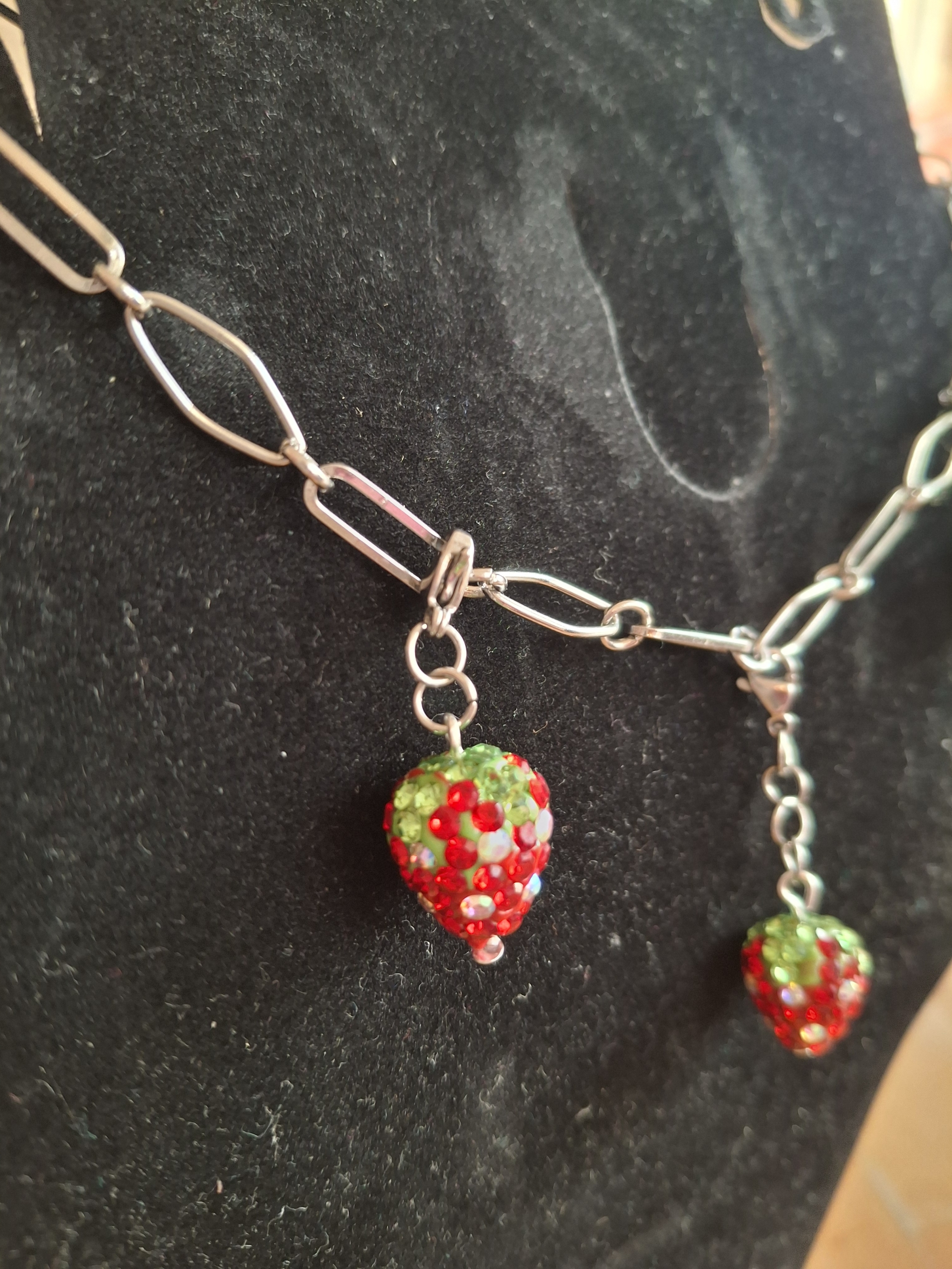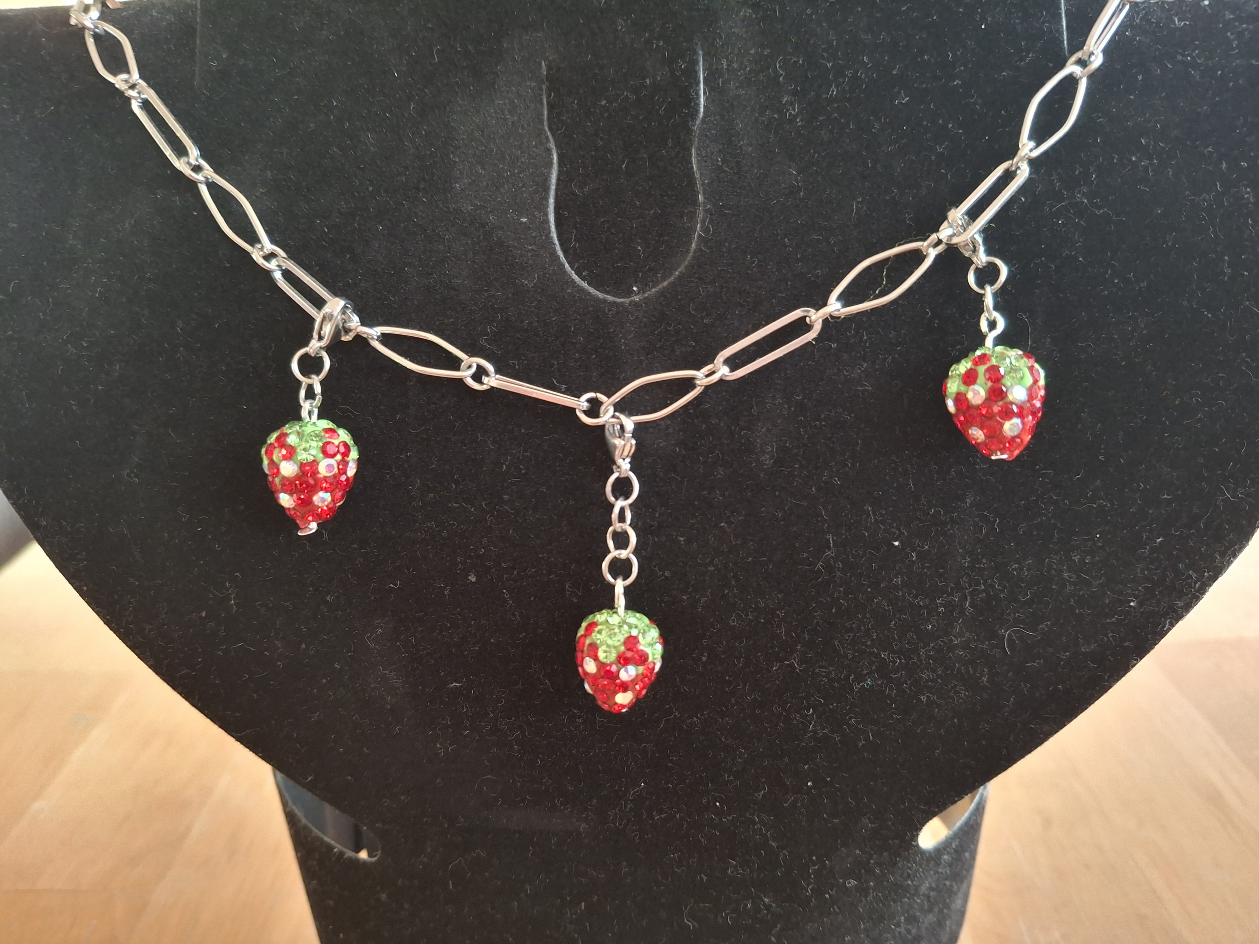 Kette aus 304 Edelstahl im Büroklammern Look. Die Länge der Kette beträgt 40 - 41 cm, kann bis zu ca 55 cm verlängert werden. An der Kette sind 3 strassbesetzte funkelnde Erdbeeren. Diese sind abnehmbar, sodass man die ein oder andere Erdbeere weglassen kann. Es sind sozusagen kleine Charms. Man kann natürlich auch komplett etwas anderes als Anhänger nehmen. Kommt inkl. Schmuckkarton.
