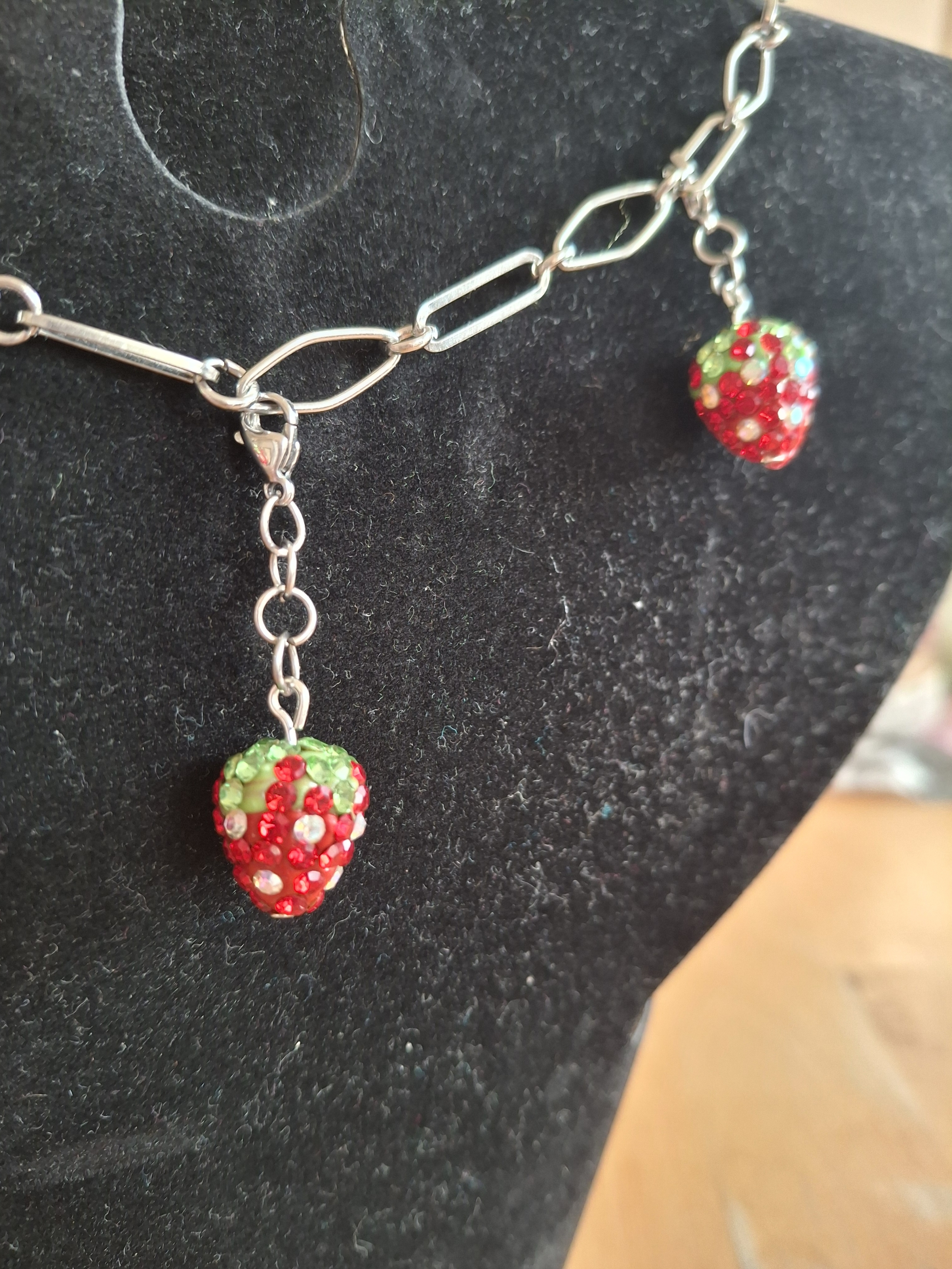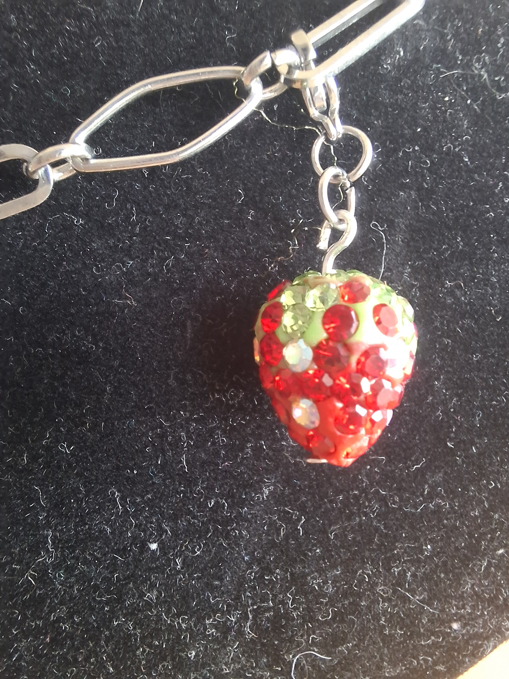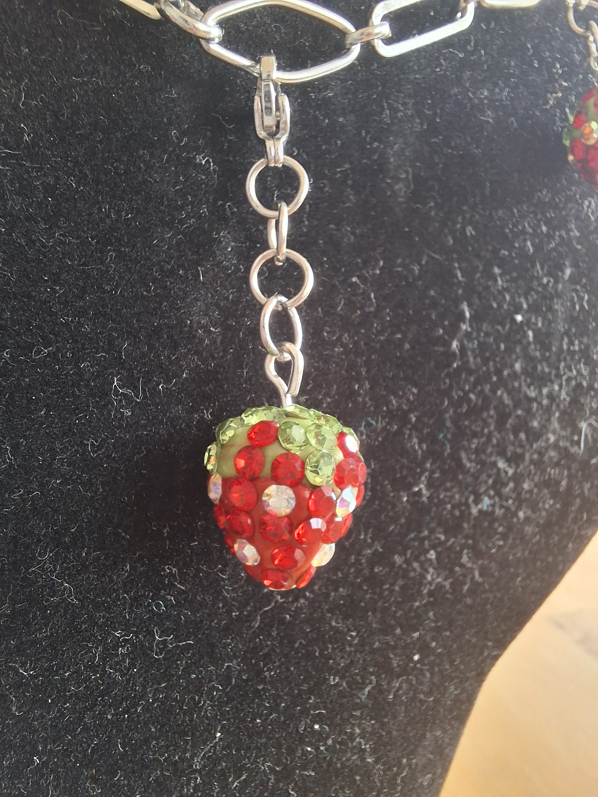 Kette aus 304 Edelstahl im Büroklammern Look. Die Länge der Kette beträgt 40 - 41 cm, kann bis zu ca 55 cm verlängert werden. An der Kette sind 3 strassbesetzte funkelnde Erdbeeren. Diese sind abnehmbar, sodass man die ein oder andere Erdbeere weglassen kann. Es sind sozusagen kleine Charms. Man kann natürlich auch komplett etwas anderes als Anhänger nehmen. Kommt inkl. Schmuckkarton.