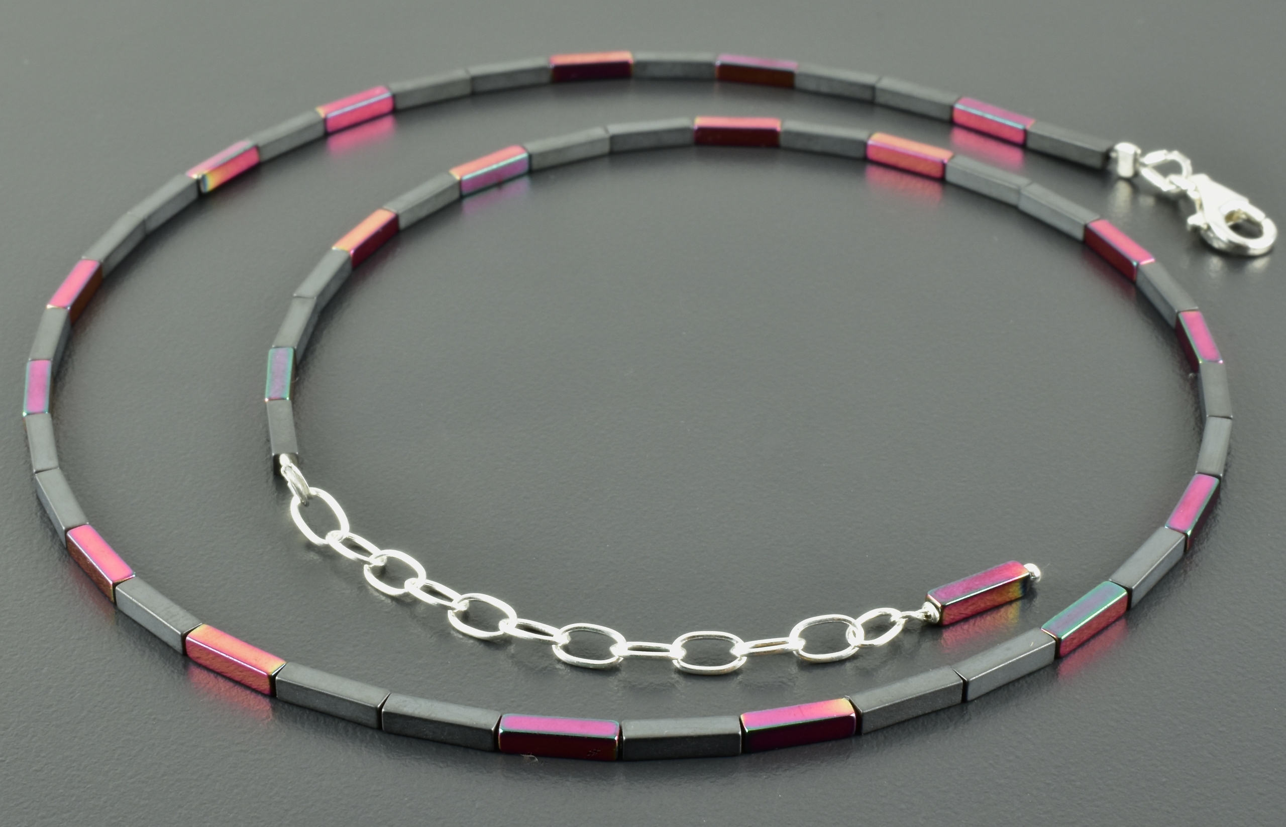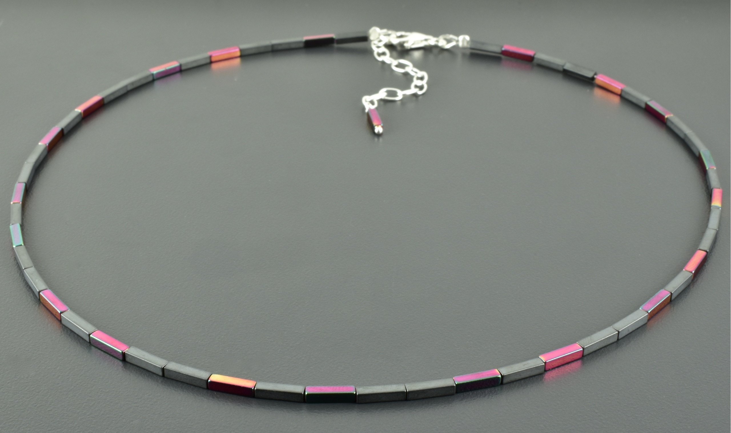 Die matt grauen Hämatitrechtecke wechseln sich ab mit Rechtecken, die durch Galvanisieren in einem pink-lila-orange erscheinen. Die meisten Steine sind auf der einen Seite pink/rot mit grün, ein paar haben einen orangroten Touch. Auf jeden Fall sieht es immer etwas anders aus, je nachdem welche Seite gerade zu sehen ist.