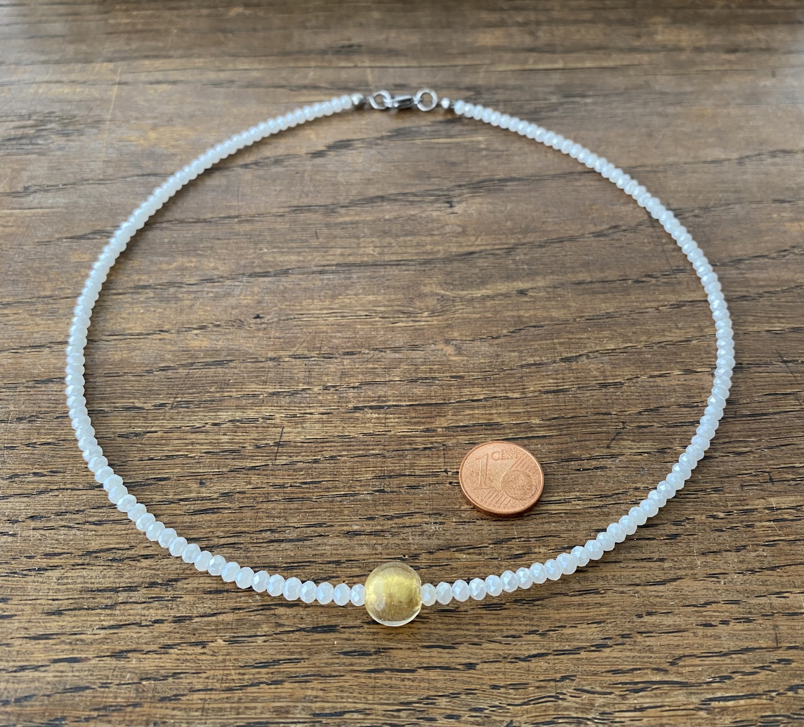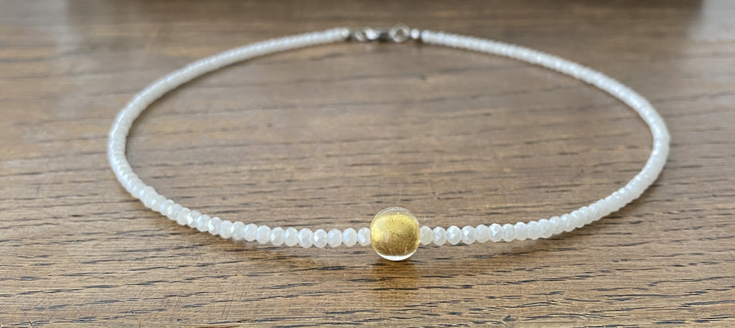 Meine Kette ist handgemacht und besteht aus glitzernden facettierten Glasrondellen in weiß sowie einer mittig angeordneten Muranoperle mit Blattgold. Die Muranoperle hat einen Durchmesser von 10mm. Die 46cm lange Kette ist aufgezogen auf einem nylonummantelten Schmuckdraht und wird verschlossen mit einem Karabiner aus Edelstahl.