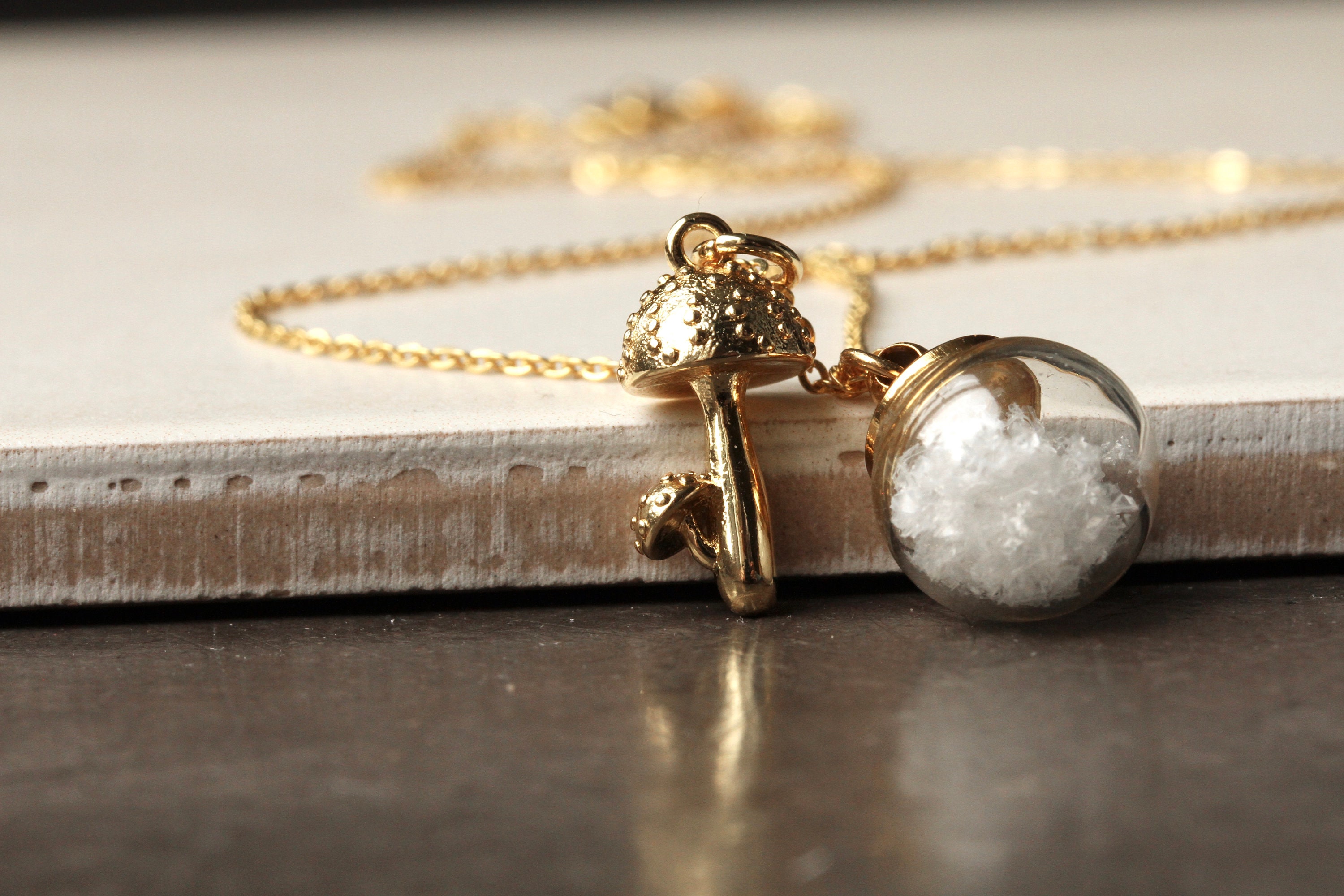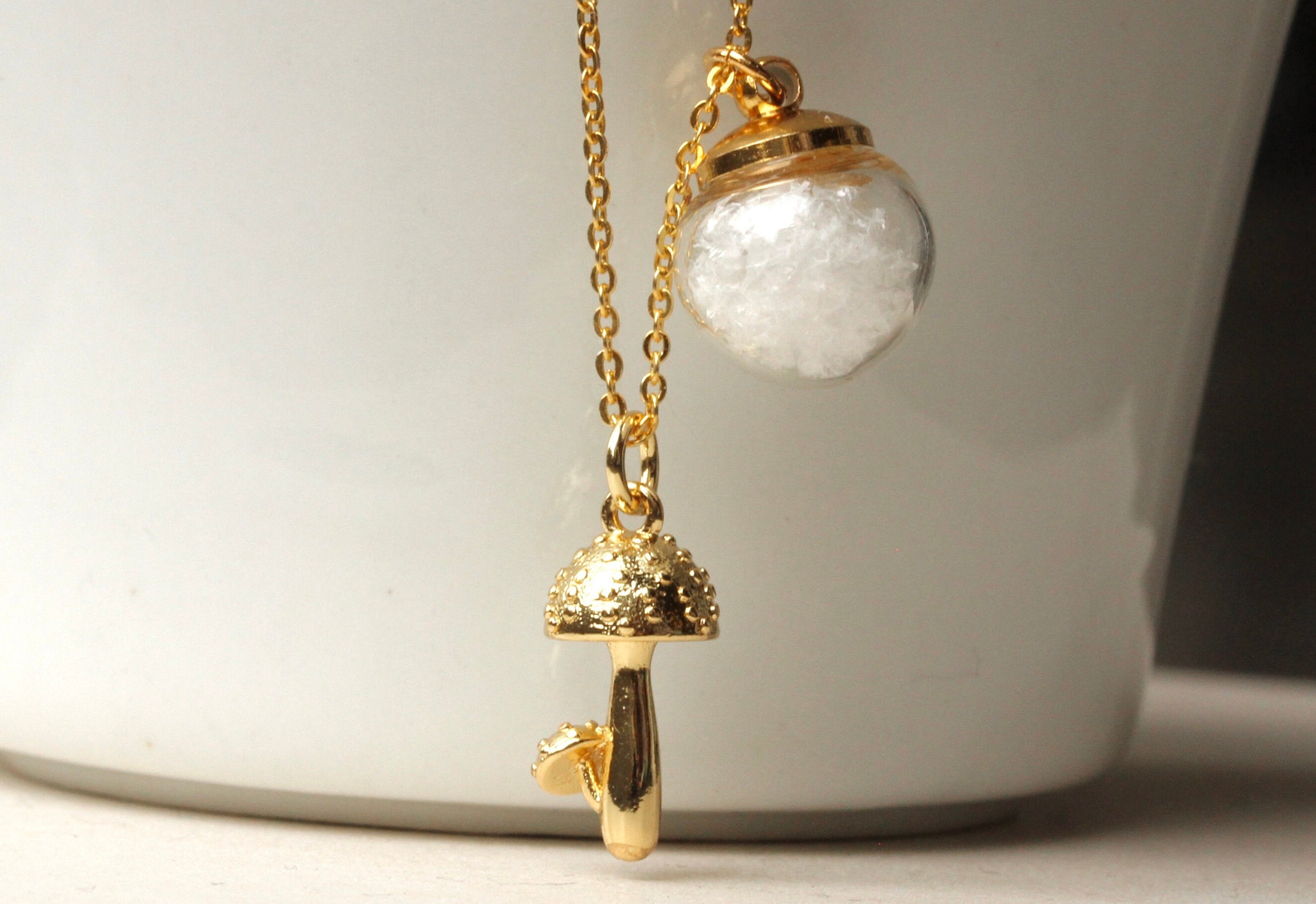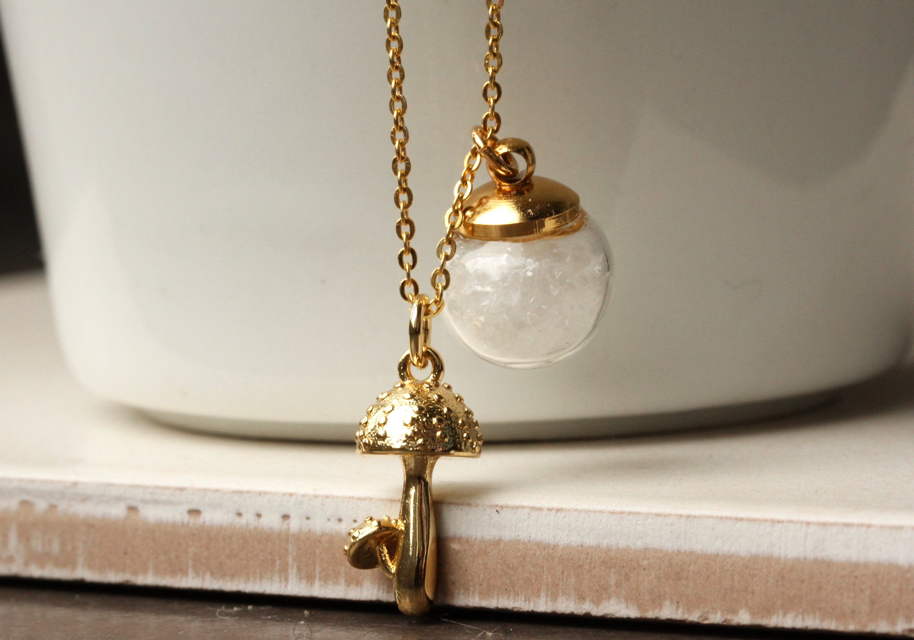 An einer vergoldeten Sterling Silber Kette baumelt ein kleiner vergoldeter Pilz, kombiniert mit einer kleinen Glaskugel voller künstlicher Schneepartikel, die bei jeder Bewegung hin- und herwirbeln.