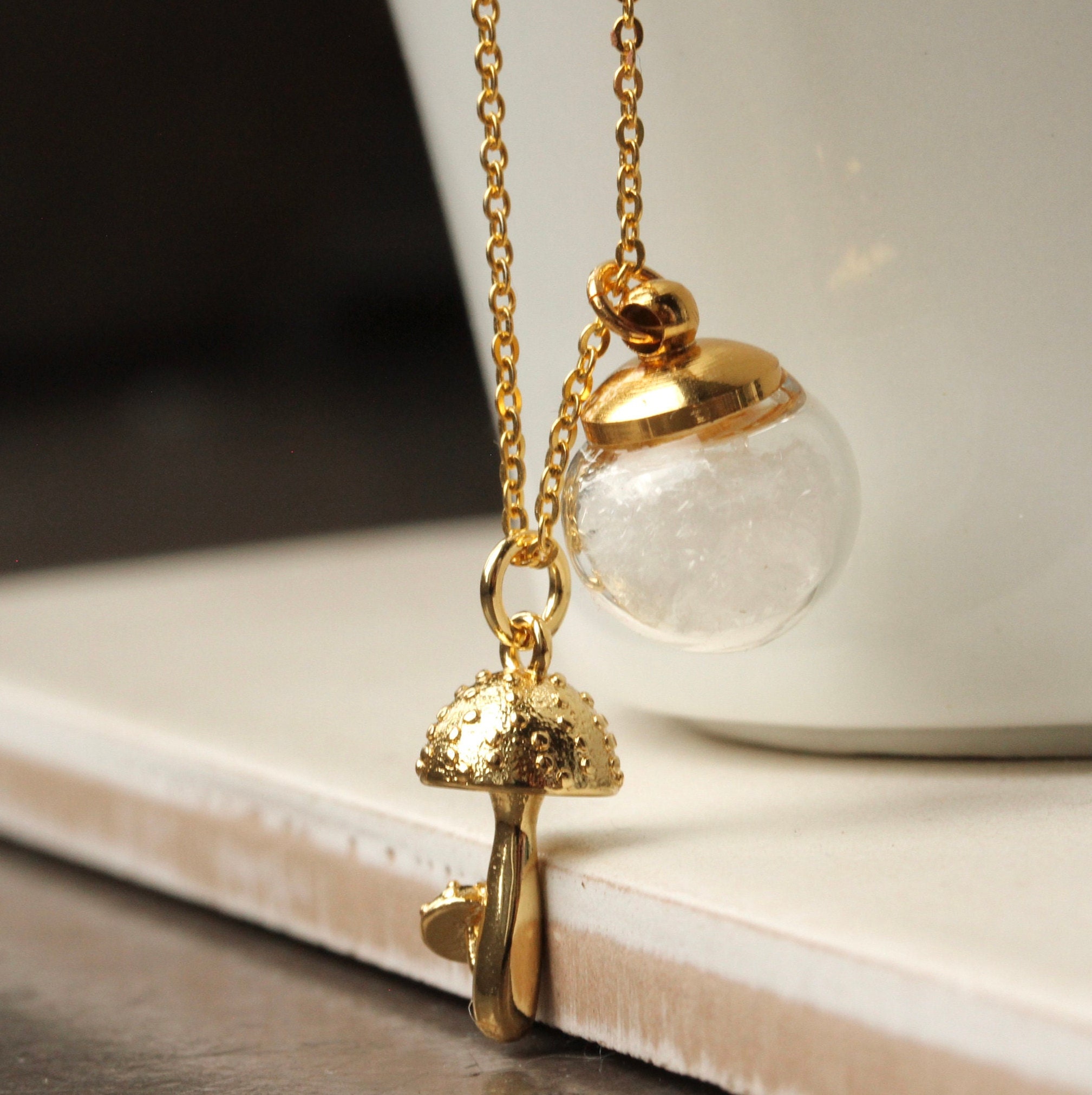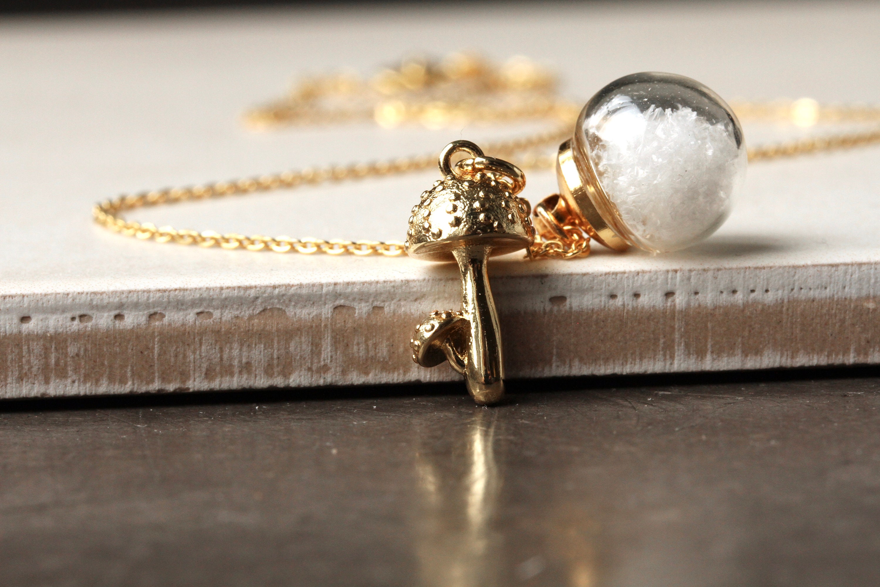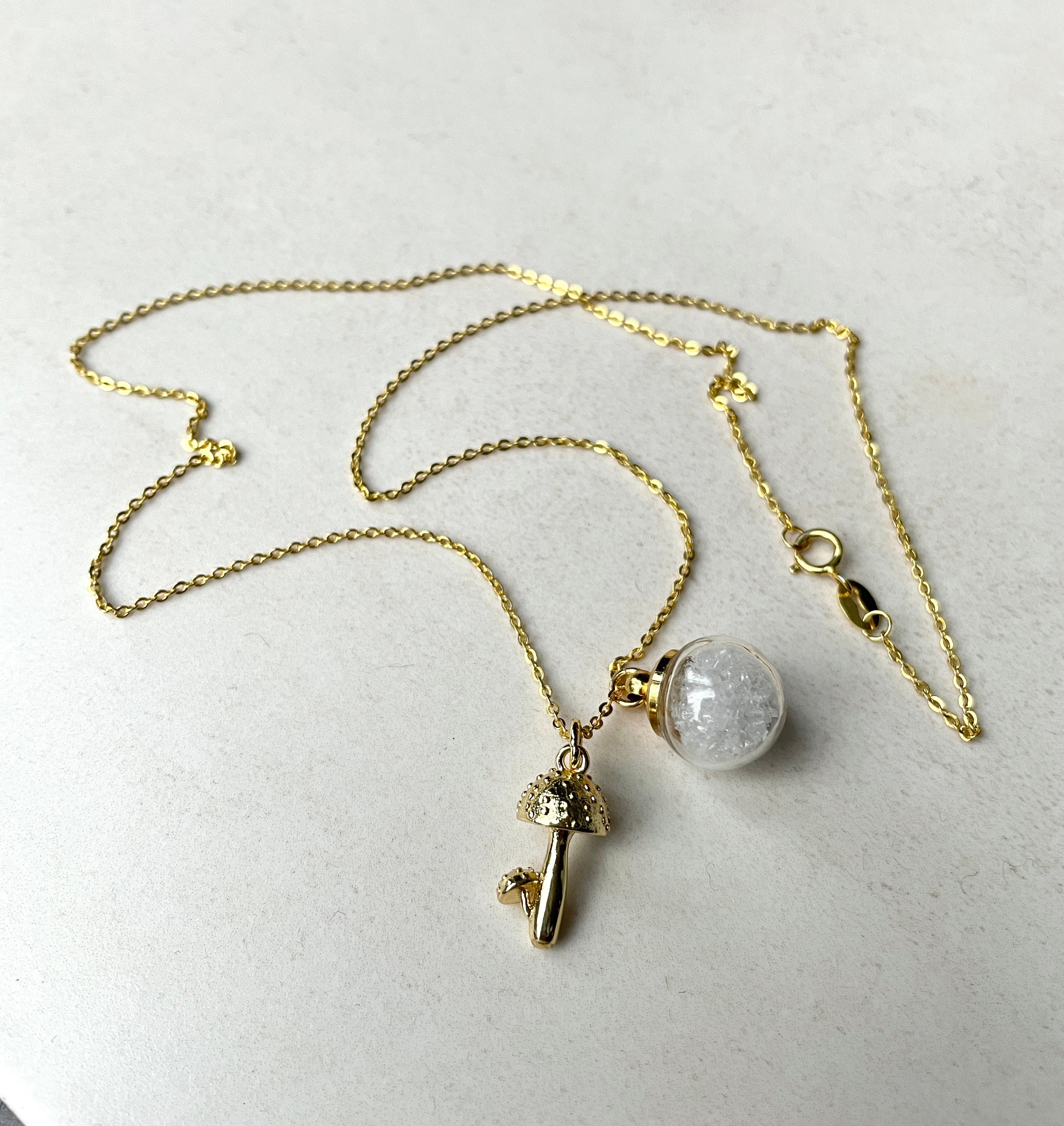 An einer vergoldeten Sterling Silber Kette baumelt ein kleiner vergoldeter Pilz, kombiniert mit einer kleinen Glaskugel voller künstlicher Schneepartikel, die bei jeder Bewegung hin- und herwirbeln.