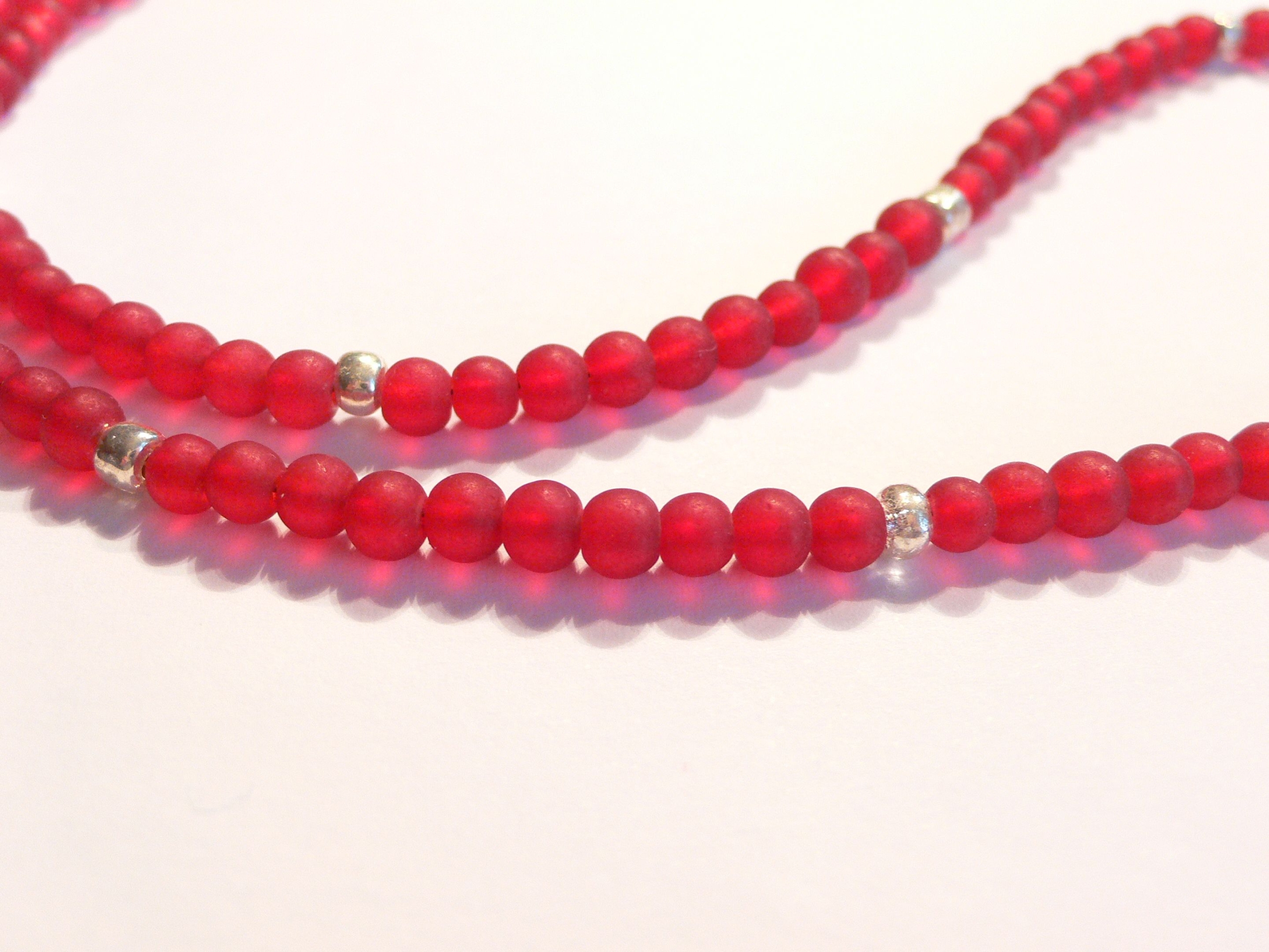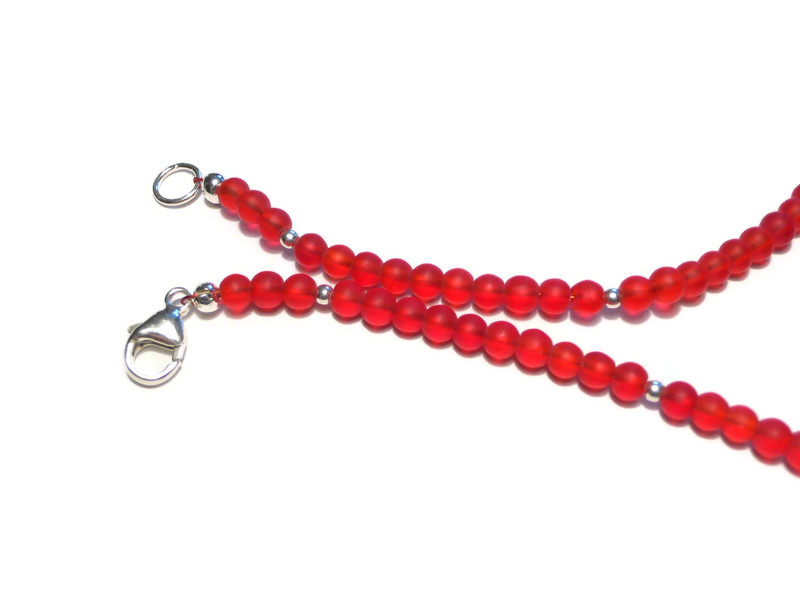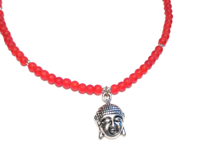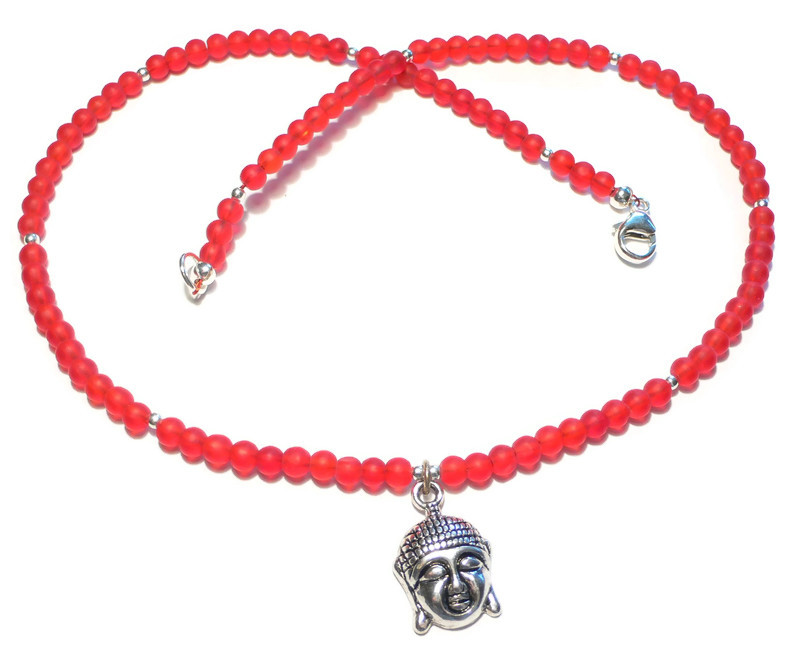Diese Kette habe ich aus 4mm großen roten matten Glasperlen gefertigt. Mittig hängt ein silberfarbener Buddhaanhänger (2cm mit Öse). Zwischen den roten Perlen sitzen kleine silberfarbene Metallperlen zur Auflockerung.