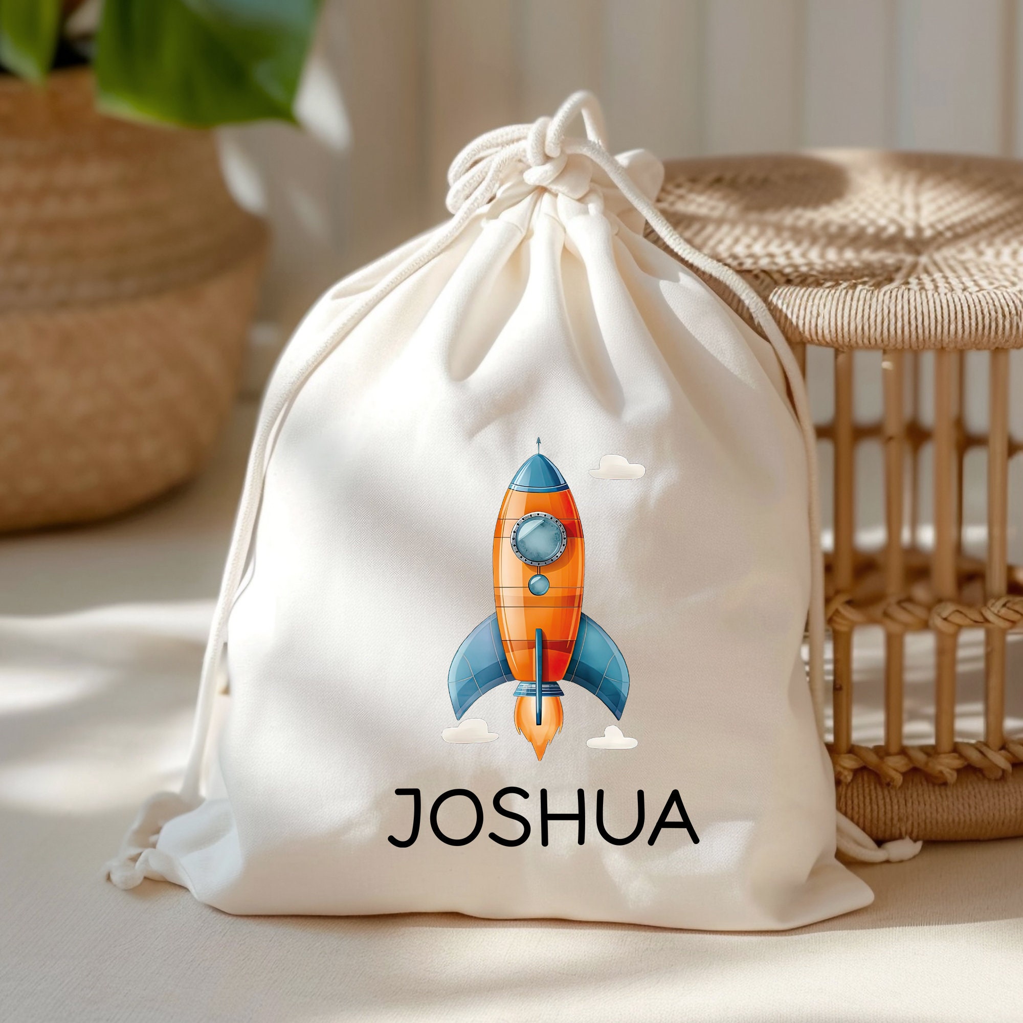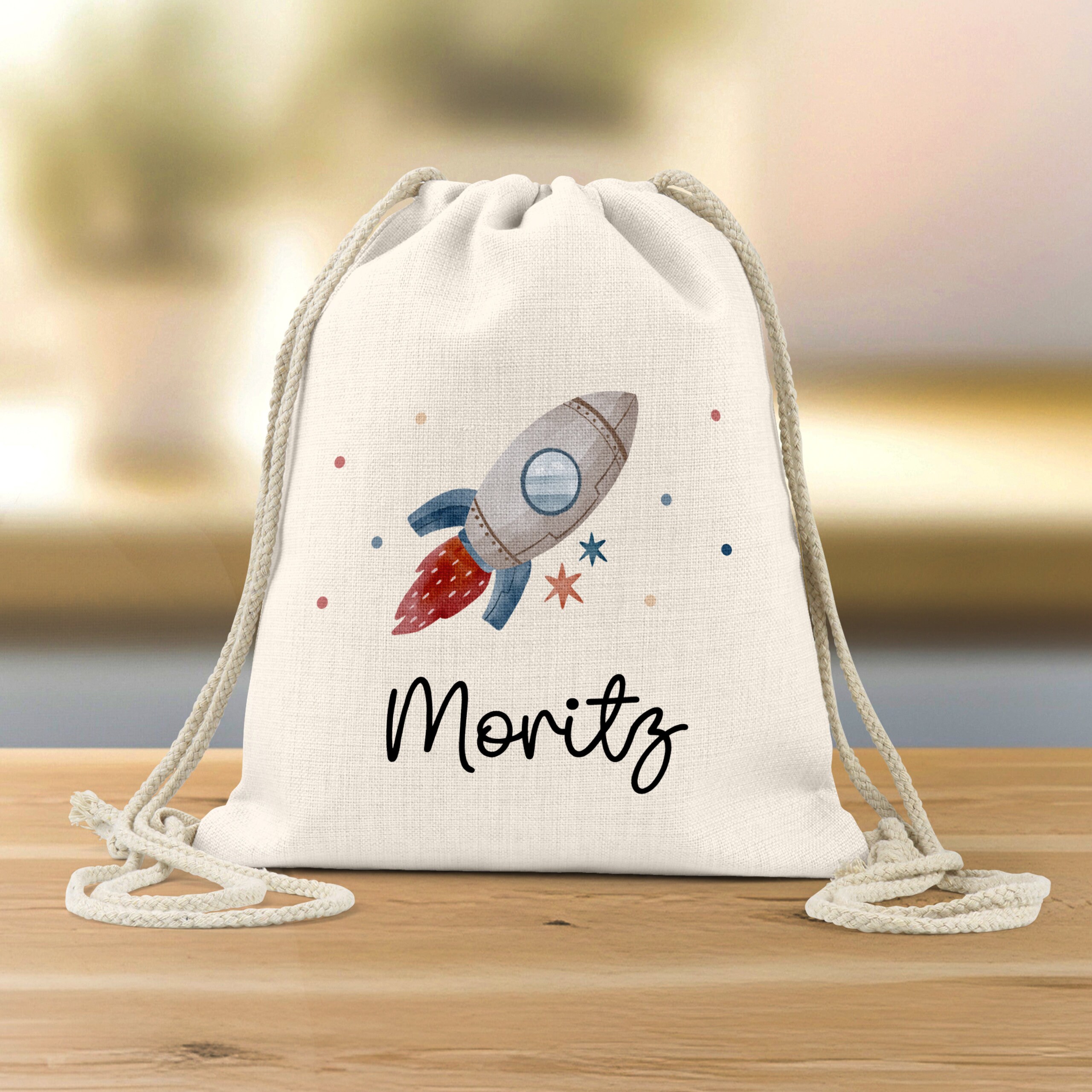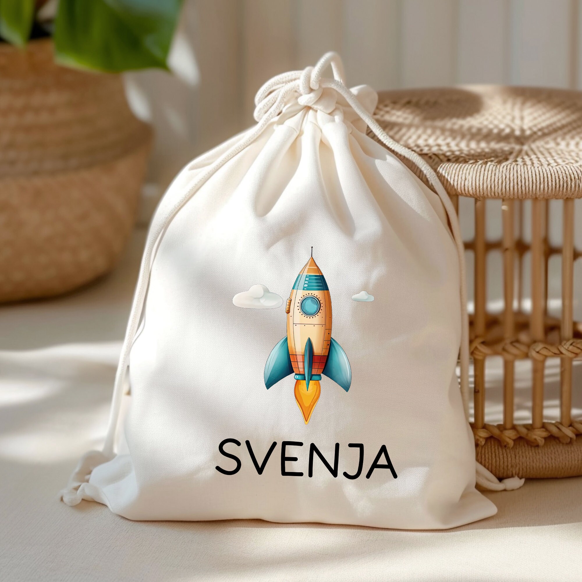 Der personalisierte Turnbeutel für Kinder ist vielseitig einsetzbar, besteht aus robuster Bio-Baumwolle und ist ein treuer Begleiter für unsere Kleinen. Er ist mit einer tollen Rakete und dem Namen des Kindes bedruckt.
