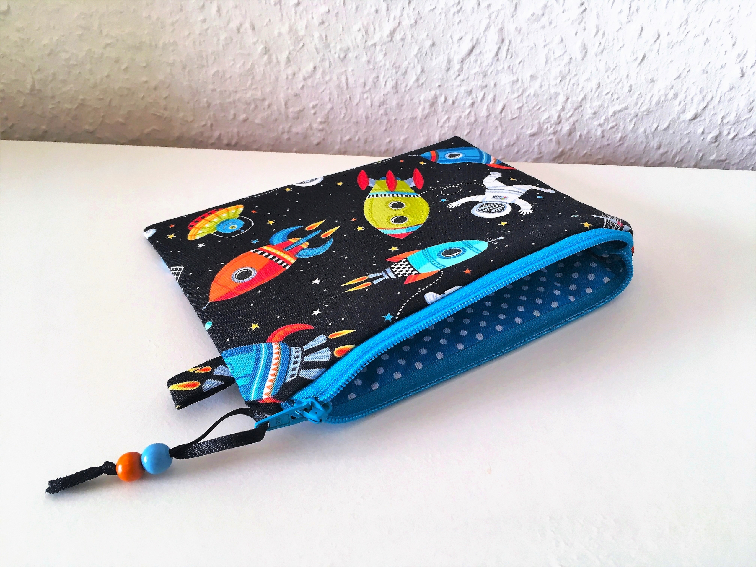 Der blaue Reißverschluß wurde mit einem Bändchen und zwei Holzperlen verziert.