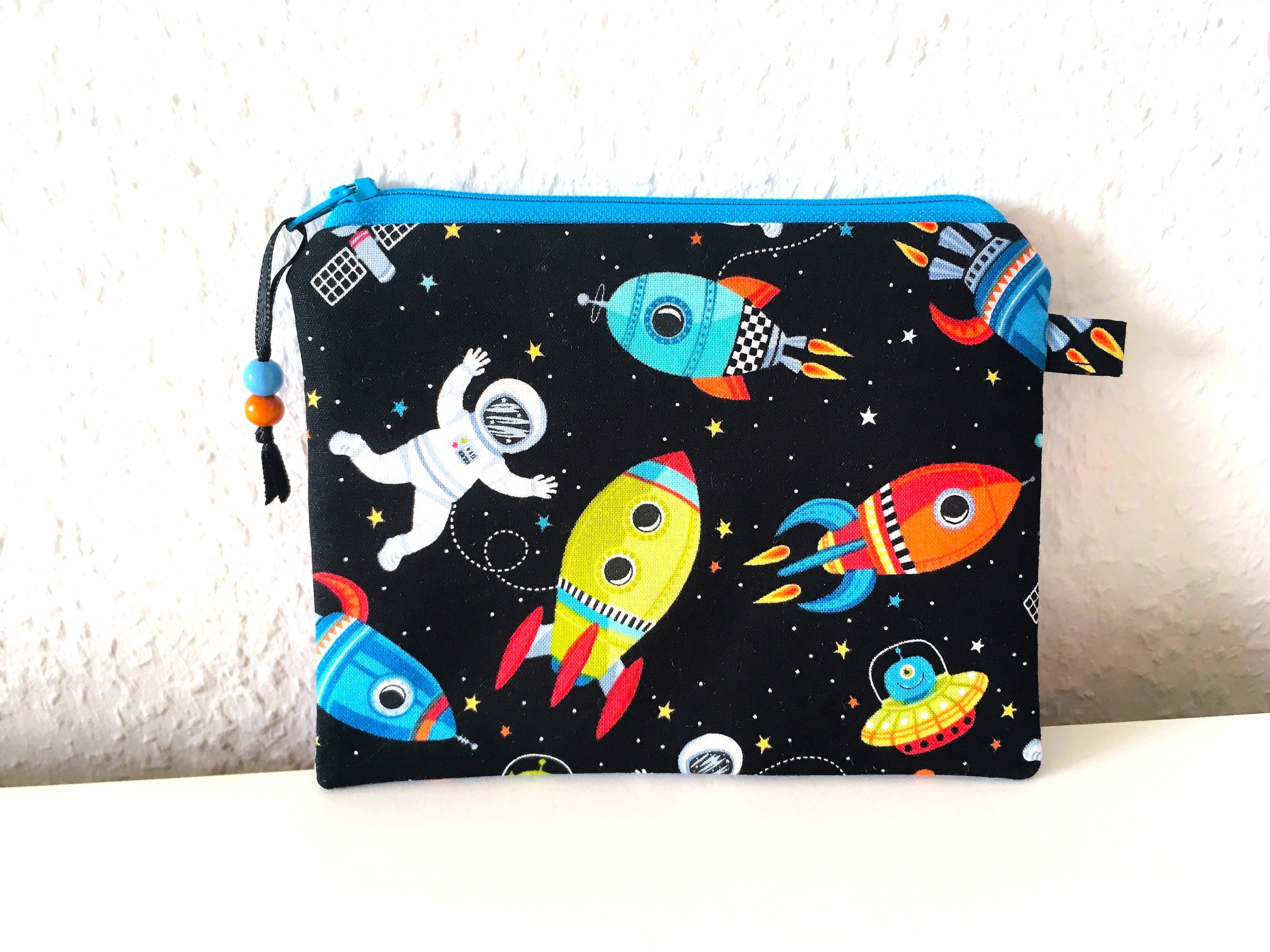 Die Tasche besteht aus schwarzem Baumwollstoff mit Weltallmotiven und wurde mit Vlies verstärkt.