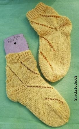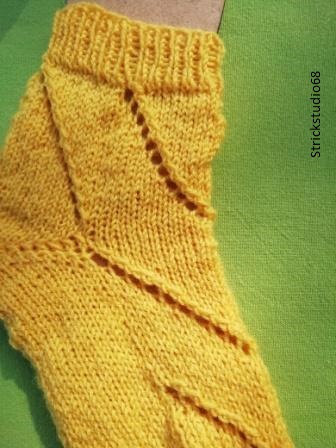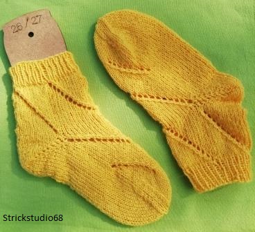 Die Socken haben ein Lochmuster und die Farbe ist gelb.