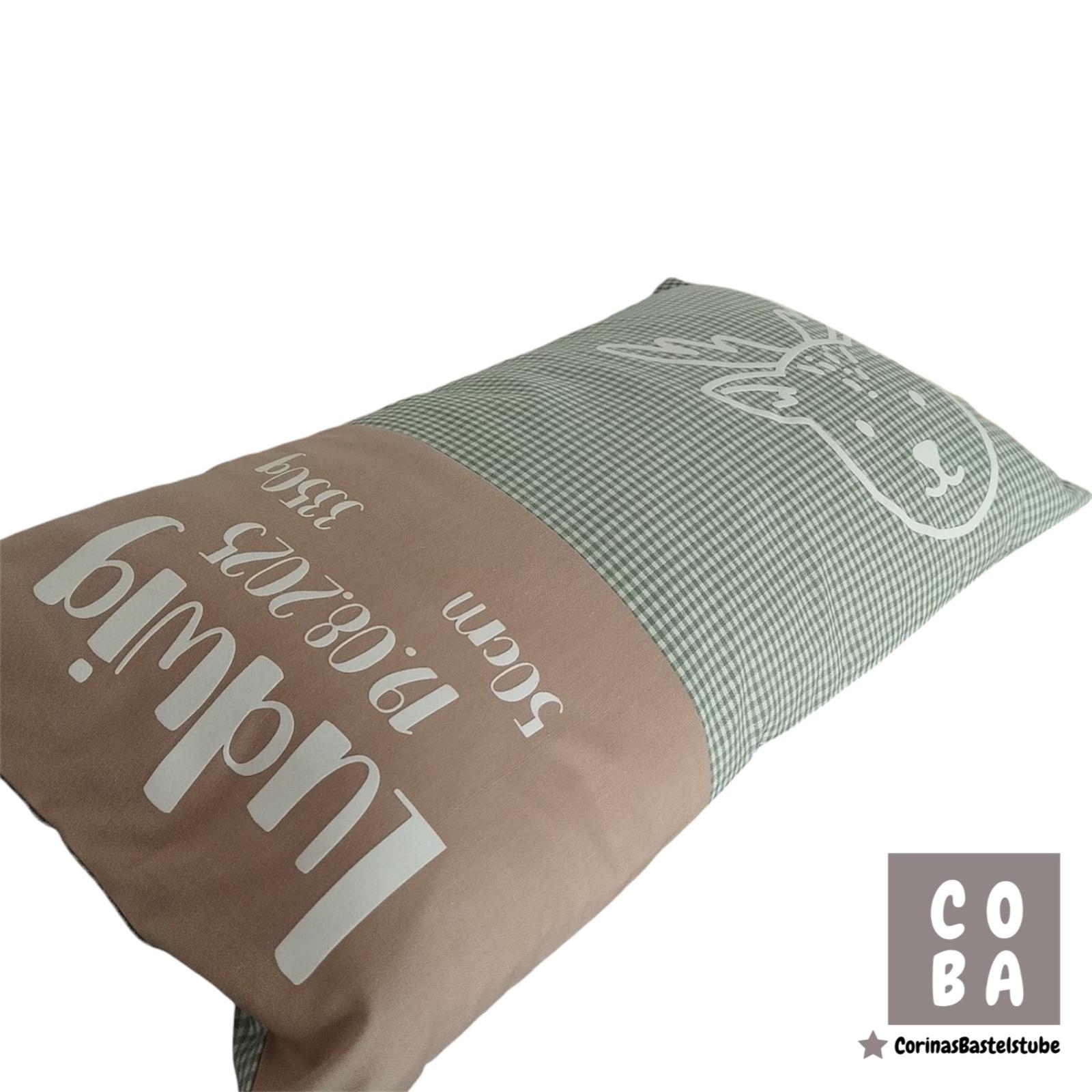 Der Preis bezieht sich auf eine Kissenhülle (ohne Inlett) mit Wunschname/Daten und Hotelverschluss in der Größe 30 * 50 cm