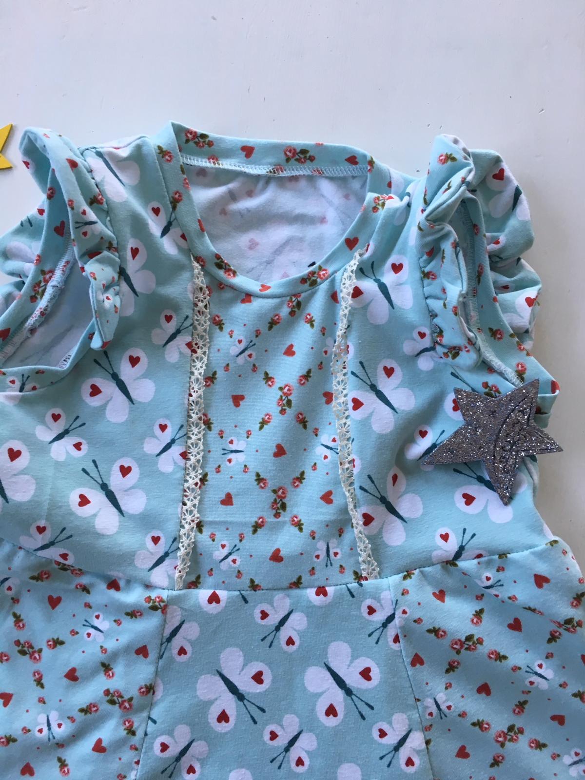 Das Kleid ist mit Jersey Stoff genäht und schwingt wunderbar wenn die süße Maus tanzt oder läuft. Die Flügelärmel machen das Kleid zu etwas Besonderem. Die Grundfarbe ist mint, die beiden Stoffe ergänzen sich in ihren Mustern ganz entzückend.
