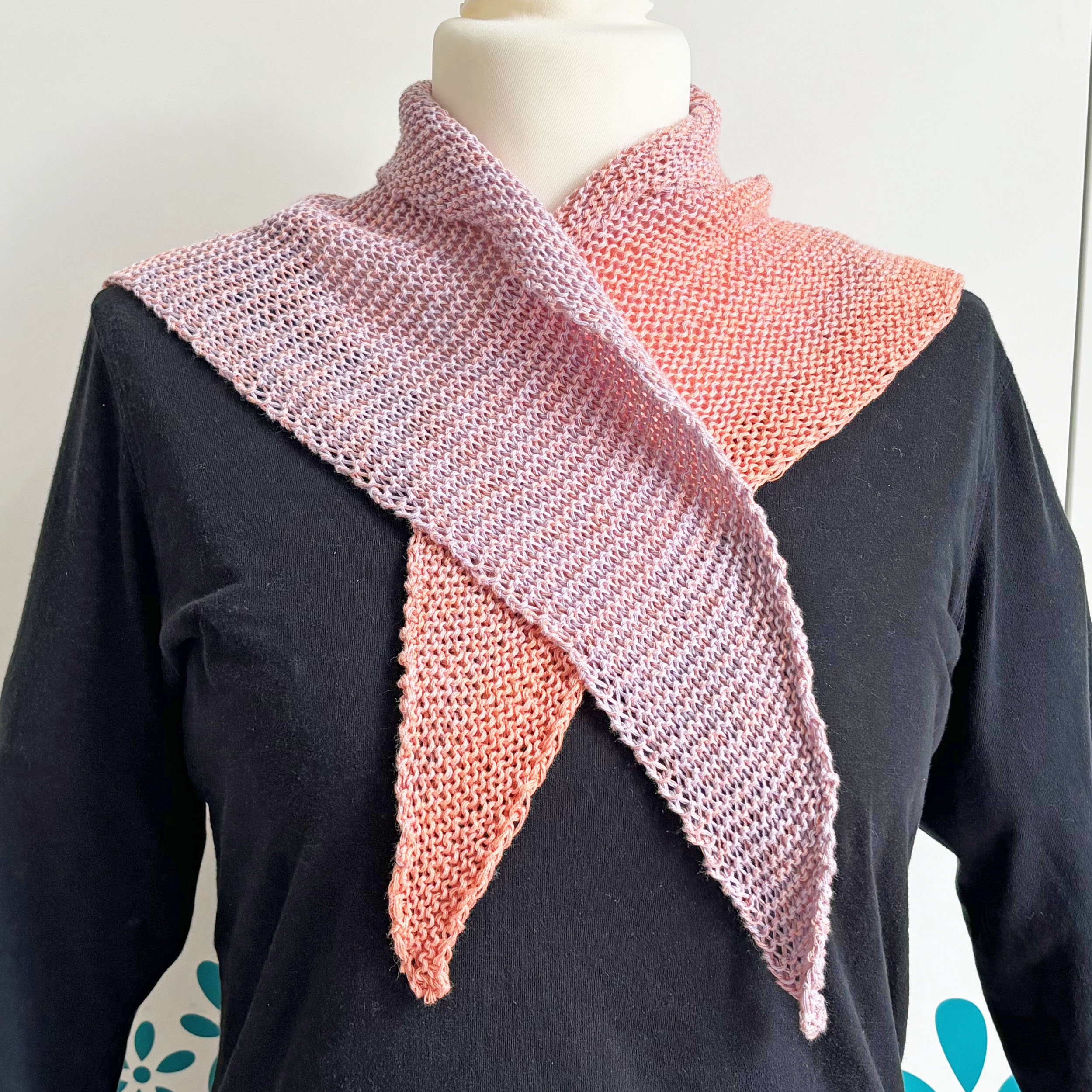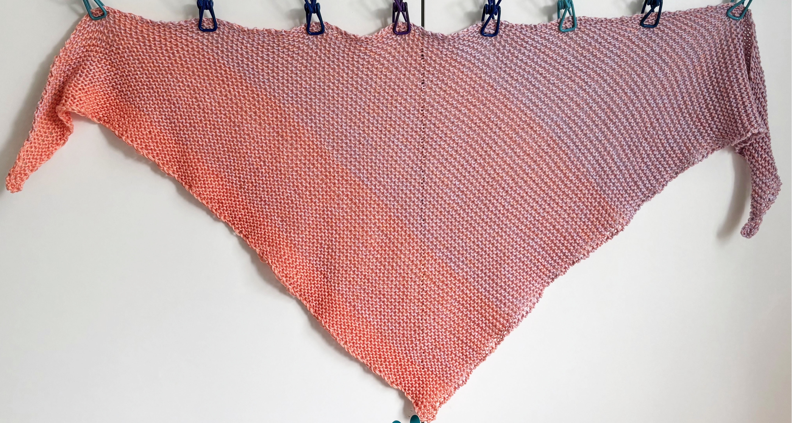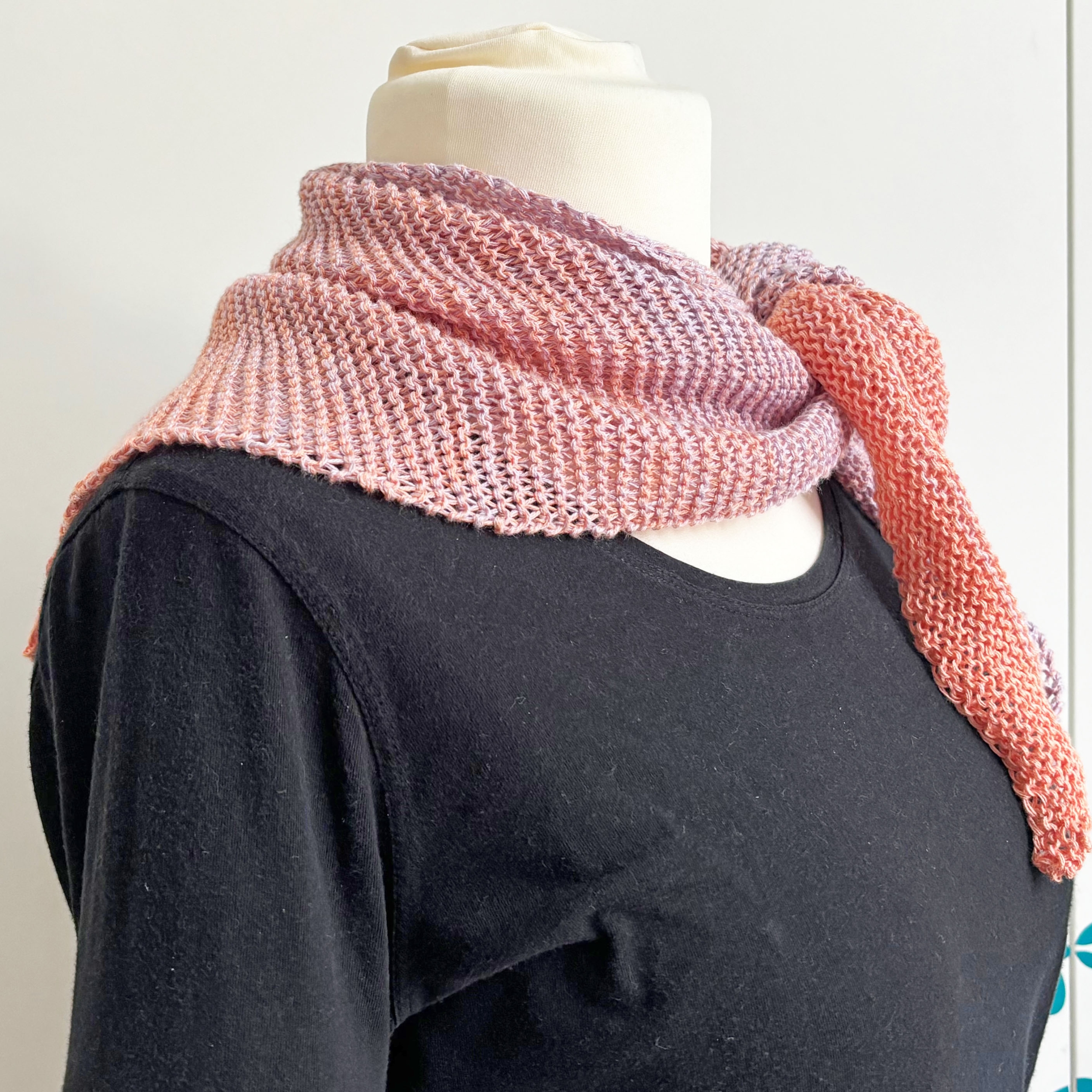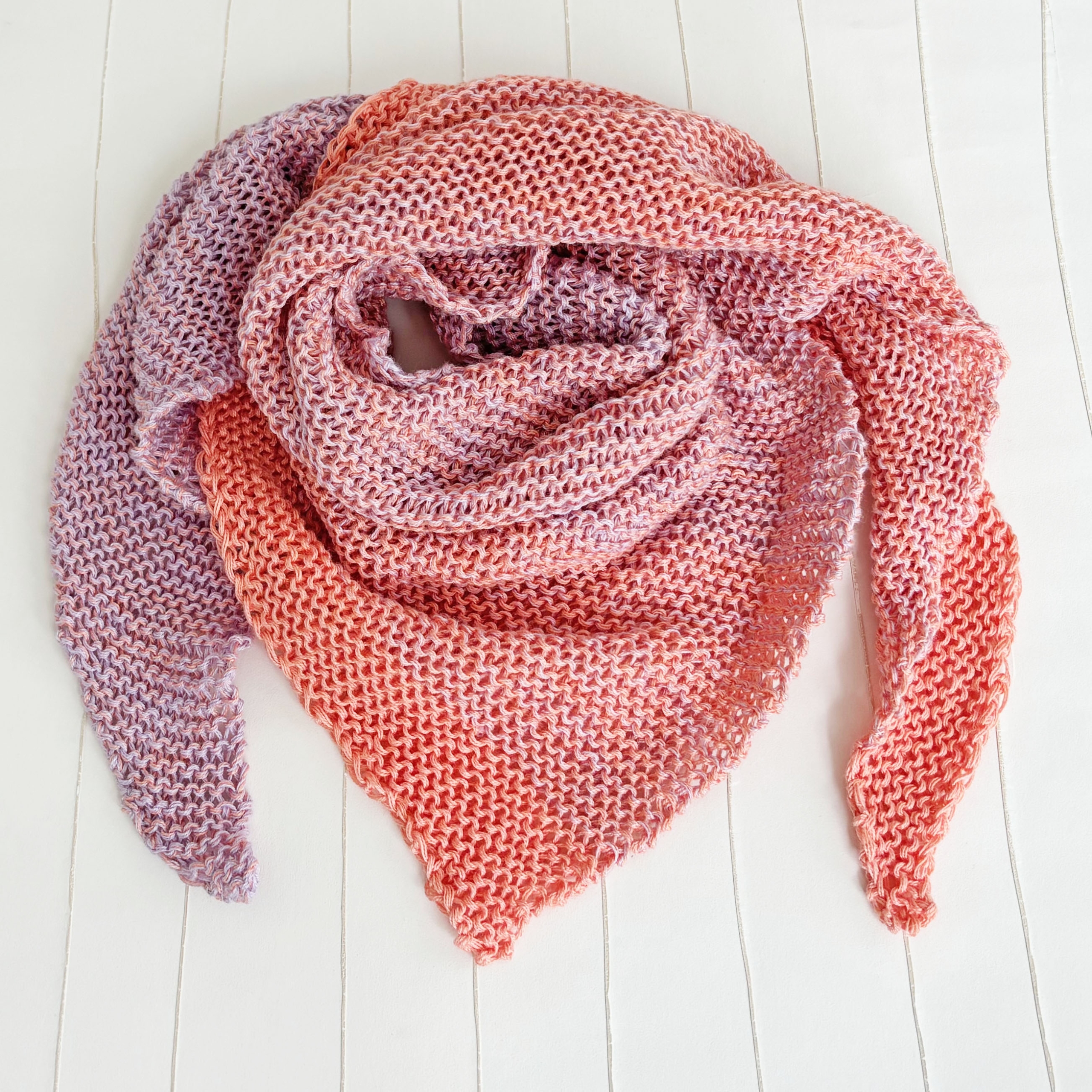 Kleines asymmetrisches Dreieckstuch aus Verlaufsgarn in Apricot und zartem Lila, der schöne Verlauf ergibt sich direkt aus dem Knäuel. Das Tuch wurde krausrechts gestrickt.