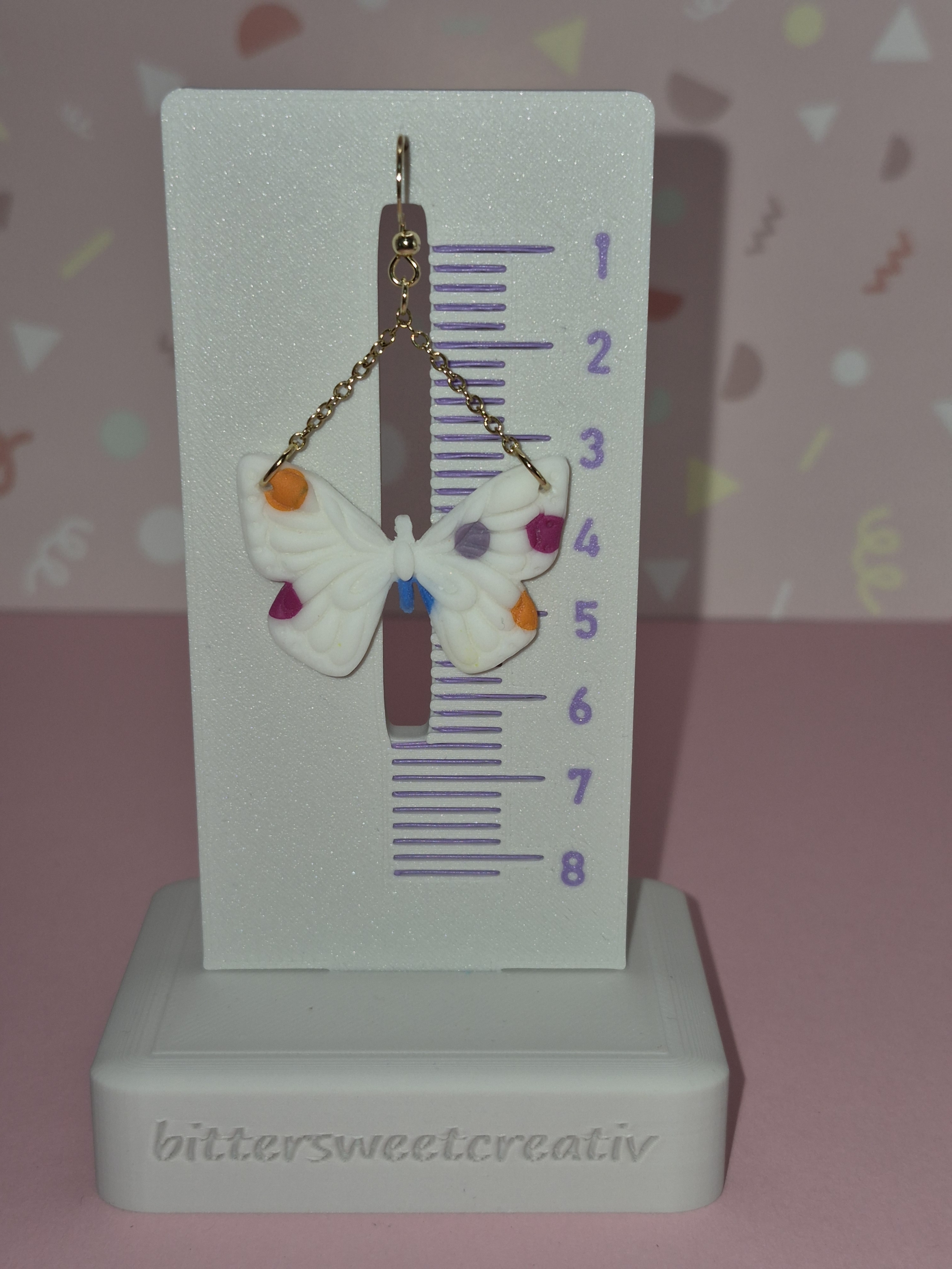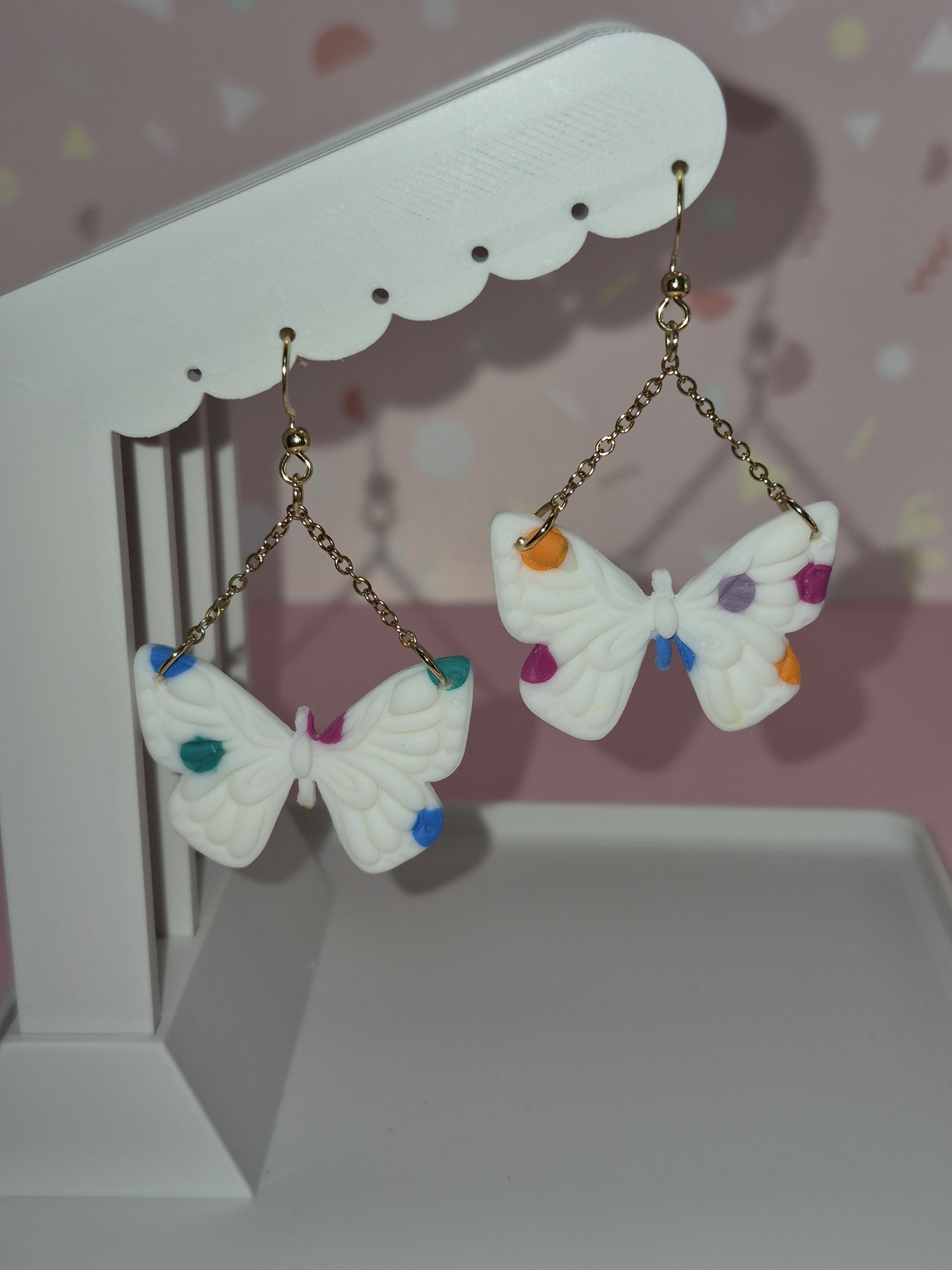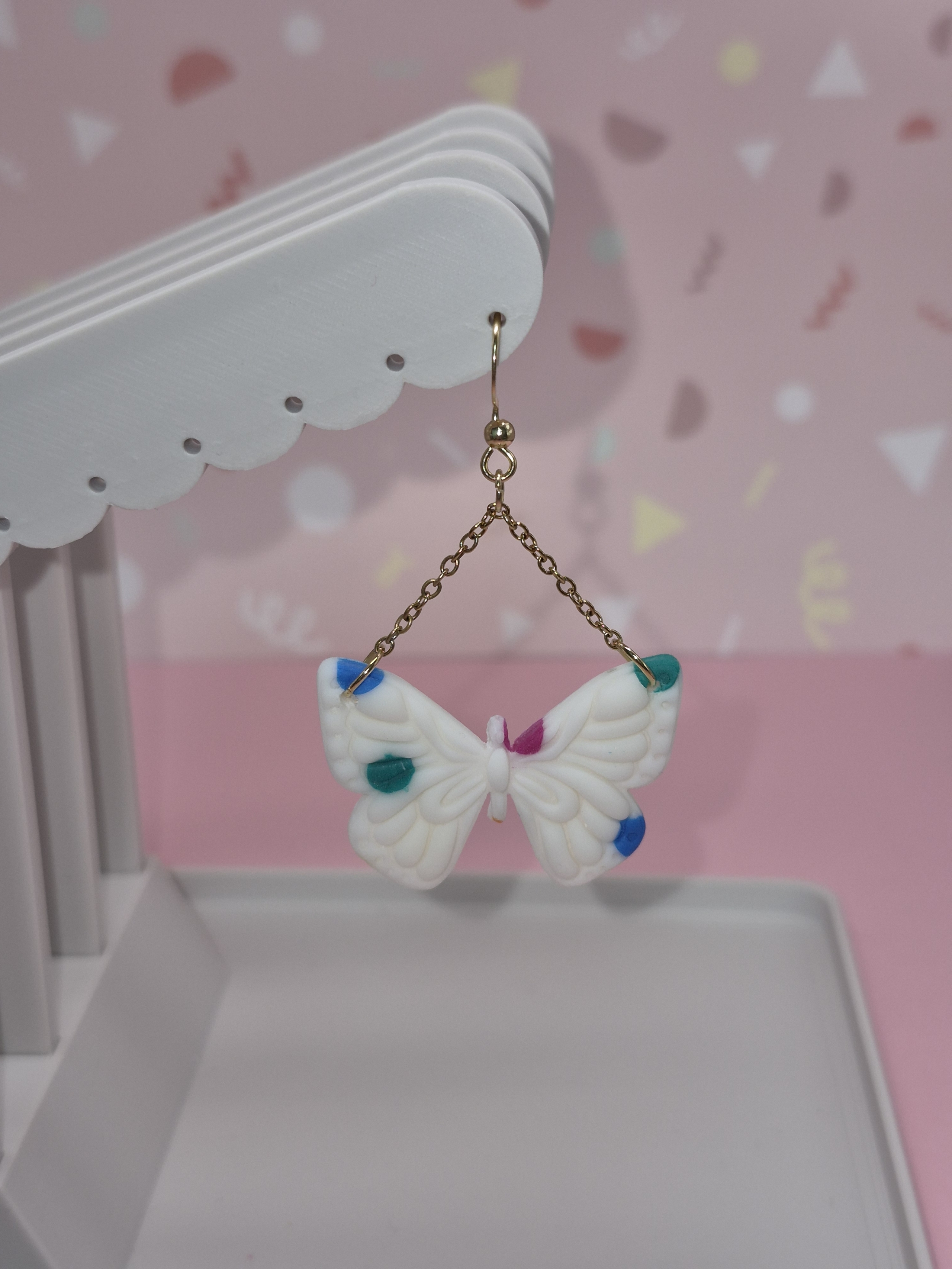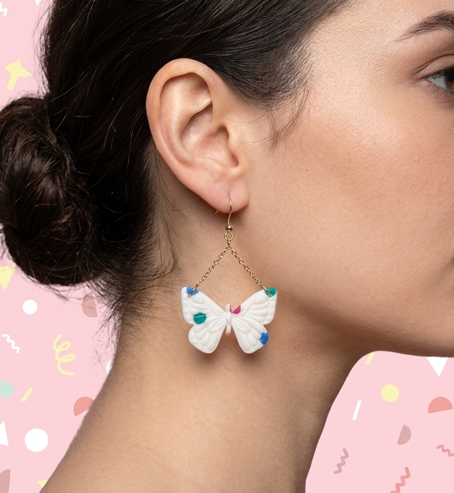Bringen Sie Farbe in Ihren Alltag! Diese charmanten Ohrhänger kombinieren ein klassisches Schmetterlings-Motiv mit einem modernen, künstlerischen Punkt-Design. Ein absolutes Must-have für alle, die Schmuck mit Charakter und einer Prise Fröhlichkeit lieben.