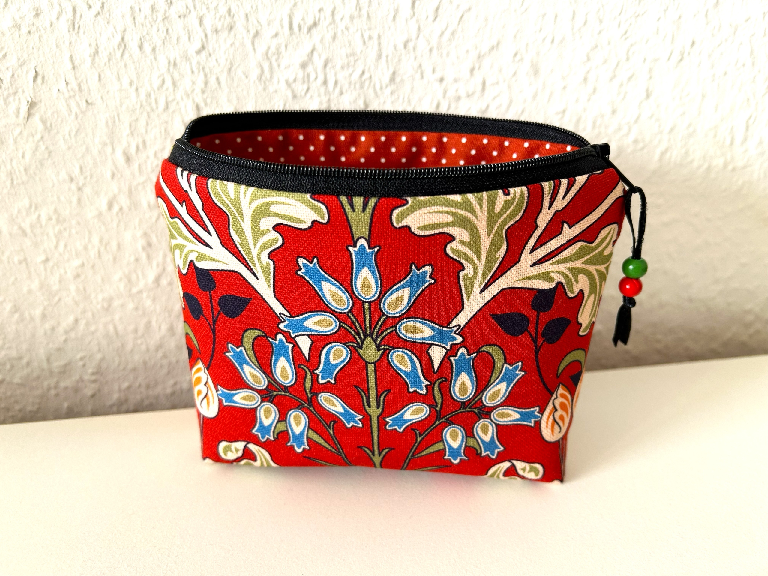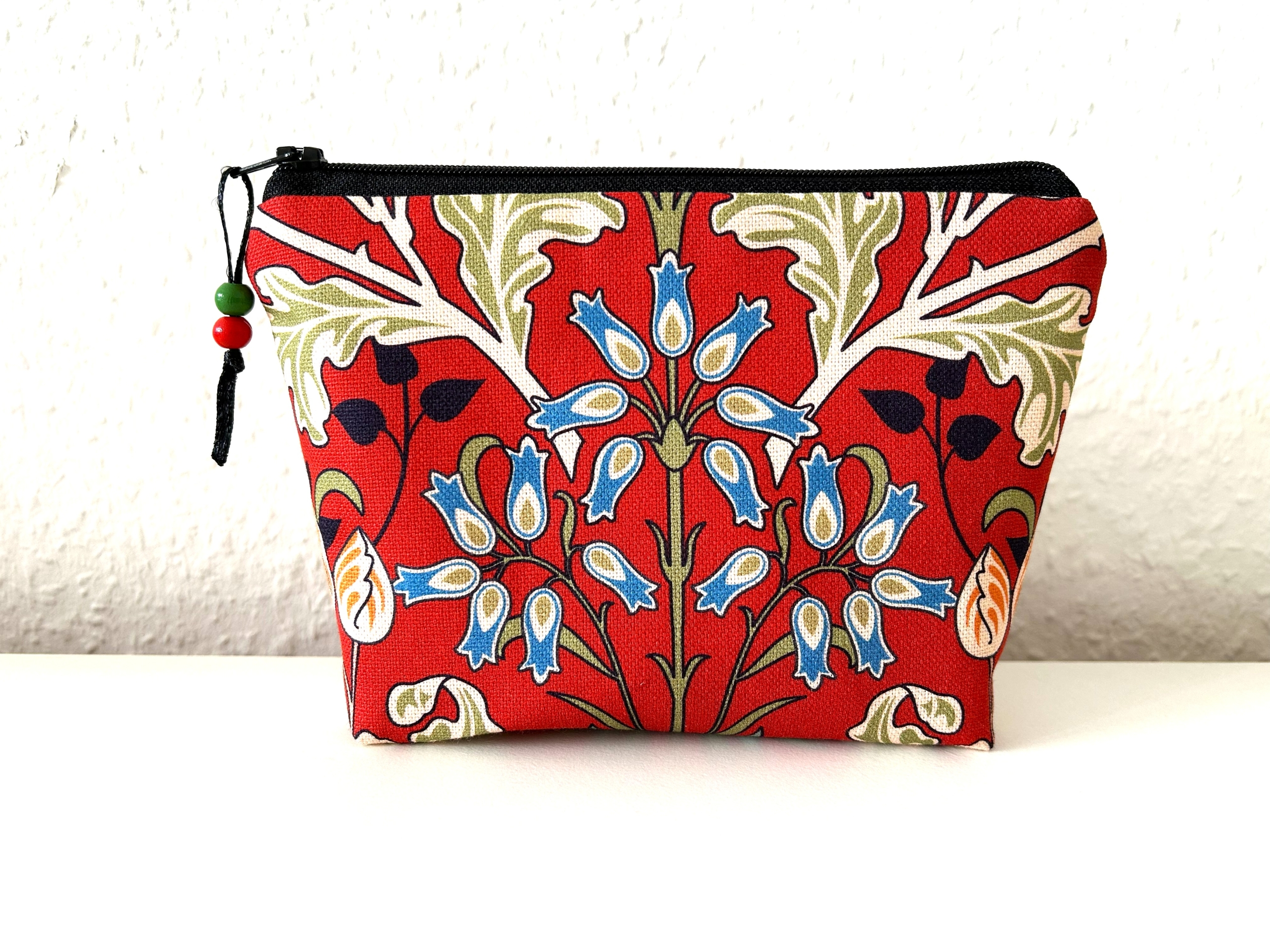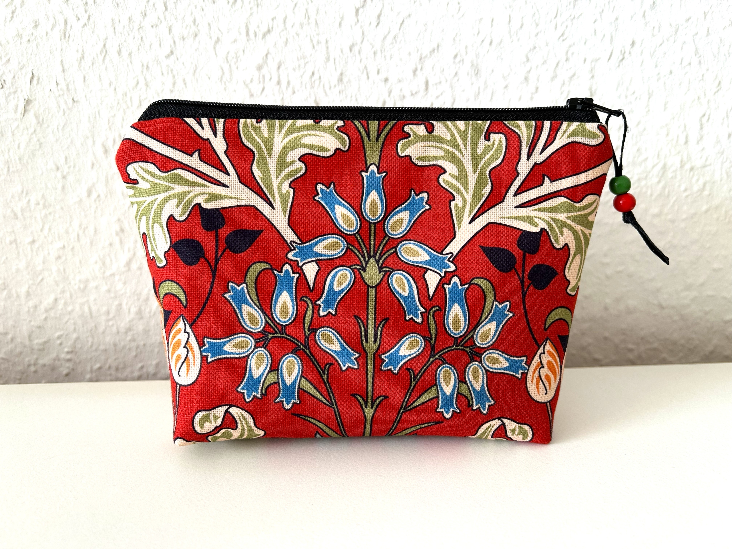 Schöne kleine Kosmetiktasche aus Baumwollstoff in dunkelrot mit Blumenmotiv.